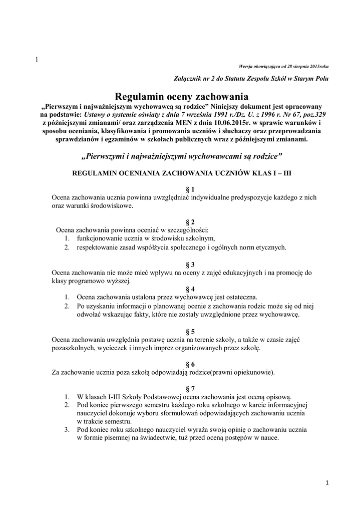 1 Wersja obowiązująca od 28 sierpnia 2015roku Załącznik nr 2 do Statutu Zespołu Szkół w Starym Polu Regulamin oceny zachowania „Pierwszym i najważniejszym wychowawcą są rodzice” Niniejszy dokument jest opracowany na podstawie: Ustawy o systemie oświaty z dnia 7 września 1991 r./Dz. U. z 1996 r. Nr 67, poz.329 z późniejszymi zmianami/ oraz zarządzenia MEN z dnia 10.06.2015r. w sprawie warunków i sposobu oceniania, klasyfikowania i promowania uczniów i słuchaczy oraz przeprowadzania sprawdzianów i egzaminów w szkołach publicznych wraz z późniejszymi zmianami. „Pierwszymi i najważniejszymi wychowawcami są rodzice” REGULAMIN OCENIANIA ZACHOWANIA UCZNIÓW KLAS I – III §1 Ocena zachowania ucznia powinna uwzględniać indywidualne predyspozycje każdego z nich oraz warunki środowiskowe. §2 Ocena zachowania powinna oceniać w szczególności: 1. funkcjonowanie ucznia w środowisku szkolnym, 2. respektowanie zasad współżycia społecznego i ogólnych norm etycznych. §3 Ocena zachowania nie może mieć wpływu na oceny z zajęć edukacyjnych i na promocję do klasy programowo wyższej. §4 1. Ocena zachowania ustalona przez wychowawcę jest ostateczna. 2. Po uzyskaniu informacji o planowanej ocenie z zachowania rodzic może się od niej odwołać wskazując fakty, które nie zostały uwzględnione przez wychowawcę. §5 Ocena zachowania uwzględnia postawę ucznia na terenie szkoły, a także w czasie zajęć pozaszkolnych, wycieczek i innych imprez organizowanych przez szkołę. §6 Za zachowanie ucznia poza szkołą odpowiadają rodzice(prawni opiekunowie). 1. 2. 3. §7 W klasach I-III Szkoły Podstawowej ocena zachowania jest oceną opisową. Pod koniec pierwszego semestru każdego roku szkolnego w karcie informacyjnej nauczyciel dokonuje wyboru sformułowań odpowiadających zachowaniu ucznia w trakcie semestru. Pod koniec roku szkolnego nauczyciel wyraża swoją opinię o zachowaniu ucznia w formie pisemnej na świadectwie, tuż przed oceną postępów w nauce. 1 §8 Nauczyciele klas I-III odnotowują spostrzeżenia dotyczące zachowania uczniów w prowadzonych przez siebie w sposób dowolny zeszytach oraz w stosownych rubrykach dziennika lekcyjnego, uwzględniając rozwój społeczno-emocjonalny ucznia oraz elementy takie jak: 1. zachowanie bezpieczeństwa i zdrowia, 2. współdziałanie w grupie, 3. organizacja pracy własnej. §9 W celu otrzymania pozytywnej oceny opisowej zachowania, uczeń powinien sumiennie przestrzegać poniżej wymienionych norm porządkowych obowiązujących w szkole: 1. Punktualne przychodzenie na zajęcia. 2. Przebywanie na terenie szkoły i boisku szkolnym zgodnie z przyjętymi zasadami. 3. Przynoszenie wymaganych przez nauczyciela książek, zeszytów, pomocy naukowych, dzienniczków, usprawiedliwień, zwolnień, itp. 4. Zachowanie porządku i czystości w salach, na korytarzach, w toaletach, na boisku. 5. Dbanie o meble szkolne i inne wyposażenie szkoły oraz naprawianie ewentualnie wyrządzonych szkód. 6. Wyrażanie emocji w sposób akceptowany przez innych. 7. Włączanie się do działań organizowanych przez innych uczniów, nauczycieli. 8. Akceptowanie zasad współżycia w grupie. 9. Przychodzenie do szkoły w kamizelce szkolnej, a na uroczystości szkolne w stroju galowym. 10. Przestrzeganie przepisów bhp i p-poż. Zasady ustalania oceny zachowania ucznia i informowania o niej rodziców § 10 1. 2. 3. 4. 5. 6. Obowiązkiem wychowawcy klasy jest zapoznanie uczniów i ich rodziców z kryteriami i zasadami oceniania uczniów. W pierwszym tygodniu każdego roku szkolnego wychowawca przedstawia uczniom zasady ustalania oceny z zachowania, udziela wyjaśnień. Fakt ten jest odnotowywany w dzienniku lekcyjnym i własnoręcznym podpisem pod niniejszym dokumentem. Podczas zebrania organizacyjnego we wrześniu, wychowawca przedstawia rodzicom zasady i kryteria ustalania ocen zachowania uczniów. Rodzice/opiekunowie poprzez złożenie podpisu pod tym dokumentem potwierdzają zapoznanie się z Regulaminem Oceniania i Zachowania. Rodzic, który jest nieobecny na zebraniu, jest wzywany przez wychowawcę w celu zapoznania z obowiązującym regulaminem, a fakt ten odnotowuje się w dzienniku lekcyjnym i dokumentacji wychowawcy klasy Rodzic, który pomimo wezwania wychowawcy nie przybędzie do szkoły, po odnotowaniu tego faktu w dokumentacji jest uważany za skutecznie zapoznanego z regulaminem, który umieszczony jest także na stronie internetowej szkoły. Rodzice, którzy mimo wezwań nie kontaktują się z wychowawcą klasy tracą prawo do składania odwołań określonych w § 4 niniejszego Regulaminu. 2 § 11 Wychowawca ustala ocenę zachowania ucznia w terminie nie wcześniejszym niż 10 i nie późniejszym niż 5 dni przed posiedzeniem klasyfikacyjnej Rady Pedagogicznej, dokonując odpowiedniego wpisu do dziennika na podstawie: 1. własnych obserwacji, 2. opinii nauczycieli uczących w danej klasie innych przedmiotów lub prowadzących zajęcia dodatkowe. § 12 Pozostali nauczyciele oraz inni pracownicy szkoły, chcący mieć wpływ na ocenę zachowania ucznia, przekazują swoje informacje ustnie, bezpośrednio wychowawcy. Przed wystawieniem oceny klasyfikacyjnej śródrocznej i końcoworocznej wychowawca konsultuje proponowaną ocenę z innymi nauczycielami w formie pisemnej i wyniki konsultacji zachowuje w dokumentacji pracy wychowawcy. § 13 W trakcie zajęć zintegrowanych organizowanych na terenie szkoły i poza nią każdy nauczyciel klas I-III ocenia zachowanie dziecka mimiką, gestem, werbalnie oraz odpowiednimi symbolami, których znaczenie zostało szczegółowo wyjaśnione uczniom. § 14 Każdy nauczyciel klas I-III w porozumieniu z uczniami i rodzicami ma prawo do wypracowania własnego sposobu oceniania zachowania w postaci symboli, znaczków, pieczątek, kolorowych karteczek, które nie powinny mieć przełożenia na obowiązującą w klasach IV-VI skalę ocen zachowania. § 15 Wychowawca klasy informuje o