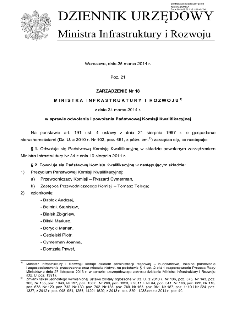 Elektronicznie podpisany przez Karolina DEMSKA Data: 2014.03.25 12:31:55 +01'00' DZIENNIK URZĘDOWY Ministra Infrastruktury i Rozwoju Warszawa, dnia 25 marca 2014 r. Poz. 21 ZARZĄDZENIE Nr 18 M I N I S T R A I N F R A S T R U K T U R Y I R O Z W O J U 1) z dnia 24 marca 2014 r. w sprawie odwołania i powołania Państwowej Komisji Kwalifikacyjnej Na podstawie art. 191 ust. 4 ustawy z dnia 21 sierpnia 1997 r. o gospodarce nieruchomościami (Dz. U. z 2010 r. Nr 102, poz. 651, z późn. zm.2)) zarządza się, co następuje: § 1. Odwołuje się Państwową Komisję Kwalifikacyjną w składzie powołanym zarządzeniem Ministra Infrastruktury Nr 34 z dnia 19 sierpnia 2011 r. § 2. Powołuje się Państwową Komisję Kwalifikacyjną w następującym składzie: 1) 2) Prezydium Państwowej Komisji Kwalifikacyjnej: a) Przewodniczący Komisji – Ryszard Cymerman, b) Zastępca Przewodniczącego Komisji – Tomasz Telega; członkowie: - Bablok Andrzej, - Belniak Stanisław, - Białek Zbigniew, - Bilski Mariusz, - Borycki Marian, - Cegielski Piotr, - Cymerman Joanna, - Domzała Paweł, 1) 2) Minister Infrastruktury i Rozwoju kieruje działem administracji rządowej – budownictwo, lokalne planowanie i zagospodarowanie przestrzenne oraz mieszkalnictwo, na podstawie § 1 ust. 2 pkt 1 rozporządzenia Prezesa Rady Ministrów z dnia 27 listopada 2013 r. w sprawie szczegółowego zakresu działania Ministra Infrastruktury i Rozwoju (Dz. U. poz. 1391). Zmiany teksu jednolitego wymienionej ustawy zostały ogłoszone w Dz. U. z 2010 r. Nr 106, poz. 675, Nr 143, poz. 963, Nr 155, poz. 1043, Nr 197, poz. 1307 i Nr 200, poz. 1323, z 2011 r. Nr 64, poz. 341, Nr 106, poz. 622, Nr 115, poz. 673, Nr 129, poz. 732, Nr 130, poz. 762, Nr 135, poz. 789, Nr 163, poz. 981, Nr 187, poz. 1110 i Nr 224, poz. 1337, z 2012 r. poz. 908, 951, 1256, 1429 i 1529, z 2013 r. poz. 829 i 1238 oraz z 2014 r. poz. 40. - Filipiak Jerzy, - Foryś Iwona, - Futro Adam, - Gabrel Krzysztof, - Garus Andrzej, - Gierasimiuk Andrzej, - Głogowska Lucyllia, - Główka Gabriel, - Gołąbeska Elżbieta, - Górniak Marek, - Gryczka Waldemar, - Grzesik Krzysztof, - Gutry Lech, - Habdas Magdalena, - Hełdak Maria, - Hoffman Celina, - Hołownia Andrzej, - Hopfer Andrzej, - Hozer Józef, - Januszewski Zbigniew, - Jasiński Janusz, - Jaskulska Halina, - Kaczor Leszek, - Kalus Andrzej, - Klusek Tomasz, - Konowalczuk Jan, - Korniak Tatiana, - Kotrasiński Tomasz, - Kowalska Barbara, - Krajewska Małgorzata, - Kram Dorota, - Krzempek Jerzy, - Kucharska-Stasiak Ewa, - Laskowska Elwira, - Ledzion-Trojanowska Zdzisława, - Łaguna Teresa, - Łopato Jan, - Majcher Wiesław, - Małecki Zdzisław, - Marczuk Zenon, - Markert Jolanta, - Masternak Henryk, - Nawalaniec Marek, - Nawrocka Ewelina, - Nosek-Haich Jolanta, - Pindelski Jerzy, - Podwórna Monika, - Prystupa Mieczysław, - Ratajczak Wojciech, - Roszczewski Marek, - Sawiłow Edward, - Siemińska Ewa, - Sobolewska-Mikulska Katarzyna, - Sosnowski Zygmunt, - Strózik Krystyna, - Szapiro-Nowakowska Joanna Monika, - Szczepanik Bogusława, - Szczurek Grzegorz, - Szwarc Roman, - Trojanek Maria, - Urbańczyk Krzysztof, - Więckowicz Zofia, - Wilkowski Wojciech, - Wiśniewski Marek, - Wojciechowski Paweł, - Zawadzka Janina, - Zielińska-Mucha Jadwiga, - Zygmunt Robert, - Zygmuntowicz Zygmunt, - Źróbek Sabina. § 3. Zarządzenie wchodzi w życie z dniem ogłoszenia. Minister Infrastruktury i Rozwoju: E. Bieńkowska