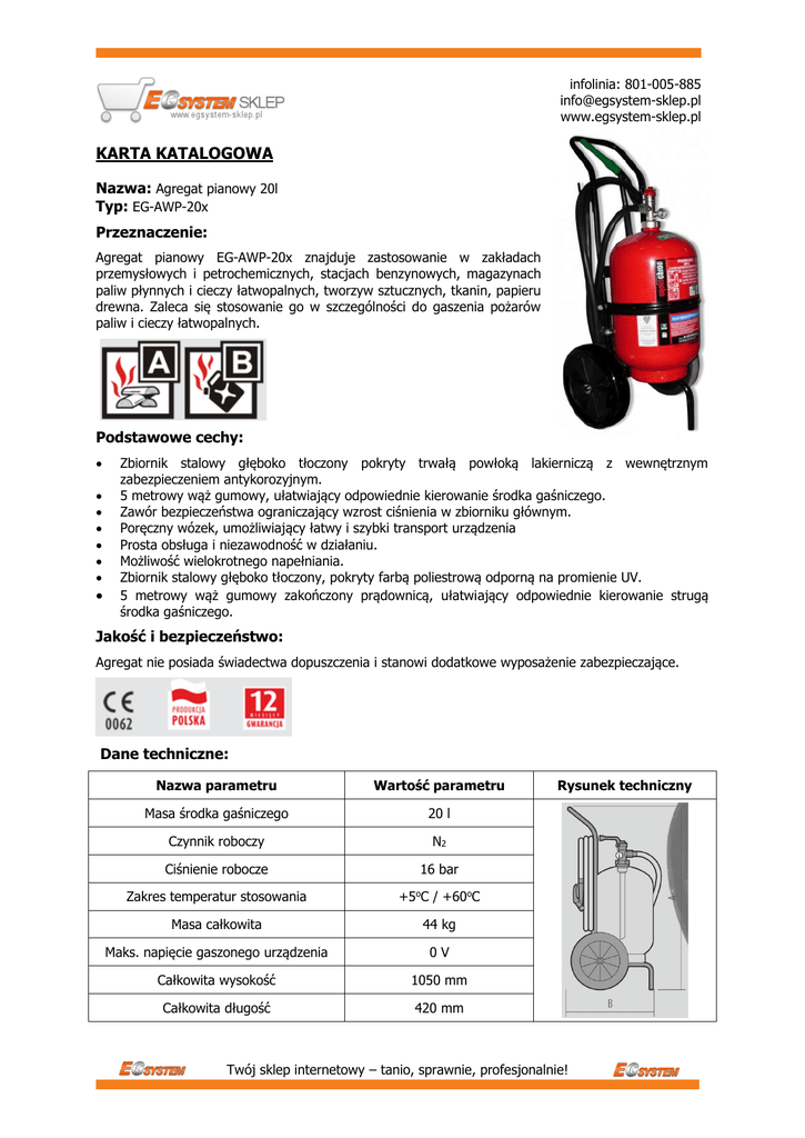 infolinia: 801-005-885 [email protected] www.egsystem-sklep.pl KARTA KATALOGOWA Nazwa: Agregat pianowy 20l Typ: EG-AWP-20x Przeznaczenie: Agregat pianowy EG-AWP-20x znajduje zastosowanie w zakładach przemysłowych i petrochemicznych, stacjach benzynowych, magazynach paliw płynnych i cieczy łatwopalnych, tworzyw sztucznych, tkanin, papieru drewna. Zaleca się stosowanie go w szczególności do gaszenia pożarów paliw i cieczy łatwopalnych. Podstawowe cechy: Zbiornik stalowy głęboko tłoczony pokryty trwałą powłoką lakierniczą z wewnętrznym zabezpieczeniem antykorozyjnym. 5 metrowy wąż gumowy, ułatwiający odpowiednie kierowanie środka gaśniczego. Zawór bezpieczeństwa ograniczający wzrost ciśnienia w zbiorniku głównym. Poręczny wózek, umożliwiający łatwy i szybki transport urządzenia Prosta obsługa i niezawodność w działaniu. Możliwość wielokrotnego napełniania. Zbiornik stalowy głęboko tłoczony, pokryty farbą poliestrową odporną na promienie UV. 5 metrowy wąż gumowy zakończony prądownicą, ułatwiający odpowiednie kierowanie strugą środka gaśniczego. Jakość i bezpieczeństwo: Agregat nie posiada świadectwa dopuszczenia i stanowi dodatkowe wyposażenie zabezpieczające. Dane techniczne: Nazwa parametru Wartość parametru Masa środka gaśniczego 20 l Czynnik roboczy N2 Ciśnienie robocze 16 bar Zakres temperatur stosowania +5oC / +60oC Masa całkowita 44 kg Maks. napięcie gaszonego urządzenia 0V Całkowita wysokość 1050 mm Całkowita długość 420 mm Rysunek techniczny Twój sklep internetowy – tanio, sprawnie, profesjonalnie!