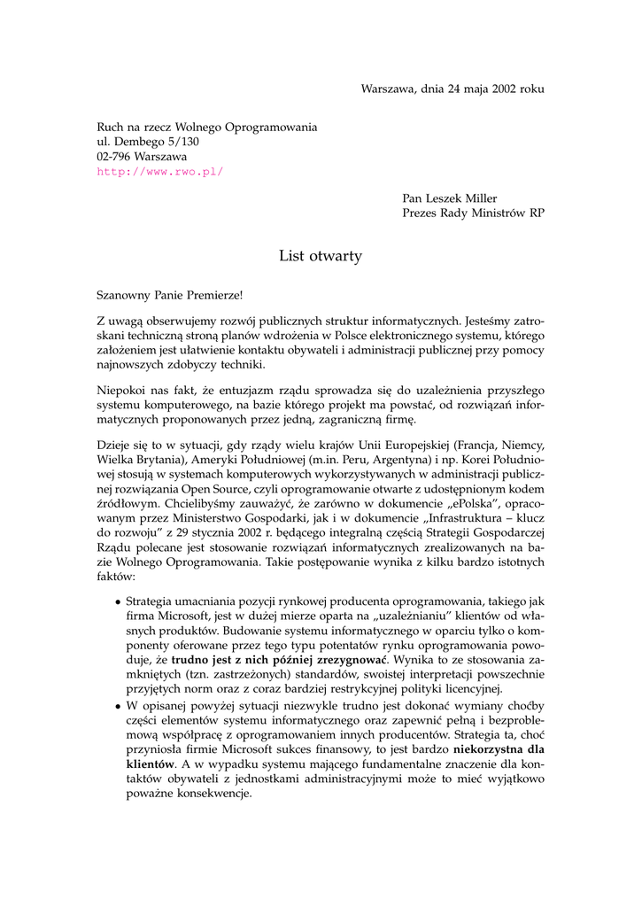 Warszawa, dnia 24 maja 2002 roku Ruch na rzecz Wolnego Oprogramowania ul. Dembego 5/130 02-796 Warszawa http://www.rwo.pl/ Pan Leszek Miller Prezes Rady Ministrów RP List otwarty Szanowny Panie Premierze! Z uwagą obserwujemy rozwój publicznych struktur informatycznych. Jesteśmy zatroskani techniczną stroną planów wdrożenia w Polsce elektronicznego systemu, którego założeniem jest ułatwienie kontaktu obywateli i administracji publicznej przy pomocy najnowszych zdobyczy techniki. Niepokoi nas fakt, że entuzjazm rządu sprowadza się do uzależnienia przyszłego systemu komputerowego, na bazie którego projekt ma powstać, od rozwiązań informatycznych proponowanych przez jedną, zagraniczną firmę. Dzieje się to w sytuacji, gdy rządy wielu krajów Unii Europejskiej (Francja, Niemcy, Wielka Brytania), Ameryki Południowej (m.in. Peru, Argentyna) i np. Korei Południowej stosują w systemach komputerowych wykorzystywanych w administracji publicznej rozwiązania Open Source, czyli oprogramowanie otwarte z udostępnionym kodem źródłowym. Chcielibyśmy zauważyć, że zarówno w dokumencie „ePolska”, opracowanym przez Ministerstwo Gospodarki, jak i w dokumencie „Infrastruktura – klucz do rozwoju” z 29 stycznia 2002 r. będącego integralną częścią Strategii Gospodarczej Rządu polecane jest stosowanie rozwiązań informatycznych zrealizowanych na bazie Wolnego Oprogramowania. Takie postępowanie wynika z kilku bardzo istotnych faktów: • Strategia umacniania pozycji rynkowej producenta oprogramowania, takiego jak firma Microsoft, jest w dużej mierze oparta na „uzależnianiu” klientów od własnych produktów. Budowanie systemu informatycznego w oparciu tylko o komponenty oferowane przez tego typu potentatów rynku oprogramowania powoduje, że trudno jest z nich później zrezygnować. Wynika to ze stosowania zamkniętych (tzn. zastrzeżonych) standardów, swoistej interpretacji powszechnie przyjętych norm oraz z coraz bardziej restrykcyjnej polityki licencyjnej. • W opisanej powyżej sytuacji niezwykle trudno jest dokonać wymiany choćby części elementów systemu informatycznego oraz zapewnić pełną i bezproblemową współpracę z oprogramowaniem innych producentów. Strategia ta, choć przyniosła firmie Microsoft sukces finansowy, to jest bardzo niekorzystna dla klientów. A w wypadku systemu mającego fundamentalne znaczenie dla kontaktów obywateli z jednostkami administracyjnymi może to mieć wyjątkowo poważne konsekwencje. • Korzystanie z kompleksowej oferty wielkich monopolistów rynku oprogramowania przy tak dużych projektach, jak realizacja idei „elektronicznego rządu”, byłoby wyjątkowo niekorzystne dla polskiej gospodarki. Pragniemy zwrócić Pana uwagę na fakt, iż monopol Microsoftu powoduje ograniczanie rozwoju lokalnych rynków usług informatycznych, co przekłada się w prostej linii na znaczne zubożenie rynku pracy rodzimych informatyków. • Nasze państwo od dłuższego już czasu aspiruje do uczestnictwa w strukturach Unii Europejskiej. Warto zauważyć, że wśród zaleceń UE znalazło się promowanie oprogramowania otwartego. Przejawia się to m.in. w dofinansowywaniu akademickich projektów Open Source oraz wykorzystywaniu tych produktów w administracji państwowej. „Otwarte” rozwiązania promują lub wykorzystują na co dzień również tak poważne instytucje, jak Departament Obrony USA (Załącznik nr 2, poz. 5) czy Narodowa Agencja Bezpieczeństwa Stanów Zjednoczonych (Załącznik nr 2, poz. 4). • Uważamy, iż wykorzystanie w projekcie informatyzacji administracji publicznej rozwiązań proponowanych przez ruch Open Source leży jak najbardziej w duchu polityki Unii Europejskiej. Strategia taka jest korzystna dla całej UE, albowiem pozwala przeciwstawiać się praktykom monopolistycznym przedsiębiorstw takich jak Microsoft (przeciwko któremu toczy się w USA proces antymonopolowy). • Przy informatyzacji wszelkiego rodzaju instytucji należy też zwrócić uwagę na bardzo ważny aspekt bezpieczeństwa danych, a co za tym idzie – także poufności wszelkich informacji. Produkty Microsoftu są powszechnie znane z nienajlepszego poziomu zabezpieczeń. Sytuacja w tym względzie stała się na tyle poważna, że np. analitycy uznanej firmy Gartner Group zalecili przedsiębiorstwom zaprzestanie korzystania z serwera WWW produkcji Microsoftu (Załącznik nr 2, poz. 6). • Z bezpieczeństwem danych związana jest ściśle tematyka wirusów komputerowych, działających i rozprzestrzeniających się głównie dzięki systemom operacyjnym, serwerom WWW i oprogramowaniu biurowemu Microsoftu. Konsekwencje zaatakowania przez wirusy punktów systemu kluczowych dla infrastruktury administracyjnej mogą być bardzo poważne. Znaczące problemy powoduje również sama konieczność skutecznej ochrony oprogramowania przed wirusami. W związku z powyższymi faktami opowiadamy się za tym, aby przy realizacji projektów informatyzacji struktur administracji publicznej używano ogólnie dostępnych otwartych standardów oraz, w możliwie największym stopniu, korzystano z rozwiązań opracowanych w ramach inicjatywy Open Source. Zastosowanie rozwiązań z dorobku programistów opensource’owych (udostępniających kod źródłowy) pozwoli maksymalnie wykorzystać potencjał polskich specjalistów, oprzeć się na wypróbowanych i w pełni ustandaryzowanych technologiach oraz znacznie ograniczyć wydatki związane z budową systemu. O tym, że jest to podejście ze wszech miar słuszne, świadczy chociażby fakt, iż bez otwartych standardów i Wolnego Oprogramowania niemożliwe byłoby m.in. istnienie Internetu w jego obecnej postaci. Pragniemy zwrócić Pana uwagę na przykre doświadczenia niektórych państw europejskich związane z wdrażaniem koncepcji e-governmentu. Na przykład w Wielkiej Brytanii przez długi czas użytkownicy systemów innych niż Microsoft Windows i Mac OS nie mogli korzystać z