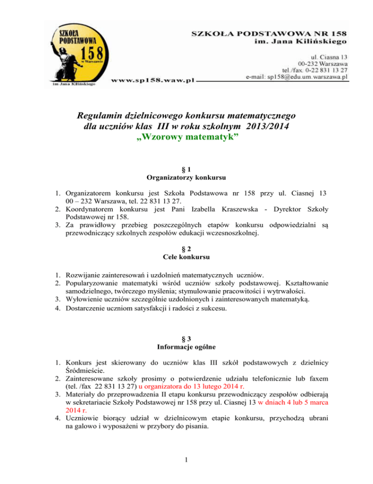 Regulamin dzielnicowego konkursu matematycznego dla uczniów klas III w roku szkolnym 2013/2014 „Wzorowy matematyk” §1 Organizatorzy konkursu 1. Organizatorem konkursu jest Szkoła Podstawowa nr 158 przy ul. Ciasnej 13 00 – 232 Warszawa, tel. 22 831 13 27. 2. Koordynatorem konkursu jest Pani Izabella Kraszewska - Dyrektor Szkoły Podstawowej nr 158. 3. Za prawidłowy przebieg poszczególnych etapów konkursu odpowiedzialni są przewodniczący szkolnych zespołów edukacji wczesnoszkolnej. §2 Cele konkursu 1. Rozwijanie zainteresowań i uzdolnień matematycznych uczniów. 2. Popularyzowanie matematyki wśród uczniów szkoły podstawowej. Kształtowanie samodzielnego, twórczego myślenia; stymulowanie pracowitości i wytrwałości. 3. Wyłowienie uczniów szczególnie uzdolnionych i zainteresowanych matematyką. 4. Dostarczenie uczniom satysfakcji i radości z sukcesu. §3 Informacje ogólne 1. Konkurs jest skierowany do uczniów klas III szkół podstawowych z dzielnicy Śródmieście. 2. Zainteresowane szkoły prosimy o potwierdzenie udziału telefonicznie lub faxem (tel. /fax 22 831 13 27) u organizatora do 13 lutego 2014 r. 3. Materiały do przeprowadzenia II etapu konkursu przewodniczący zespołów odbierają w sekretariacie Szkoły Podstawowej nr 158 przy ul. Ciasnej 13 w dniach 4 lub 5 marca 2014 r. 4. Uczniowie biorący udział w dzielnicowym etapie konkursu, przychodzą ubrani na galowo i wyposażeni w przybory do pisania. 1 §4 Etapy konkursu 1. I etap – szkolny Szkolna komisja konkursowa czuwa nad prawidłowym przebiegiem sprawdzianów i przekazuje protokołem organizatorowi wykaz uczniów zakwalifikowanych do II etapu konkursu. Termin sprawdzianu - do 14 marca 2014 r. Do drugiego etapu przechodzą uczniowie, którzy zdobyli: 80 % wymaganych punktów. Protokoły powinny wpłynąć do organizatora do 21 marca 2014 r. 2. II etap – dzielnicowy Za prawidłowy przebieg tego etapu odpowiada organizator i powołana przez niego komisja konkursowa. Termin sprawdzianu – 8 kwietnia 2014 r. SP 158 ul. Ciasna 13 w godz. 13.00 – 13.45 Zapraszamy do prac w komisji konkursowej po jednym nauczycielu z każdej szkoły biorącej udział w konkursie w dniu 8 kwietnia 2014 r. w godz. 14.00 – 16.00 w SP 158. Dokładną informację o wynikach etapu dzielnicowego, zaproszenia dla laureatów i ich nauczycieli otrzymają wszystkie szkoły, których uczniowie wezmą udział w tym etapie, do dnia 11 kwietnia 2014 r. Wyniki będą również opublikowane na stronie internetowe SP nr 158 www.sp158.waw.pl Podsumowanie etapu dzielnicowego odbędzie się 25 kwietnia 2014 r. godz. 11.00 w Domu Kultury „Muranów” przy ul. Stawki 10. 3. III etap - warszawski Laureaci dzielnicowego konkursu „Wzorowy matematyk” będą reprezentować dzielnicę Śródmieście w etapie warszawskim konkursu „Mała olimpiada matematyczna”. FINAŁ odbędzie się 10 maja 2014 r. godz. 10.00 w SP 65 ul. Mścisławska 1 Wyniki „Małej olimpiady matematycznej” zostaną zamieszczone na stronie internetowej SP 65. §5 Nagradzanie zwycięzców 1. Laureaci konkursu dzielnicowego otrzymują nagrody rzeczowe ufundowane przez Burmistrza Dzielnicy Śródmieście m. st. Warszawy. 2. Tytuł „Wzorowy matematyk” otrzymują uczniowie, którzy zdobyli maksymalną liczbę punktów ze sprawdzianu. 3. Na uroczystość podsumowania etapu dzielnicowego zapraszamy laureatów II etapu konkursu, Dyrektorów Szkół, Nauczycieli przygotowujących uczniów i Rodziców. 2 §6 Załączone materiały 1. Sprawdzian do przeprowadzenia eliminacji szkolnych. 2. Protokół do wypełnienia po I etapie. 3. Zgoda na publikację wyników w Internecie. 3 załącznik Protokół przebiegu pierwszego etapu konkursu matematycznego dla klas III „Wzorowy matematyk” przeprowadzonego dnia ........................................ w Szkole Podstawowej nr ........................ W konkursie wzięło udział ......................uczniów. Komisja konkursowa w składzie: przewodniczący - ................................................................................ członkowie: ................................................................................ ................................................................................ dokonała oceny prac i wyłoniła zwycięzców konkursu. Lp. imię i nazwisko ucznia klasa liczba punktów imię i nazwisko nauczyciela 4 załącznik Zgoda rodziców/ prawnych opiekunów dziecka …………………………………. imię i nazwisko dziecka ………………………………….. klasa …………………………………. nazwa i adres szkoły OŚWIADCZENIE Oświadczam, że wyrażam zgodę na publikowanie danych osobowych oraz wyników uzyskanych przez moje dziecko na etapie dzielnicowym konkursu …………………………………………………………………………………………………. /nazwa konkursu/ organizowanego przez Szkołę Podstawową nr 158 w Warszawie na stronie internetowej Szkoły Podstawowej nr 158 www.sp158.waw.pl w roku szkolnym 2013/2014. ………………………………….. /data/ …………………………………………. /czytelnie imię i nazwisko rodziców/ prawnych opiekunów/ Podstawa prawna: Ustawa z dnia 29 sierpnia 1997 r. o ochronie danych osobowych ( tekst jednolity: Dz. U. z 2002 r. Nr 101, poz. 926 ze zmianami). 5
