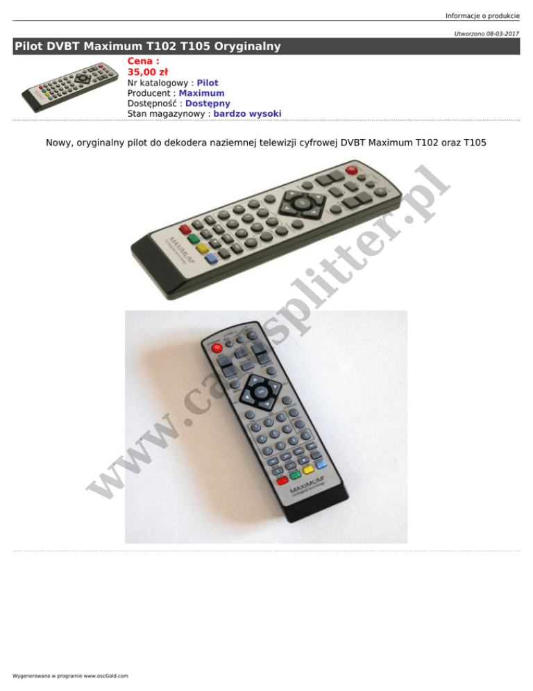 Informacje o produkcie Utworzono 08-03-2017 Pilot DVBT Maximum T102 T105 Oryginalny Cena : 35,00 zł Nr katalogowy : Pilot Producent : Maximum Dostępność : Dostępny Stan magazynowy : bardzo wysoki w w w .c ar d sp lit te r .p l Nowy, oryginalny pilot do dekodera naziemnej telewizji cyfrowej DVBT Maximum T102 oraz T105 Wygenerowano w programie www.oscGold.com