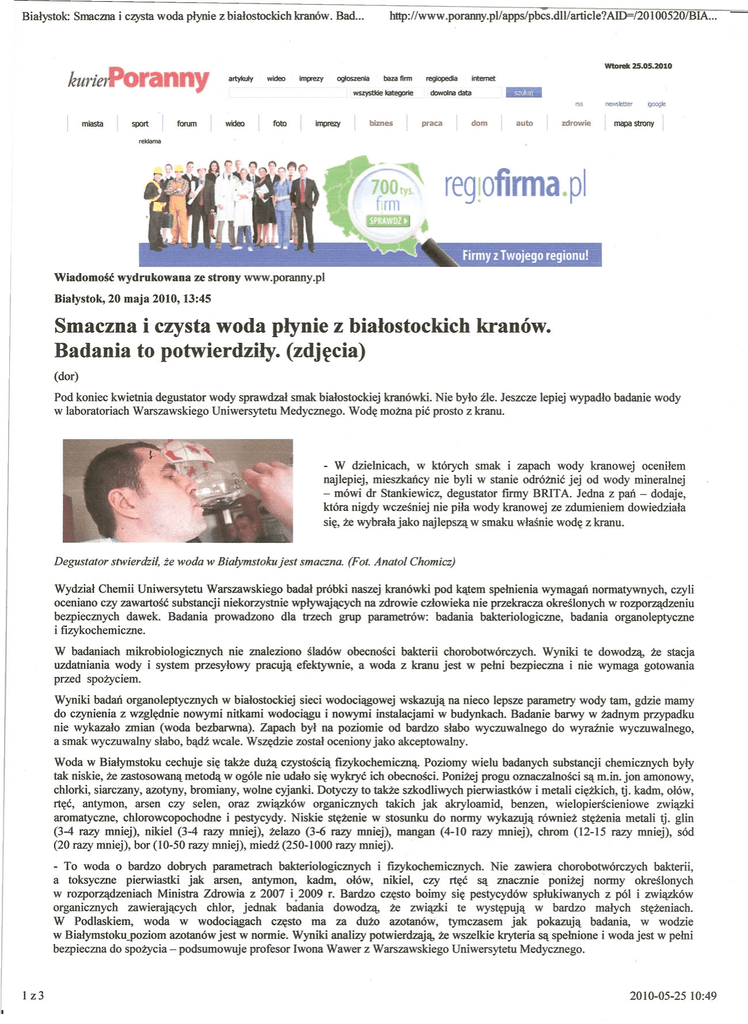 Bialystok http://www.poranny.pl/apps/pbcs.dll/article? Smaczna i czysta woda plynie z bialostockich kranów. Bad ... AID=/20 100520/BIA ... wtorek 25.05.2010 kurielPoranny miasta sport forum artykuly wideo imprezy ogloszenia bazafinn wszystkie kategorie wideo foto imprezy biznes regiopedia internet dowolna data dom praca __ auto zdrowie I mapa strony I reklama reg!ofirma.pl Wiadomosc wydrukowana ze strony www.poranny.pl Bialystok, 20 maja 2010, 13:45 Smaczna i czysta woda plynie z bialostockich kranów. Badania to potwierdzily. (zdjecia) (dor) Pod koniec kwietnia degustator wody sprawdzal smak bialostockiej kranówki. Nie bylo zle. Jeszcze lepiej wypadlo badanie wody w laboratoriach Warszawskiego Uniwersytetu Medycznego. Wode mozna pic prosto z kranu. - W dzielnicach, w których smak i zapach wody kranowej ocenilem najlepiej, mieszkancy nie byli w stanie odróznic jej od wody mineralnej - mówi dr Stankiewicz, degustator firmy BRlTA. Jedna z pan - dodaje, która nigdy wczesniej nie pila wody kranowej ze zdumieniem dowiedziala sie, ze wybrala jako najlepsza w smaku wlasnie wode z kranu. Degustator stwierdzil, ze woda w Bialymstokujest smaczna. (Fot. Anatol Chomicz) Wydzial Chemii Uniwersytetu Warszawskiego badal próbki naszej kranówki pod katem spelnienia wymagan normatywnych, czyli oceniano czy zawartosc substancji niekorzystnie wplywajacych na zdrowie czlowieka nie przekracza okreslonych w rozporzadzeniu bezpiecznych dawek. Badania prowadzono dla trzech grup parametrów: badania bakteriologiczne, badania organoleptyczne i fizykochemiczne. W badaniach mikrobiologicznych nie znaleziono sladów obecnosci bakterii chorobotwórczych. Wyniki te dowodza, ze stacja uzdatniania wody i system przesylowy pracuja efektywnie, a woda z kranu jest w pelni bezpieczna i nie wymaga gotowania przed spozyciem. Wyniki badan organoleptycznych w bialostockiej sieci wodociagowej wskazuja na nieco lepsze parametry wody tam, gdzie mamy do czynienia z wzglednie nowymi nitkami wodociagu i nowymi instalacjami w budynkach. Badanie barwy w zadnym przypadku nie wykazalo zmian (woda bezbarwna). Zapach byl na poziomie od bardzo slabo wyczuwalnego do wyraznie wyczuwalnego, a smak wyczuwalny slabo, badz wcale. Wszedzie zostal oceniony jako akceptowalny. Woda w Bialymstoku cechuje sie takze duza czystoscia fizykochemiczna. Poziomy wielu badanych substancji chemicznych byly tak niskie, ze zastosowana metoda w ogóle nie udalo sie wykryc ich obecnosci. Ponizej progu oznaczalnosci sa m.in. jon amonowy, chlorki, siarczany, azotyny, bromiany, wolne cyjanki. Dotyczy to takze szkodliwych pierwiastków i metali ciezkich, tj. kadm, olów, rtec, antymon, arsen czy selen, oraz zwiazków organicznych takich jak akryloamid, benzen, wielopierscieniowe zwiazki aromatyczne, chlorowcopochodne i pestycydy. Niskie stezenie w stosunku do normy wykazuja równiez stezenia metali tj. glin (3-4 razy mniej), nikiel (3-4 razy mniej), zelazo (3-6 razy mniej), mangan (4-10 razy mniej), chrom (12-15 razy mniej), sód (20 razy mniej), bor (10-50 razy mniej), miedz (250-1000 razy mniej). - To woda o bardzo dobrych parametrach bakteriologicznych i fizykochemicznych. Nie zawiera chorobotwórczych bakterii, a toksyczne pierwiastki jak arsen, antymon, kadm, olów, nikiel, czy rtec sa znacznie ponizej normy okreslonych w rozporzadzeniach Ministra Zdrowia z 2007 i. 2009 r. Bardzo czesto boimy sie pestycydów splukiwanych z pól i zwiazków organicznych zawierajacych chlor, jednak badania dowodza, ze zwiazki te wystepuja w bardzo malych stezeniach. W Podlaskiem, woda w wodociagach czesto ma za duzo azotanów, tymczasem jak pokazuja badania, w wodzie w Bialymstokapoziom azotanów jest w normie. Wyniki analizy potwierdzaja, ze wszelkie kryteria sa spelnione i woda jest w pelni bezpieczna do spozycia - podsumowuje profesor Iwona Wawer z Warszawskiego Uniwersytetu Medycznego. l z3 2010-05-25 10:49