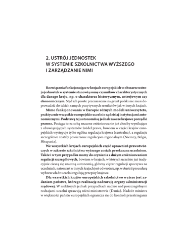 2. USTRÓJ JEDNOSTEK W SYSTEMIE SZKOLNICTWA WYŻSZEGO I ZARZĄDZANIE NIMI Rozwiązania funkcjonujące w krajach europejskich w obszarze ustroju jednostek w systemie stanowią sumę czynników charakterystycznych dla danego kraju, np. o charakterze historycznym, ustrojowym czy ekonomicznym. Stąd ich proste przeniesienie na grunt polski nie musi doprowadzić do takich samych pozytywnych rezultatów jak w innych krajach. Mimo funkcjonowania w Europie różnych modeli uniwersytetu, praktycznie wszystkie europejskie uczelnie są dzisiaj instytucjami autonomicznymi. Podstawą tej autonomii są jednak zawsze krajowe porządki prawne. Pociąga to za sobą znaczne zróżnicowanie już choćby wynikające z obowiązujących systemów źródeł prawa, bowiem w części krajów europejskich występuje tylko ogólna regulacja krajowa (centralna), a regulacje szczegółowe zostały powierzone regulacjom regionalnym (Niemcy, Belgia, Hiszpania). We wszystkich krajach europejskich część uprawnień prawotwórczych w zakresie szkolnictwa wyższego została przekazana uczelniom. Także i w tym przypadku mamy do czynienia z dużym zróżnicowaniem regulacji szczegółowych, bowiem w krajach, w których uczelnie już tradycyjnie cieszą się znaczną autonomią, główny ciężar regulacji spoczywa na uczelniach, natomiast w innych krajach jest odwrotnie, np. w Austrii procedurę wyboru władz uczelni regulują przepisy krajowe. Dla wszystkich krajów europejskich szkolnictwo wyższe jest zadaniem państwa, którego realizację nadzorują organy administracji rządowej. W niektórych jednak przypadkach nadzór nad poszczególnymi rodzajami uczelni sprawują różni ministrowie (Dania). Nadzór ministra w większości państw europejskich ogranicza się do kontroli przestrzegania 88 CZĘŚĆ DRUGA: PREZENTACJA MODUŁOWA prawa, czego konsekwencją są środki skierowane do rozstrzygnięć organów uczelni, jednak występują też przypadki wyposażenia ministra w bardzo silne środki o charakterze personalnym, łącznie z możliwością odwołania organu uczelni. Są również przypadki występowania stanowczego wpływu administracji rządowej na powoływanie monokratycznych organów uczelni (Węgry). Zauważalną tendencją w Europie jest powoływanie podmiotów pośredniczących między administracją rządową i uczelniami, których skład tworzą zarówno przedstawiciele uczelni, jak i administracji rządowej. Takim podmiotom, funkcjonującym najczęściej jako rady powiernicze powierza się m.in. funkcje nadzorcze. Typowym rozwiązaniem europejskim jest także współdziałanie państwowych organów nadzoru z krajowymi organami właściwymi w sprawach przestrzegania jakości, doradczymi organami o charakterze środowiskowym oraz organami skupiającymi zarządzających uczelniami (konferencje lub rady rektorów). Na kształt instytucji nadzoru w każdym państwie bezpośredni wpływ ma również sposób finansowania uczelni. Oceniając autonomię uczelni europejskich z punktu widzenia zasad ich tworzenia oraz likwidacji, jak też ich przekształcania i nadawania nazw mamy do czynienia z dużym zróżnicowaniem zdeterminowanym różnymi typami uczelni, a w szczególności występowaniem zarówno uczelni publicznych, jak i uczelni prywatnych (niepublicznych). Z jednej strony mamy do czynienia z modelem brytyjskim, w którym uczelnie są instytucjami prywatnymi uznanymi przez państwo, z drugiej zaś w krajach Europy Środkowej uczelnie w przeważającej mierze miały charakter publiczny i tworzone były z woli państwa. Obecnie dokonujące się przemiany szkolnictwa wyższego krajów środkowoeuropejskich zmierzające do jego powrotu do europejskiej wspólnoty akademickiej powodują dopuszczalność dwóch dróg powstawiania uczelni, a mianowicie uczelnie publiczne są tworzone w drodze aktów prawotwórczych organów państwa, zaś uczelnie niepubliczne, albo na podstawie państwowego aktu stosowania prawa (pozwolenia) będącego podstawą do czynności o charakterze prywatnym, albo aktu uznającego funkcjonowanie utworzonego w drodze czynności cywilnoprawnych podmiotu. W każdym jednak przypadku odpowiedzialność państwa za funkcjonowanie 2. USTRÓJ JEDNOSTEK W SYSTEMIE SZKOLNICTWA WYŻSZEGO... 89 szkolnictwa wyższego, a także fakt jego finansowania, oznacza konieczność wprowadzenia szczegółowych regulacji państwowych odzwierciedlających politykę państwa w tym zakresie. Z polskiego punktu widzenia zasadnym wydaje się zmierzanie w kierunku zwiększania autonomii uczelni, tak w znaczeniu instytucjonalnym, jak i funkcjonalnym, przede wszystkim przez deregulację systemu prawnego, czerpiąc (dobre i) przystające do polskich warunków szczegółowe rozwiązania z systemów różnych państw. A. ORGANY JEDNOSTEK W SYSTEMIE SZKOLNICTWA WYŻSZEGO, TRYB ICH WYŁANIANIA I KOMPETENCJE ORAZ WZAJEMNE RELACJE Centralny element systemu szkolnictwa wyższego stanowią uczelnie, których ustrój wymaga gruntownej reformy, ponieważ są mało sterowne, nazbyt zbiurokratyzowane, a ich funkcjonowanie jest nieadekwatne do wyzwań stawianych zarówno przez międzynarodowy świat nauki, jak również przez otoczenie społeczne i gospodarcze. Podmiotem uczelni powinna pozostać społeczność akademicka, natomiast wybór władz uczelni musi uwzględniać również zdanie – wskazanych przez senat uczelni – przedstawicieli interesariuszy zewnętrznych, których obecność mogłaby zmienić hermetyczną kulturę instytucji szkolnictwa wyższego. Wybór władz powinien odbywać się w formie konkursu (w 2020 r.), a nie – jak ma to dotychczas miejsce – w sposób zbyt kolegialny. Doświadczenia wielu krajów Europy Zachodniej oferują szerokie spektrum sprawdzonych wzorców efektywnego włączania społeczności akademickiej w funkcjonowanie instytucji szkolnictwa wyższego. Zakłada się, że organami zarządczymi uczelni będą rada powiernicza z kompetencjami strategiczno-nadzorczymi oraz rektor stojący na