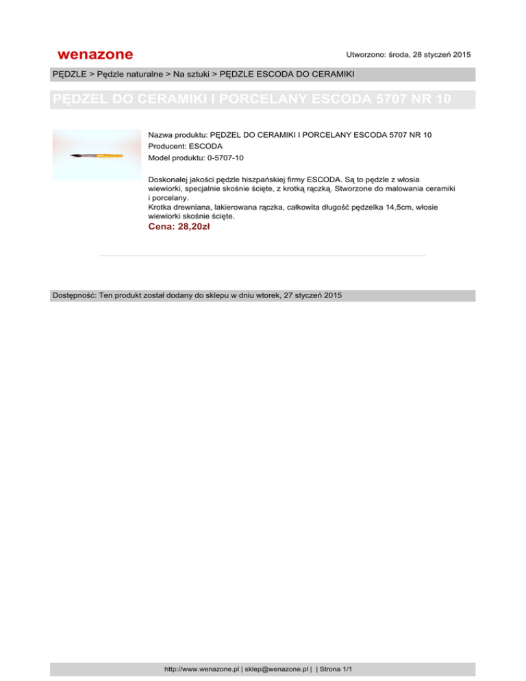 wenazone Utworzono: środa, 28 styczeń 2015 PĘDZLE > Pędzle naturalne > Na sztuki > PĘDZLE ESCODA DO CERAMIKI PĘDZEL DO CERAMIKI I PORCELANY ESCODA 5707 NR 10 Nazwa produktu: PĘDZEL DO CERAMIKI I PORCELANY ESCODA 5707 NR 10 Producent: ESCODA Model produktu: 0-5707-10 Doskonałej jakości pędzle hiszpańskiej firmy ESCODA. Są to pędzle z włosia wiewiorki, specjalnie skośnie ścięte, z krotką rączką. Stworzone do malowania ceramiki i porcelany. Krotka drewniana, lakierowana rączka, całkowita długość pędzelka 14,5cm, włosie wiewiorki skośnie ścięte. Cena: 28,20zł Dostępność: Ten produkt został dodany do sklepu w dniu wtorek, 27 styczeń 2015 http://www.wenazone.pl | [email protected] | | Strona 1/1