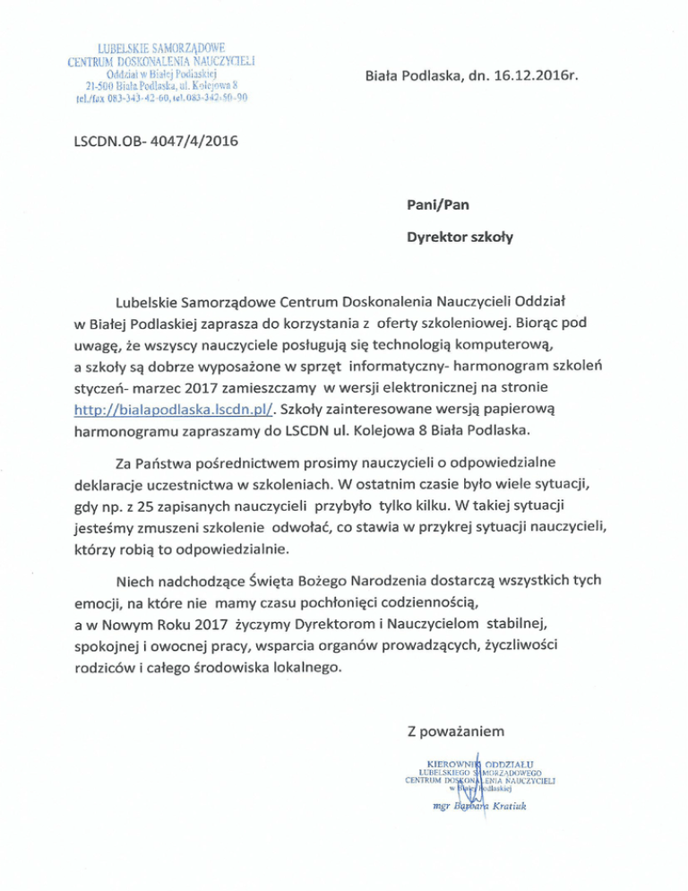 LUBELSKIE SAMORZĄDOWE CENTRUM DOSKONALENIA NAUCZYCIELI Oddział w Białej Podlaskiej ul. Kolejowa 8 tel/fax 83 343-42-60, konsultanci 83-342-50-90, organizacja kursów 83-342-50-91, www.lscdn.pl; [email protected] Harmonogram szkoleń: I-III 2017 r. Wychowanie przedszkolne, Edukacja wczesnoszkolna Liczba godzin Termin Temat szkolenia 04.02.2017 r. godz. 900-1700 05.02.2017 r. godz. 900-1700 Kształtowanie dojrzałości szkolnej w wychowaniu przedszkolnym 16.02.2017 r. godz.1400-1830 20.02.2017 r. godz.1400-1830 „Mały patriota”wychowanie patriotyczne w klasach I- III 18.02.2017 r. godz. 900-1615 19.02.2017 r. godz. 900-1615 Odpłatność Miejsce szkolenia LSCDN Oddział Forma Dla kogo prowadzący Uwagi 18 10 zł w Białej Podlaskiej kurs doskonalący Nauczyciele wychowania przedszkolnego Barbara Kratiuk Numer oferty z informatora -401 12 LSCDN Oddział 10 zł w Białej Podlaskiej ul. Kolejowa 8 kurs doskonalący Nauczyciele edukacji wczesnoszkolnej Grażyna Laszuk Numer oferty z informatora -411 Ćwiczenia i zabawy przygotowujące dzieci do nauki czytania i pisania 18 LSCDN Oddział 10 zł w Białej Podlaskiej ul. Kolejowa 8 kurs doskonalący Nauczyciele wychowania przedszkolnego Barbara Kratiuk Numer oferty z informatora -404 04.03.2017 r. godz. 900-1700 Wiosenno- świąteczne inspiracje 10 75 zł w Białej Podlaskiej Zainteresowani nauczyciele Joanna Grochola Numer oferty z informatora -409 11.03.2017 r. godz. 900-1600 18.03.2017 r. godz. 900-1600 Rozwijanie kreatywności uczniów w młodszym wieku szkolnym 18 10 zł w Białej Podlaskiej Nauczyciele edukacji wczesnoszkolnej Grażyna Laszuk Numer oferty z informatora - 412 ul. Kolejowa 8 LSCDN Oddział warsztaty ul. Kolejowa 8 LSCDN Oddział ul. Kolejowa 8 kurs doskonalący Zachęcamy do zapisywania na szkolenia poprzez rejestrację na stronie www.lscdn.pl, LUBELSKIE SAMORZĄDOWE CENTRUM DOSKONALENIA NAUCZYCIELI Oddział w Białej Podlaskiej ul. Kolejowa 8 tel/fax 83 343-42-60, konsultanci 83-342-50-90, organizacja kursów 83-342-50-91, www.lscdn.pl; [email protected] Harmonogram szkoleń: I-III 2017 r. Przedmioty przyrodnicze Termin Temat szkolenia Liczba godzin Odpłatność Miejsce szkolenia Forma LSCDN Oddział 04.02.2017 r. godz. 900-1530 Motywowanie uczniów do nauki. 16.02.2017 r. godz.1500-1930 17.02.2017 r. godz.1500-1930 8 10 zł w Białej Podlaskiej Projekt edukacyjny w warunkach szkolnych. 12 10 zł LSCDN Oddział w Białej Podlaskiej ul. Kolejowa 8 25.02.2017 r. godz. 900-1530 Metody i techniki wyzwalające aktywność ucznia. 8 10 zł w Białej Podlaskiej 01.03.2017 r. godz.1430-1900 Ocenianie kształtujące a podnoszenie efektów kształcenia. 6 10 zł w Białej Podlaskiej 11.03.2017 r. godz. 900-1530 Tworzenie warunków sprzyjających uczeniu się. 8 10 zł w Białej Podlaskiej 25.03.2017 r. godz.900-1530 26.03.2017 r. godz.900-1530 Aktywizacja uczniów na lekcjach przedmiotów przyrodniczych. 16 LSCDN Oddział w Białej Podlaskiej ul. Kolejowa 8 prowadzący warsztaty Zainteresowani nauczyciele Ewa Makowska kurs doskonalący Zainteresowani nauczyciele Ewa Makowska warsztaty Zainteresowani nauczyciele Ewa Makowska warsztaty Zainteresowani nauczyciele Ewa Makowska warsztaty Zainteresowani nauczyciele Ewa Makowska warsztaty Zainteresowani nauczyciele przedmiotów przyrodniczych Ewa Makowska ul. Kolejowa 8 LSCDN Oddział ul. Kolejowa 8 LSCDN Oddział ul. Kolejowa 8 LSCDN Oddział ul. Kolejowa 8 10 zł Dla kogo Zachęcamy do zapisywania na szkolenia poprzez rejestrację na stronie www.lscdn.pl, Uwagi Numer oferty z informatora - 444 LUBELSKIE SAMORZĄDOWE CENTRUM DOSKONALENIA NAUCZYCIELI Oddział w Białej Podlaskiej ul. Kolejowa 8 tel/fax 83 343-42-60, konsultanci 83-342-50-90, organizacja kursów 83-342-50-91, www.lscdn.pl; [email protected] Harmonogram szkoleń: I-III 2017 r. Język polski Liczba godzin Odpłatność Miejsce szkolenia Forma 15.02.2017 r. godz.1400-1900 Planowanie i organizowanie zajęć edukacyjnych z uwzględnieniem dostosowania metod pracy do indywidualnych możliwości uczniów. 6 10 zł LSCDN Oddział w Białej Podlaskiej ul. Kolejowa 8 kurs doskonalący 13.03.2017 r. godz. 1400-1900 Przygoda z książką w klasach IV-VI szkoły podstawowej. 6 10 zł LSCDN Oddział w Białej Podlaskiej ul. Kolejowa 8 27.03.2017 r. godz.1400-1900 Teksty kultury na lekcjach języka polskiego w szkole podstawowej. 6 10 zł LSCDN Odział w Białej Podlaskiej ul. Kolejowa 8 Termin Temat szkolenia Dla kogo prowadzący Nauczyciele języka polskiego Jolanta Dydycz warsztaty Nauczyciele języka polskiego szkół podstawowych Jolanta Dydycz warsztaty Nauczyciele języka polskiego szkół podstawowych Jolanta Dydycz Uwagi Harmonogram szkoleń: I-III 2017 r. Języki obce Termin Temat szkolenia 11.02.2017 r. godz. 1430-1900 Zasoby i narzędzia w chmurze – wykorzystanie zasobów internetowych do nauki języka angielskiego 02.03.2017 r. godz. 1430-1900 10.03.2017 r. godz. 1430-1900 Różnorodność językowa i kulturowa w klasie - jak sobie z nią radzić 31.03.2017 r. godz. 1430-1900 Warsztat pracy młodego nauczyciela języków obcych Liczba godzin 8 12 6 Odpłatność Miejsce szkolenia Forma 10 zł LSCDN Oddział w Białej Podlaskiej ul. Kolejowa 8 warsztaty Zainteresowani nauczyciele języka angielskiego Gałązka Ryszard 10 zł LSCDN Oddział w Białej Podlaskiej ul. Kolejowa 8 warsztaty Zainteresowani nauczyciele wszystkich języków obcych Gałązka Ryszard 10 zł LSCDN Oddział w Białej Podlaskiej ul. Kolejowa 8 warsztaty Zainteresowani młodzi stażem nauczyciele SP i Gimn. Gałązka Ryszard Dla kogo Zachęcamy do zapisywania na szkolenia poprzez rejestrację na stronie www.lscdn.pl, prowadzący Uwagi Numer oferty z informatora - 428 LUBELSKIE SAMORZĄDOWE CENTRUM DOSKONALENIA NAUCZYCIELI Oddział w Białej Podlaskiej ul. Kolejowa 8 tel/fax 83 343-42-60, konsultanci 83-342-50-90, organizacja kursów 83-342-50-91, www.lscdn.pl; [email protected] Harmonogram szkoleń: I-III 2017 r. Nowe technologie IT Termin Liczba god