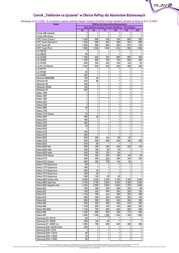 Cennik „Telefonów na życzenie” w Ofercie RePlay dla Abonentów Biznesowych Obowiązuje od 23.10.2009 r. do wyczerpania zapasów zestawów objętych niniejszym Cennikiem lub jego odwołania, jednakże nie dłużej niż do 31.12.2009 r. Model RePlay dla Abonentów Biznesowych przy zawarciu umowy na czas określony – 24 miesiące 25 50 75 100 150 250 Fonek A88 niebieski 1 1 1 1 1 1 Fonek A88 różowy 1 1 1 1 1 1 HTC Touch Cruise 2 1 249 899 799 749 699 599 HTC Touch Diamond II 1 349 999 949 899 849 699 HTC Touch HD 1 659 999 969 929 879 749 HTC Touch Pro 2 1 899 1 549 1 469 1 419 1 359 1 299 LG GB102 1 1 1 1 1 1 LG GB220 49 1 1 1 1 1 LG GC900 1 169 829 729 699 669 559 LG GD900 1 199 869 799 749 699 559 LG GT505 699 349 249 199 149 49 LG KC 910 Renoir 1 049 659 549 529 469 399 LG KP170 1 1 1 1 1 1 LG KP260 29 1 1 1 1 1 LG KS360 229 1 1 1 1 1 Maxcom MM500BB 149 49 1 1 1 1 Motorola E8 429 99 1 1 1 1 Motorola U9 349 1 1 1 1 1 Motorola VE538 149 1 1 1 1 1 Motorola V8 399 1 1 1 1 1 Nokia 1209 1 1 1 1 1 1 Nokia 1661 1 1 1 1 1 1 Nokia 1680 1 1 1 1 1 1 Nokia 2323 1 1 1 1 1 1 Nokia 2330 1 1 1 1 1 1 Nokia 2680 49 1 1 1 1 1 Nokia 2760 1 1 1 1 1 1 Nokia 3110 Classic 79 1 1 1 1 1 Nokia 3600 499 49 1 1 1 1 Nokia 3610 199 1 1 1 1 1 Nokia 3720 269 1 1 1 1 1 Nokia 5000 49 1 1 1 1 1 Nokia 5030 1 1 1 1 1 1 Nokia 5130 199 1 1 1 1 1 Nokia 5310 349 1 1 1 1 1 Nokia 5630 649 349 199 99 49 1 Nokia 5730 949 599 499 449 399 299 Nokia 6303 349 99 1 1 1 1 Nokia 6600 fold 899 399 299 259 229 149 Nokia 6600 slide 499 169 99 49 1 1 Nokia 6600i slide 549 199 139 89 1 1 Nokia 6700 Classic 749 349 249 199 149 49 Nokia 6710 849 499 429 399 349 239 Nokia 6720 Classic 699 299 199 149 99 1 Nokia 7100 Supernova 69 1 1 1 1 1 Nokia 7210 Supernova 199 1 1 1 1 1 Nokia 7310 Supernova 299 39 1 1 1 1 Nokia 7510 Supernova 499 49 1 1 1 1 Nokia 7610 Supernova 599 149 59 29 1 1 Nokia 8800 Carbon Arte 3 699 3 329 3 229 3 199 3 169 3 049 Nokia 8800 Gold Arte 4 199 3 799 3 699 3 649 3 599 3 499 Nokia 8800 Sapphire Arte 3 299 2 999 2 899 2 849 2 799 2 599 Nokia E52 749 399 349 299 249 99 Nokia E55 799 449 399 349 299 149 Nokia E75 1 149 799 649 599 559 499 Nokia N79 899 499 399 3449 299 199 Nokia N82 999 599 499 449 399 299 Nokia N85 949 599 499 469 419 299 Nokia N86 1 199 899 799 749 699 599 Nokia N95 8GB 1 149 799 699 649 599 499 Nokia N96 1 249 899 829 769 719 649 Nokia N97 1 699 1 349 1 299 1 249 1 199 1 099 Samsung GT- S3110 99 1 1 1 1 1 Samsung GT- S5050 499 149 49 1 1 1 Samsung GT- S8000 Jet 1 099 799 699 649 599 499 Samsung SGH- B2700 Solid 299 1 1 1 1 1 Samsung SGH- C270 1 1 1 1 1 1 Samsung SGH- C3010 39 1 1 1 1 1 Samsung SGH- C3050 79 1 1 1 1 1 Samsung SGH- C3060 99 1 1 1 1 1 P4 sp. z o.o. z siedzibą i adresem w Warszawie, ul. Taśmowa 7, 02-677 Warszawa wpisana do rejestru przedsiębiorców Krajowego Rejestru Sądowego pod numerem KRS 0000217207, prowadzonego przez Sąd Rejonowy dla miasta stołecznego Warszawy, XIII Wydział Gospodarczy Krajowego Rejestru Sądowego, NIP 951-21-20-077, REGON 015808609, której kapitał zakładowy wynosi: 46 342 000,00 złotych. Niniejszy dokument zawiera informacje stanowiące tajemnicę przedsiębiorstwa Grupy P4, których rozpowszechnianie w jakiejkolwiek formie bez pisemnej zgody właściciela jest zabronione do momentu ich oficjalnej publikacji. Osoba która weszła w posiadanie tego dokumentu przez przypadek lub pomyłkę proszona jest o niezwłoczne powiadomienie P4 sp. z o.o. tel. 0 790 500 500 Samsung SGH- D980 Duoz Samsung SGH- E1070 Samsung SGH- E1100 Samsung SGH- E1120 Samsung SGH- E2100 Samsung SGH- E2210 Samsung SGH- i900 Omnia Samsung SGH- i900 Omnia 16GB Samsung SGH- I7110 Samsung SGH- I8510 Innov8 Samsung SGH- L310 Samsung SGH- M3510 Samsung SGH- M7500 Emporio Armani Samsung SGH- M8800 Pixon Samsung SGH- M8910 Pixon 12 Samsung SGH- U900 Soul Sony Ericsson C905 Sony Ericsson G705 Sony Ericsson K770i Sony Ericsson S312 Sony Ericsson T700 Sony Ericsson W205 Sony Ericsson W302 Sony Ericsson W350i Sony Ericsson W395 Sony Ericsson W508 Sony Ericsson W595 Sony Ericsson W705 Sony Ericsson W760 Sony Ericsson W902 Sony Ericsson W980 Sony Ericsson X1 799 1 1 1 1 1 1 099 1 199 999 1 549 449 329 799 1 249 1 499 699 1 399 649 449 149 499 69 149 169 269 499 599 999 629 749 899 1 799 449 1 1 1 1 1 749 849 699 1 099 99 1 309 729 1 149 229 999 349 49 1 59 1 1 1 1 149 169 359 199 449 429 1 399 389 1 1 1 1 1 649 749 599 1 029 1 1 239 659 1 049 139 929 249 1 1 1 1 1 1 1 49 99 259 129 349 349 1 329 329 1 1 1 1 1 599 699 549 999 1 1 209 629 999 129 899 199 1 1 1 1 1 1 1 1 69 249 99 299 329 1 299 269 1 1 1 1 1 569 649 499 949 1 1 169 589 949 69 849 149 1 1 1 1 1 1 1 1 29 1 49 249 269 1 259 159 1 1 1 1 1 449 549 399 879 1 1 99 519 849 1 769 1 1 1 1 1 1 1 1 1 1 1 1 149 199 1 189 Opłata za Telefony podana jest w złotych i nie zawiera podatku VAT. Blokada SIM LOCK: 1. „Telefony na życzenie” oferowane w ramach Oferty RePlay dla Abonentów Biznesowych nie posiadają blokady SIM Lock. Promocyjne ceny Telefonów: 1. Przy zawieraniu Aneksu do Umowy w ramach Oferty Play, Abonent ma możliwość zakupu Telefonu na warunkach cenowych określonych w niniejszym Cenniku Telefonów. 2. P4 zastrzega, iż dostępność poszczególnych modeli Telefonów uzależniona jest od aktualnych stanów magazynowych i zapasów posiadanych przez P4. Postanowienia dodatkowe: 1. „Telefony na życzenie” nie są dostępne bezpośrednio w punktach sprzedaży Play, a ich dostawa realizowana jest na indywidualne zamówienie klienta. 2. Termin realizacji zamówienia zależny jest od dostępności danego modelu „Telefonu na życzenie” na rynku polskim PRAWO DO BŁĘDÓW W DRUKU ZASTRZEŻONE P4 sp. z o.o. z siedzibą i adresem w Warszawie, ul. Taśmowa 7, 02-677 Warszawa wpisana do rejestru przedsiębiorców Krajowego Rejestru Sądowego pod numerem KRS 0000217207, prowadzonego przez Sąd Rejonowy dla miasta stołecznego Warszawy, XIII Wydział Gospodarczy Krajowego Rejestru Sądowego, NIP 951-21-20-077, REGON 015808609, któr