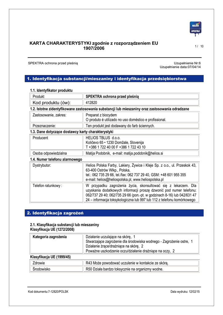 KARTA CHARAKTERYSTYKI zgodnie z rozporządzeniem EU 1907/2006 SPEKTRA ochrona przed pleśnią 1 / 10 Uzupełnienie Nr:6 Uzupełnienie data:07/04/14 1. Identyfikacja substancji/mieszaniny i identyfikacja przedsiębiorstwa 1.1. Identyfikator produktu Produkt Kod produktu (ów): SPEKTRA ochrona przed pleśnią 412820 1.2. Istotne zidentyfikowane zastosowania substancji lub mieszaniny oraz zastosowania odradzane Zastosowanie, zakres: Preparat z biocydem O produto é utilizado no uso doméstico e profissional. Przeznaczenie: Ten produkt jest dodawany do farb ściennych. 1.3. Dane dotyczące dostawcy karty charakterystyki Producent HELIOS TBLUS d.o.o. Količevo 65 • 1230 Domžale, Slovenija T +386 1 722 40 00 F +386 1 722 43 10 Osoba odpowiedzialna Matija Podobnik, e-mail: [email protected] 1.4. Numer telefonu alarmowego Dystrybutor: Helios Polska Farby, Lakiery, Żywice i Kleje Sp. z o.o., ul. Przeskok 43, 63-400 Ostrów Wlkp., Polska, tel.: 062 735 29 66, tel./fax: 062 737 29 40, GSM: +48 601 955 355 e-mail: [email protected], www.heliospolska.pl Telefon ratunkowy : W przypadku zagrożenia życia, skonsultować się z lekarzem. Dla uzyskania dodatkowych informacji proszę dzwonić pod numer telefonu: 062/737 29 40; 062/735 29 66 (pon.-pt. w godzinach 8-16) lub 042/631 47 24 – informacja toksykologiczna lub 997 lub 112 z telefonu komórkowego 2. Identyfikacja zagrożeń 2.1. Klasyfikacja substancji lub mieszaniny Klasyfikacja UE (1272/2008) Kategoria zagrożenia Klasyfikacja UE (1999/45) Zdrowie Środowisko Kod dokumentu:7-12820/POLSK Działanie uczulające na skórę, 1 Stwarzające zagrożenie dla środowiska wodnego - Zagrożenie ostre, 1 Działanie żrące/drażniące na skórę, 2 Poważne uszkodzenie oczu/działanie drażniące na oczy, 2 R43 Może powodować uczulenie w kontakcie ze skórą. R50 Działa bardzo toksycznie na organizmy wodne. Data wydruku: 12/02/15 Uzupełnienie Nr: 6 SPEKTRA ochrona przed pleśnią 2 / 10 Uzupełnienie data: 07/04/14 2.2. Elementy oznakowania Oznakowanie (UE 1999/45) Zdrowie Środowisko Xi Drazniący N Niebezpieczny dla środowiska Zawiera: 4,5-dichloro-2-octyl-2H-isothiazole-3-one; butylokarbaminian Substancje czynne: 4,5-dichloro-2-octyl-2H-isothiazole-3-one butylokarbaminian 0,81 g/l R43 R50 Fizyko-chemicznych / 3-jodo-2-propynyl 16,9 g/l; 3-jodo-2-propynyl Może powodować uczulenie w kontakcie ze skórą. Działa bardzo toksycznie na organizmy wodne. S2 Chronić przed dziećmi. S13 Nie przechowywać razem z żywnością, napojami i paszami dla zwierząt. S29 Nie wprowadzać do kanalizacji. S46 W razie połknięcia niezwłocznie zasięgnij porady lekarza – pokaż opakowanie lub etykietę. UE (1272/2008): Hasło ostrzegawcze Uwaga Zawiera: 4,5-dichloro-2-octyl-2H-isothiazole-3-one; 3-jodo-2-propynyl butylokarbaminian H315 - Działa drażniąco na skórę. H317 - Może powodować reakcję alergiczną skóry. H319 - Działa drażniąco na oczy. H400 - Działa bardzo toksycznie na organizmy wodne. P101 - W razie konieczności zasięgnięcia porady lekarza należy pokazać pojemnik lub etykietę. P102 - Chronić przed dziećmi. P261 - Unikać wdychania pyłu/dymu/gazu/mgły/par/rozpylonej cieczy. P273 - Unikać uwolnienia do środowiska. P333+P313 - W przypadku wystąpienia podrażnienia skóry lub wysypki: Zasięgnąć porady/zgłosić się pod opiekę lekarza. P501 - Usunąć Zawartość / pojemnik do uprawnionych organizacji dyspozycji. Zwroty zagrożenia (zwroty H) Środki ostróżnośći: 2.3. Inne zagrożenia Brak dostępnych danych Kod dokumentu:7-12820 Data wydruku: 12/02/15 Uzupełnienie Nr: 6 SPEKTRA ochrona przed pleśnią 3 / 10 Uzupełnienie data: 07/04/14 3. Skład/informacja o składnikach 3.2. Mieszaniny Skład chemiczny: Biocyd na bazie Biocyd i spoiwo styrenowo-akrylowe w wodzie. Nazwa chemiczna Stężenie [masa %] CAS EINECS EU INDEX REACH reg.no. Klasyfikacja UE (1999/45) Klasyfikacja (Rozporządzenie (WE) nr 1272/2008) 4,5-dichloro-2-octyl-2H-isothiazole-3one 1,0-2,5 64359-81-5 264-843-8 - Xn; R20/21 C; R34 Xi; R37 Xi; R43 N; R50 Ostry toksycznie 4; H302 Ostry toksycznie 4; H312 Oparzenie skóry 1B; H314 Może powodować reakcje alergiczne skóry 1; H317 STOT SE 3; H335 Działa bardzo toksycznie na organizmy wodne 1; H400 EUH208 3-jodo-2-propynyl butylokarbaminian 0,5-1,0 55406-53-6 259-627-5 - Xn; R20/22 Xi; R41 N; R50 Xi; R43 Xi; R37 Ostry toksycznie 3; H331 Ostry toksycznie 4; H302 Uszkodzenie oczu 1; H318 Może powodować reakcje alergiczne skóry 1; H317 STOT SE 3; H335 Działa bardzo toksycznie na organizmy wodne 1; H400 EUH208 Uwagi: Wyrób zaszeregowano na podstawie rzeczywistych zawartości składników. Zawarte w nim substancje przedstawione są w interwałach. W przypadku inspekcji (kontrola zaszeregowania) w każdej chwili możemy na żądanie inspekcji przesłać rzeczywiste zawartości poszczególnych składników. 4. Środki pierwszej pomocy 4.1. Opis środków pierwszej pomocy W przypadku dostania się w W przypadku wystąpienia wszelkich objawów wyprowadzić osobę nadmiernej ilości do dróg poszkodowaną na świeże powietrze. oddechowych: W przypadku kontaktu ze Zdjąć skażoną odzież. Przemyć skórę wodą z mydłem. Nie używać skórą: organicznych rozpuszczalników ani rozcieńczalników. W przypadku kontaktu z Przepłukać oczy wodą, aby usunąć pozostałości produktu. oczami: W przypadku połknięcia: Nie jeść. Przepłukać usta wodą. Nie wywoływać wymiotów. Kod dokumentu:7-12820 Data wydruku: 12/02/15 Uzupełnienie Nr: 6 SPEKTRA ochrona przed pleśnią 4 / 10 Uzupełnienie data: 07/04/14 5. Postępowanie w przypadku pożaru 5.1. Środki gaśnicze Pożar, środki gaśnicze: Z uwagi na brak właściwości palnych produkt nie wymaga specjalnego traktowania. Wyrób niepalny. Należy zamykać naczynia z wyrobem. Otwarty strumień wody Nieodpowiednie substancje gaśnicze: 5.2. Szczególne zagrożenia związane z substancją lub mieszaniną Metody gaszenia ognia: Nie są potrzebne 5.3. Informa