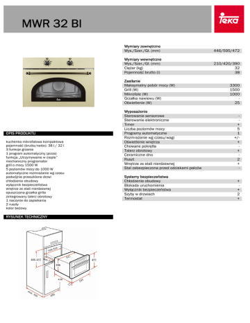 MWR 32 BI Wymiary zewnętrzne Wys./Szer./Gł. (mm) 446/595/472 Wymiary wewnętrzne Wys./Szer./Gł. (mm) Ciężar (kg) Pojemność brutto (l) 210/420/390 32 38 Zasilanie Maksymalny pobór mocy (W) Grill (W) Mikrofale (W) Grzałka nawiewu (W) Oświetlenie (W) OPIS PRODUKTU kuchenka mikrofalowa kompaktowa pojemność (brutto/netto): 38 l / 32 l 3 funkcje grzania 1 program automatyczny (pizza) funkcja „Utrzymywanie w cieple” mechaniczny programator grill o mocy 1500 W 5 poziomów mocy do 1000 W automatyczne rozmrażanie wg czasu podwójnie przeszklone drzwi chłodzenie obudowy wyłącznik bezpieczeństwa wnętrze ze stali nierdzewnej opuszczana grzałka grilla zintegrowany talerz obrotowy 1 naczynie do zapiekania 2 ruszty kolor beżowy RYSUNEK TECHNICZNY Wyposażenie Sterowanie sensorowe Sterowanie elektroniczne Timer Liczba poziomów mocy Programy automatyczne Rozmrażanie wg czasu/wagi Oświetlenie wnętrza Chowane pokrętła Talerz obrotowy Ceramiczne dno Ruszt Wnętrze ze stali nierdzewnej Stal zabezpieczona przed odciskami palców Systemy bezpieczeństwa Chłodzenie obudowy Blokada uruchomienia Wyłącznik bezpieczeństwa Szyby w drzwiach Termostat 3300 1500 1000 25 + 5 1 +/+ + 2 + + + 2 +