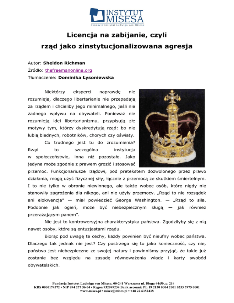 Licencja na zabijanie, czyli rząd jako zinstytucjonalizowana agresja Autor: Sheldon Richman Źródło: thefreemanonline.org Tłumaczenie: Dominika Łysoniewska Niektórzy eksperci naprawdę nie rozumieją, dlaczego libertarianie nie przepadają za rządem i chcieliby jego minimalnego, jeśli nie żadnego wpływu na obywateli. Ponieważ nie rozumieją idei libertarianizmu, przypisują złe motywy tym, którzy dyskredytują rząd: bo nie lubią biednych, robotników, chorych czy oświaty. Co trudnego jest tu do zrozumienia? Rząd w to szczególna społeczeństwie, inna niż instytucja pozostałe. Jako jedyna może zgodnie z prawem grozić i stosować przemoc. Funkcjonariusze rządowi, pod pretekstem dozwolonego przez prawo działania, mogą użyć fizycznej siły, łącznie z przemocą ze skutkiem śmiertelnym. I to nie tylko w obronie niewinnego, ale także wobec osób, które nigdy nie stanowiły zagrożenia dla nikogo, ani nie użyły przemocy. „Rząd to nie rozsądek ani elokwencja” — miał powiedzieć George Washington. — „Rząd to siła. Podobnie jak ogień, może być niebezpiecznym sługą — jak również przerażającym panem”. Nie jest to kontrowersyjna charakterystyka państwa. Zgodziłyby się z nią nawet osoby, które są entuzjastami rządu. Biorąc pod uwagę te cechy, każdy powinien być nieufny wobec państwa. Dlaczego tak jednak nie jest? Czy postrzega się to jako konieczność, czy nie, państwo jest niebezpieczne ze swojej natury i powinniśmy przyjąć, że takie już zostanie bez względu na zasadę równoważenia władz i karty swobód obywatelskich. Fundacja Instytut Ludwiga von Misesa, 00-241 Warszawa ul. Długa 44/50, p. 214 KRS 0000174572 ▪ NIP 894 277 56 04 ▪ Regon 932949234 Bank account: PL 19 2130 0004 2001 0253 7975 0001 www.mises.pl ▪ [email protected] ▪ +48 22 6352438 Jeśli jednak mówi się o rządzie w ten sposób, jest się narażonym na bycie uznanym za dziwaka, a nawet marginalizację. (Przykład: ostatnia kampania prezydencka). Nie ogranicza się to tylko do jednej strony politycznego spektrum. Zarówno postępowcy, jak i konserwatyści mają swoje ulubione obszary, w których bardzo chcieliby, żeby panowała siła rządu. Dlatego każde z nich postrzega nieufność innych jako wadę. Tak więc postępowcy, dla których prywatność jest rzekomo bardzo ważna, nie mają na przykład problemu z wtrącaniem się w najbardziej osobistą kwestię: opiekę medyczną. Tutaj ufają władzy i odrzucają racjonalne obawy przed uznaniową, biurokratyczną kontrolą nad zdrowiem i życiem. Z drugiej strony, konserwatyści, którzy propagują swobodę i wolną przedsiębiorczość, chętnie zaufają władzy w takich kwestiach jak dbanie o porządek i bezpieczeństwo na świecie, pozbywanie się nielegalnych imigrantów oraz ściganie producentów, sprzedawców i konsumentów niedozwolonych substancji. Wszyscy wychowywani jesteśmy w przekonaniu, że użycie siły jest złe (chyba że w obronie własnej). Uczono nas, że nie wolno bić, czy zabierać rzeczy innych osób. Jednak gdy już dorośliśmy, zaczęto od nas oczekiwać, że przyjmiemy za rzecz naturalną fakt, że jedna instytucja — rząd — funkcjonuje na innych zasadach. Chociaż nikt nigdy nie wyjaśnił dlaczego. Milcząca zgoda Oczywiście, jeśli będziemy niestrudzenie dociekać, dlaczego tak jest, może usłyszymy jakieś pseudowyjaśnienia. Ktoś z pewnością przywoła doktrynę milczącej zgody, według której, skoro wybrałeś egzystencję w danym miejscu, musisz zaakceptować panujące w nim reguły. Albo się dostosujesz, albo szukaj sobie innego miejsca. Jednak twierdzenie, że wszyscy zgodziliśmy się na przymus państwowy, jest niedorzeczne. Charles Johnson zastanawia się, czy w ogóle można mówić o zgodzie, skoro tak naprawdę nie ma możliwości niewyrażenia zgody. Co więcej, ten argument sugeruje, że rząd jest właścicielem kraju, w tym także twojej własności, co przesądza sprawę. Jeśli włożymy jeszcze więcej trudu, aby wyjaśnić interesującą nas kwestię odmienności rządu, ktoś podniesie kwestię demokracji. Ale, doprawdy, to wcale nie wyjaśnia problemu! Tak długo, jak żyję, wybory, które się odbywały, miały Fundacja Instytut Ludwiga von Misesa, 00-241 Warszawa ul. Długa 44/50, p. 214 KRS 0000174572 ▪ NIP 894 277 56 04 ▪ Regon 932949234 Bank account: PL 19 2130 0004 2001 0253 7975 0001 www.mises.pl ▪ [email protected] ▪ +48 22 6352438 zdecydować, kto będzie stał na czele rządu, a nie, jaki będzie jego zakres władzy i czy jakiś w ogóle będzie (to prawda, że są kandydaci, którzy obiecują zmniejszenie władzy rządu, jednak od żadnego z nich nie można tej obietnicy wyegzekwować). Fikcja reprezentacji demokratycznej raczej ma na celu ograniczenie niezadowolenia niż opisywanie rzeczywistości. Powiedzmy sobie szczerze: na przeciętny okręg wyborczy przypada ponad 600 000 mieszkańców. Opodatkowanie w zamian za reprezentację to ciągle pieśń przyszłości. Większość zgodziłaby się ze mną, że dowodem na dojrzałość i racjonalne myślenie, nie wspominając już o kompetencjach społecznych, jest świadomość, że współpracę z innymi nawiązać można tylko dzięki perswazji. Jeśli pragnie się pewnej rzeczy od innej osoby, to należy przekonać go jakimś argumentem lub złożyć ofertę. Nie można żądać, nękać czy terroryzować. Jednak mimo to tolerujemy instytucję, która na porządku dziennym żąda, nęka i terroryzuje i to w coraz szerszym zakresie. Wymaga nie tylko, żebyśmy nie krzywdzili innych i nie zawłaszczali ich dobytku. Nęka nas także, byśmy przekazywali nasze pieniądze na najróżniejsze cele. Wymaga, żebyśmy stosowali się do wciąż zmieniających się zasad odnośnie do tego, co konsumujemy, jak zarządzamy naszą opieką medyczną i w jaki sposób przeprowadzamy transakcje z innymi — nawet kim są ci inni. I coraz bardziej terroryzuje nas w swojej br