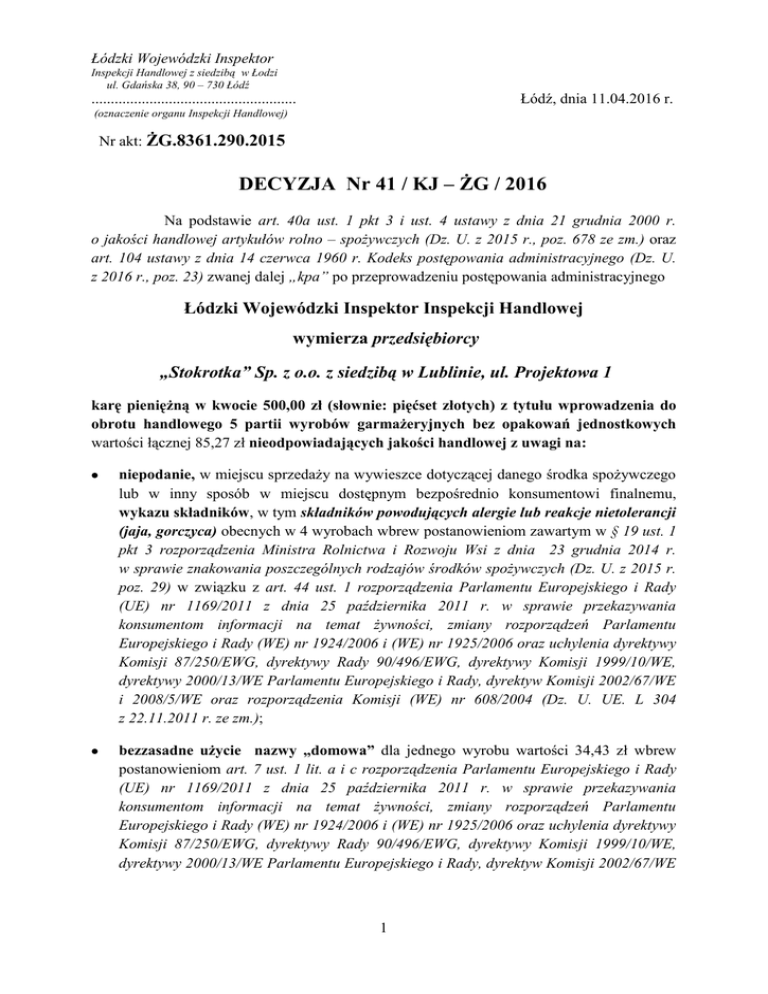 Łódzki Wojewódzki Inspektor Inspekcji Handlowej z siedzibą w Łodzi ul. Gdańska 38, 90 – 730 Łódź Łódź, dnia 11.04.2016 r. ..................................................... (oznaczenie organu Inspekcji Handlowej) Nr akt: ŻG.8361.290.2015 DECYZJA Nr 41 / KJ – ŻG / 2016 Na podstawie art. 40a ust. 1 pkt 3 i ust. 4 ustawy z dnia 21 grudnia 2000 r. o jakości handlowej artykułów rolno – spożywczych (Dz. U. z 2015 r., poz. 678 ze zm.) oraz art. 104 ustawy z dnia 14 czerwca 1960 r. Kodeks postępowania administracyjnego (Dz. U. z 2016 r., poz. 23) zwanej dalej „kpa” po przeprowadzeniu postępowania administracyjnego Łódzki Wojewódzki Inspektor Inspekcji Handlowej wymierza przedsiębiorcy „Stokrotka” Sp. z o.o. z siedzibą w Lublinie, ul. Projektowa 1 karę pieniężną w kwocie 500,00 zł (słownie: pięćset złotych) z tytułu wprowadzenia do obrotu handlowego 5 partii wyrobów garmażeryjnych bez opakowań jednostkowych wartości łącznej 85,27 zł nieodpowiadających jakości handlowej z uwagi na: niepodanie, w miejscu sprzedaży na wywieszce dotyczącej danego środka spożywczego lub w inny sposób w miejscu dostępnym bezpośrednio konsumentowi finalnemu, wykazu składników, w tym składników powodujących alergie lub reakcje nietolerancji (jaja, gorczyca) obecnych w 4 wyrobach wbrew postanowieniom zawartym w § 19 ust. 1 pkt 3 rozporządzenia Ministra Rolnictwa i Rozwoju Wsi z dnia 23 grudnia 2014 r. w sprawie znakowania poszczególnych rodzajów środków spożywczych (Dz. U. z 2015 r. poz. 29) w związku z art. 44 ust. 1 rozporządzenia Parlamentu Europejskiego i Rady (UE) nr 1169/2011 z dnia 25 października 2011 r. w sprawie przekazywania konsumentom informacji na temat żywności, zmiany rozporządzeń Parlamentu Europejskiego i Rady (WE) nr 1924/2006 i (WE) nr 1925/2006 oraz uchylenia dyrektywy Komisji 87/250/EWG, dyrektywy Rady 90/496/EWG, dyrektywy Komisji 1999/10/WE, dyrektywy 2000/13/WE Parlamentu Europejskiego i Rady, dyrektyw Komisji 2002/67/WE i 2008/5/WE oraz rozporządzenia Komisji (WE) nr 608/2004 (Dz. U. UE. L 304 z 22.11.2011 r. ze zm.); bezzasadne użycie nazwy „domowa” dla jednego wyrobu wartości 34,43 zł wbrew postanowieniom art. 7 ust. 1 lit. a i c rozporządzenia Parlamentu Europejskiego i Rady (UE) nr 1169/2011 z dnia 25 października 2011 r. w sprawie przekazywania konsumentom informacji na temat żywności, zmiany rozporządzeń Parlamentu Europejskiego i Rady (WE) nr 1924/2006 i (WE) nr 1925/2006 oraz uchylenia dyrektywy Komisji 87/250/EWG, dyrektywy Rady 90/496/EWG, dyrektywy Komisji 1999/10/WE, dyrektywy 2000/13/WE Parlamentu Europejskiego i Rady, dyrektyw Komisji 2002/67/WE 1 i 2008/5/WE oraz rozporządzenia Komisji (WE) nr 608/2004 (Dz. U. UE. L 304 z 22.11.2011 r. ze zm.). Uzasadnienie W dniach od 11 do 16 grudnia 2015 r. na podstawie upoważnienia Łódzkiego Wojewódzkiego Inspektora Inspekcji Handlowej numer ŻG.8361.290.2015 z dnia 11 grudnia 2015 r. inspektorzy Wojewódzkiego Inspektoratu Inspekcji Handlowej w Łodzi przeprowadzili kontrolę w supermarkecie „Stokrotka” 136 zlokalizowanym w Łodzi przy ul. Plantowej 1, należącym do „Stokrotka” Sp. z o.o. z siedzibą w Lublinie, ul. Projektowa 1. Kontrolę przeprowadzono na podstawie przepisów art. 3 ust. 1 - 3 rozporządzenia Parlamentu Europejskiego i Rady (WE) nr 882/2004 z dnia 29 kwietnia 2004 r. w sprawie kontroli urzędowych przeprowadzanych w celu sprawdzenia zgodności z prawem paszowym i żywnościowym oraz regułami dotyczącymi zdrowia zwierząt i dobrostanu zwierząt (Dz. U. L 165 z 30.4.2004 r. ze zm.), art. 17 ust. 3 ustawy z dnia 21 grudnia 2000 r. o jakości handlowej artykułów rolno-spożywczych (Dz. U. z 2015 r., poz. 678 ze zm.), art. 24 ust. 1 rozporządzenia Parlamentu Europejskiego i Rady (WE) nr 1935/2004 z dnia 27 października 2004 r. w sprawie materiałów i wyrobów przeznaczonych do kontaktu z żywnością oraz uchylającego dyrektywy 80/590/EWG (Dz. U. z 27.10.2004 s. 4 ze zm.) w związku z art. 3 ust. 1 pkt 6 oraz art. 3 ust. 1 pkt 1, 2 ustawy z dnia 15 grudnia 2000 r. o Inspekcji Handlowej (Dz. U. z 2014 r., poz. 148 ze zm.) w obecności osoby czynnej (…) (w dniu 11.12.2015 r.) oraz osoby upoważnionej do reprezentowania kontrolowanego przedsiębiorcy (…) (w dniach 14-16.12.2015 r.). W trakcie prowadzonych działań kontrolnych stwierdzono, że w obrocie handlowym znajdowało się 5 partii wyrobów garmażeryjnych bez opakowań jednostkowych wartości łącznej 85,27 zł zadeklarowanych w miejscu sprzedaży na wywieszkach umieszczonych bezpośrednio przy produkcie, jako: „surówka koperkowa Grześkowiak” w cenie 7,90 zł za 1 kilogram (1,55 kg), „surówka niedzielny obiad Grześkowiak” w cenie 6,90 zł za 1 kilogram (1,268 kg), „surówka wykwintny colesław Grześkowiak” w cenie 6,90 zł za 1 kilogram (1,678 kg), „surówka buraczek Grześkowiak” w cenie 6,90 zł za 1 kilogram (2,646 kg), „sałatka jarzynowa domowa Dega” w cenie 7,90 zł za 1 kilogram (4,358 kg). Oględziny miejsca sprzedaży wykazały, że wyżej wymienione wyroby garmażeryjne nie odpowiadały, pod względem oznakowania, jakości handlowej określonej w przepisach prawa żywnościowego. Opakowania zbiorcze, do których dołączone były etykiety producentów z zamieszczonymi informacjami m.in. co do składu wyrobów przechowywano w miejscu niedostępnym i niewidocznym dla konsumenta. Biorąc powyższe pod uwagę należało stwierdzić, że przedmiotowe wyroby garmażeryjne nie odpowiadały jakości handlowej z uwagi na niepodanie, w miejscu sprzedaży na wywieszce dotyczącej danego środka spożywczego lub w inny sposób, w miejscu dostępnym bezpośrednio konsumentowi finalnemu wykazu składników, w tym składników powodujących alergie lub reakcje nietolerancji (jaja, gorczyca) obecnych w 4 wyrobach wbrew postanowieniom zawartym w § 19 ust. 1 pkt 3 rozporządzenia Ministra Rolnictwa i Rozwoju Wsi z dnia 2 23 grudnia