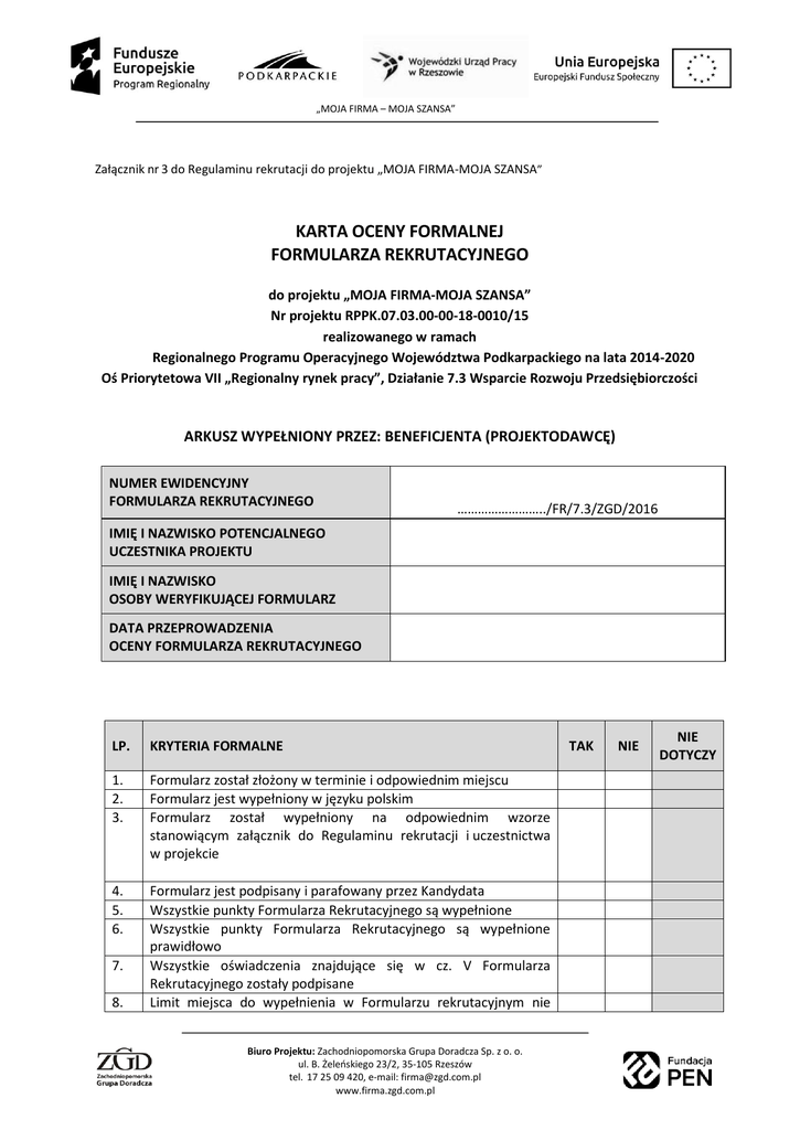 karta oceny formalnej formularza rekrutacyjnego - Moja Firma