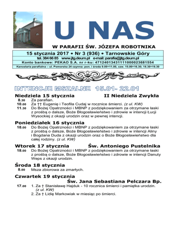 U NAS W PARAFII ŚW. JÓZEFA ROBOTNIKA 15 stycznia 2017 Nr 3 (936) Tarnowskie Góry tel. 384 66 85 www.jtg.deum.pl e-mail: [email protected] Konto bankowe: PEKAO S.A. nr r-ku: 47124013431111000023681554 Kancelaria parafialna – ul. Pomorska 24 czynna: pon. i środa 9.00÷11.00, czw. 15.00÷16.30; 18.30÷19.30 Niedziela 15 stycznia 8.30 10.00 11.30 II Niedziela Zwykła Za parafian. Za †† Eugenię i Teofila Cudaj w rocznice śmierci. (z ul. KW) Do Bożej Opatrzności i MBNP z podziękowaniem za otrzymane łaski z prośbą o dalsze, Boże Błogosławieństwo i zdrowie w intencji Łucji Wysockiej z okazji urodzin oraz w pewnej intencji. Poniedziałek 16 stycznia 18.00 Do Bożej Opatrzności i MBNP z podziękowaniem za otrzymane łaski z prośbą o dalsze, Boże Błogosławieństwo i zdrowie w intencji Aliny i Bogdana Duda z okazji urodzin oraz o Boże Błogosławieństwo dla całej rodziny. (z ul. KW) Wtorek 17 stycznia 18.00 Św. Antoniego Pustelnika Do Bożej Opatrzności i MBNP z podziękowaniem za otrzymane łaski z prośbą o dalsze, Boże Błogosławieństwo i zdrowie w intencji Danuty Weps z okazji urodzin. Środa 18 stycznia 8.00 Msza zbiorowa za zmarłych. Czwartek 19 stycznia Św. Jana Sebastiana Pelczara Bp. 17.00 1. Za † Stanisławę Hajduk - 10 rocznica śmierci i pamiątka urodzin. (z ul. KW) 2. Za † Lidię Markowiak w miesiąc po śmierci. Piątek 20 stycznia 18.00 1. Za † żonę Barbarę Wojtczak - 4 rocznica śmierci. (z ul. FI) 2. Za † Mariannę Minkus w 30 dzień po śmierci - od syna z rodziną. Sobota 21 stycznia 16.30 17.00 Niedziela 22 stycznia 8.30 10.00 11.30 Św. Agnieszki Adoracja Najświętszego Sakramentu. Za † syna Sławomira Lecha w 2 rocznicę śmierci, † ojca Michała Flodrowskiego. (z ul. KW) III Niedziela Zwykła Za † Katarzynę Krawczuk - od sąsiadów. Za † męża Alojzego Izydorczyka w 3 rocznicę śmierci, z rodziny Izydorczyk i Antończak. (z ul. SF) Za † Arkadiusza Muchla - w rocznicę śmierci oraz pamiątka urodzin. ( z ul. CB) dzisiejszą niedzielę obchodzimy Światowy Dzień Migranta i Uchodźcy. Na naszych oczach wiele rodzin przeżywa ból rozłąki z najbliższymi, którzy wyjechali w poszukiwaniu lepszej pracy i zarobków. Na naszych oczach trwa też dramat tysięcy rodzin opuszczających swoje domostwa z powodu wojen, biedy i prześladowań. Otoczmy ich dzisiaj szczególną modlitwą. Przyjmijmy też serdecznie tych, którzy wśród nas szukają lepszego życia dla siebie i najbliższych. Wykorzystajmy ten dzień, aby uczyć się rozumieć innych – oni też są ukochanymi dziećmi Bożymi, naszymi braćmi. W W najbliższych dniach Kościół wzywa nas, abyśmy spojrzeli jeszcze szerzej, poza siebie, nawet poza własną wspólnotę parafialną. Już we wtorek, 17 stycznia, obchodzimy Dzień Judaizmu. Spróbujmy tego dnia szczególnie pochylić się nad Pismem Świętym, aby tam szukać wspólnych korzeni naszej wiary i uczyć się od Abrahama, jak bez reszty zaufać Panu Bogu. W dniach od 18 do 25 stycznia w całym Kościele będzie trwał Tydzień Powszechnej Modlitw o Jedność Chrześcijan. Powszechnej, gdyż w tym samym czasie podejmują ją wszystkie Kościoły chrześcijańskie. Uczyńmy wszystko, co w naszej mocy, aby każdego dnia wypełniać polecenie Pana Jezusa: abyśmy byli jedno! Nasza osobista więź z Panem Bogiem musi przekładać się na nasze relacje z bliźnimi, zwłaszcza z braćmi w tej samej wierze. W to wielkie nawoływanie Kościoła do jedności włączmy także nasze osobiste modlitwy. Niech będą one skromnym wkładem w dzieło ekumenizmu. W sobotę, 21 stycznia, przypada Dzień Babci, a w niedzielę, 22 stycznia Dzień Dziadka. Pamiętajmy o nich i módlmy się w tych dniach za naszych kochanych dziadków, tych żyjących i tych, którzy odeszli już do Pana. Tak wiele im zawdzięczamy. Niech naszym podziękowaniem będzie modlitwa, ofiarowana Komunia św. i serdeczna pamięć. W następną sobotę 21 stycznia od godz. 12.00 kolęda dodatkowa - proszę o zgłoszenie w kancelarii bądź w zakrystii. Jeżeli ze względu na wyjazd feryjny komuś nie pasuje ten termin proszę o indywidualne zgłoszenie. Kolekta dzisiejsza i w następną niedzielę na potrzeby naszej parafii , Wyjazd na jasełka do Cieszyna w poniedziałek 23 stycznia o godz. 14. 00 sprzed kościoła. ********************************************************************** Zapowiedzi przedślubne Salomon Tomasz z Tarn.Gór – Salomon Katarzyna z Tarn.Gór. ********************************************************************** Święty Antoni Pustelnik mię Antoniego kojarzy nam się niemal zawsze z osobą św. Antoniego z Padwy, którego papież Leon XIII nazwał „świętym całego świata”. I rzeczywiście, trudno sobie wyobrazić takie miejsce na ziemi, gdzie nie byłoby poświęconych Mu kościołów, kaplic, ołtarzy czy wizerunków. Jednak 17 stycznia kościół wspomina św. Antoniego Pustelnika, zwanego też Wielkim. Mimo iż pozostaje on niejako w cieniu swego średniowiecznego imiennika, to jego wpływ na dzieje Kościoła jest ogromny. I chyba mu dobrze tam, gdzie jest. Antoni Pustelnik nigdy nie chciał znajdować się na eksponowanym miejscu, całe życie szukał odosobnienia. Ćwiczył się w ascezie, modlitwie, pokorze. Im bardziej szukał samotności, tym bardziej lgnęli do niego ludzie, naśladując jego sposób życia lub szukając u niego duchowego wsparcia. „Jesteś największym mnichem całego wschodu” – ktoś kiedyś miał powiedzieć Antoniemu. Ten zaś odparł: „Tak, wiem, już mi to powiedział szatan”. I Antoni Pustelnik urodził się ok. roku 251 w środkowym Egipcie. Wychowany w rodzinie chrześcijańskiej, nie posiadał jednak wykształcenia świeckiego. Kiedy miał 20 lat zmarli jego rodzice, Antoni zaś opiekował się młodszą siostrą. Pewnego dnia usłyszał w kościele słowa z Ewangelii św. Mateusza: „Jeżeli chcesz być doskonały, idź sprzedaj co posiadasz i rozdaj ubogim,