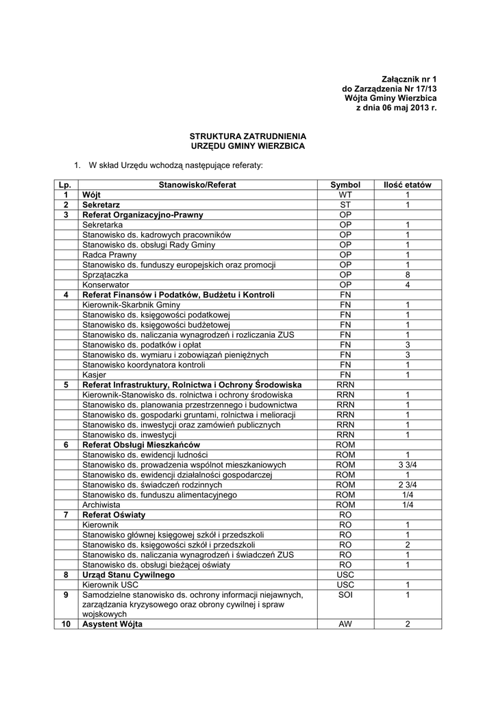 Załącznik nr 1 do Zarządzenia Nr 17/13 Wójta Gminy Wierzbica z dnia 06 maj 2013 r. STRUKTURA ZATRUDNIENIA URZĘDU GMINY WIERZBICA 1. W skład Urzędu wchodzą następujące referaty: Lp. 1 2 3 4 5 6 7 8 9 10 Stanowisko/Referat Wójt Sekretarz Referat Organizacyjno-Prawny Sekretarka Stanowisko ds. kadrowych pracowników Stanowisko ds. obsługi Rady Gminy Radca Prawny Stanowisko ds. funduszy europejskich oraz promocji Sprzątaczka Konserwator Referat Finansów i Podatków, BudŜetu i Kontroli Kierownik-Skarbnik Gminy Stanowisko ds. księgowości podatkowej Stanowisko ds. księgowości budŜetowej Stanowisko ds. naliczania wynagrodzeń i rozliczania ZUS Stanowisko ds. podatków i opłat Stanowisko ds. wymiaru i zobowiązań pienięŜnych Stanowisko koordynatora kontroli Kasjer Referat Infrastruktury, Rolnictwa i Ochrony Środowiska Kierownik-Stanowisko ds. rolnictwa i ochrony środowiska Stanowisko ds. planowania przestrzennego i budownictwa Stanowisko ds. gospodarki gruntami, rolnictwa i melioracji Stanowisko ds. inwestycji oraz zamówień publicznych Stanowisko ds. inwestycji Referat Obsługi Mieszkańców Stanowisko ds. ewidencji ludności Stanowisko ds. prowadzenia wspólnot mieszkaniowych Stanowisko ds. ewidencji działalności gospodarczej Stanowisko ds. świadczeń rodzinnych Stanowisko ds. funduszu alimentacyjnego Archiwista Referat Oświaty Kierownik Stanowisko głównej księgowej szkół i przedszkoli Stanowisko ds. księgowości szkół i przedszkoli Stanowisko ds. naliczania wynagrodzeń i świadczeń ZUS Stanowisko ds. obsługi bieŜącej oświaty Urząd Stanu Cywilnego Kierownik USC Samodzielne stanowisko ds. ochrony informacji niejawnych, zarządzania kryzysowego oraz obrony cywilnej i spraw wojskowych Asystent Wójta Symbol WT ST OP OP OP OP OP OP OP OP FN FN FN FN FN FN FN FN FN RRN RRN RRN RRN RRN RRN ROM ROM ROM ROM ROM ROM ROM RO RO RO RO RO RO USC USC SOI Ilość etatów 1 1 AW 2 1 1 1 1 1 8 4 1 1 1 1 3 3 1 1 1 1 1 1 1 1 3 3/4 1 2 3/4 1/4 1/4 1 1 2 1 1 1 1