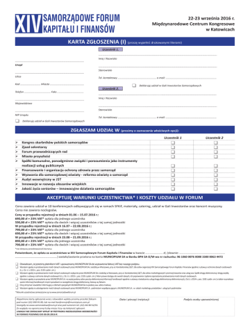 XIV samorządowe forum kapitału i finansów 22-23 września 2016 r. Międzynarodowe Centrum Kongresowe w Katowicach KARTA ZGŁOSZENIA (I) (proszę wypełnić drukowanymi literami) Uczestnik 1. ………………………………………………………………………………………… Urząd ………………………………………………………………………………………… Ulica ………………………………………………………………………………………………………………………………….…………..…………. Imię i Nazwisko ………………………………………………………………………………………………………………………………….…………..…………. Stanowisko Tel. kontaktowy ………………………………………………… e-mail: ………………………………………………………………… Kod ………………………… Miasto ..………………………………………… Telefon ………………………………… Faks ..………………………………. ………………………………………………………………………………………... Województwo ………………………………………………………………………………………... NIP Urzędu Deklaruję udział w Gali Inwestorów Samorządowych Deklaruję udział w Gali Inwestorów Samorządowych Uczestnik 2. ………………………………………………………….........................……………………………………………………………..………. Imię i Nazwisko ………………………………………………………………………………………………………………………………….…………..…………. Stanowisko Tel. kontaktowy ………………………………………………… e-mail: ………………………………………………………………… ZGŁASZAM UDZIAŁ W (prosimy o zaznaczenie właściwych opcji): Kongres skarbników polskich samorządów Zjazd sekretarzy Forum przewodniczących rad Miasto przyszłości Spółki komunalne, ponadgminne związki i porozumienia jako instrumenty realizacji usług publicznych Finansowanie i organizacja ochrony zdrowia przez samorząd Wyzwania dla samorządowej oświaty - reforma oświaty a samorząd Audyt wewnętrzny w jst Innowacje w rozwoju obszarów wiejskich Jakość życia seniorów – innowacyjne działania samorządów Uczestnik 1 Uczestnik 2 AKCEPTUJĘ WARUNKI UCZESTNICTWA* I KOSZTY UDZIAŁU W FORUM Cena zawiera udział w 10 konferencjach odbywających się w ramach SFKiF, materiały, catering, udział w Gali Inwestorów oraz koncert muzyczny. Cena nie zawiera noclegoów. Ceny w przypadku rejestracji w dniach 01.06 – 15.07.2016 r.: 690,00 zł + 23% VAT* opłata dla jednego uczestnika 590,00 zł + 23% VAT* opłata dla dwóch i więcej uczestników z tej samej jednostki W przypadku rejestracji w dniach 16.07 – 22.08.2016 r.: 790,00 zł + 23% VAT* opłata dla jednego uczestnika 690,00 zł + 23% VAT* opłata dla dwóch i więcej uczestników z tej samej jednostki W przypadku rejestracji w dniach 23.08 – 21.09.2016 r.: 890,00 zł + 23% VAT* opłata dla jednego uczestnika 790,00 zł + 23% VAT* opłata dla dwóch i więcej uczestników z tej samej jednostki *nie dotyczy przedstawicieli biznesu Potwierdzam, że opłata za uczestnictwo w XIV Samorządowym Forum Kapitału i Finansów w kwocie …………………… zł, (słownie: ……………………………………………………… ………………………………………………….) została/zostanie przelana na konto MUNICIPIUM SA w Banku BPH SA O/W-wa nr rachunku: 96 1060 0076 0000 3300 0063 4472 Oświadczam, że jesteśmy płatnikiem VAT i upoważniamy MUNICIPIUM SA do wystawienia faktury VAT bez naszego podpisu. Wyrażam zgodę na przetwarzanie moich danych osobowych przez MUNICIPIUM SA z siedzibą w Warszawie, przy ul. Konduktorskiej 18/7, dla celów organizacji XIV Samorządowego Forum Kapitału i Finansów zgodnie z ustawą o ochronie danych osobowych (t. j.: Dz. U. z 2015 r., poz. 2135 z późn. zm.). Wyrażam zgodę na przetwarzanie moich danych osobowych wyłącznie przez MUNICIPIUM SA z siedzibą w Warszawie, przy ul. Konduktorskiej 18/7, dla celów marketingowych i promocji towarów oraz usług ww. Spółki drogą elektroniczną i drogą zwykłą zgodnie z ustawą o ochronie danych osobowych (t. j.: Dz. U. z 2015 r., poz. 2135 z późn. zm.). Mam prawo dostępu do swoich danych, ich poprawiania i żądania zaprzestania przetwarzania moich danych osobowych. Wyrażam zgodę na przesyłanie przez MUNICIPIUM S.A. na wyżej podany adres poczty elektronicznej informacji handlowych zgodnie z ustawą o świadczeniu usług drogą elektroniczną elektroniczną (t.j. Dz.U. z 2014 r., poz. 1182 z późn. zm.) a także na przekazy wanie informacji handlowych innymi sposobami w szczególności drogą telefoniczną, listową czy faksem. Chcę otrzymać newsletter informujący o ofertach specjalnych MUNICIPIUM SA na podany ww. adres mailowy Wyrażam zgodę na udostępnienie moich danych osobowych przez MUNICIPIUM S.A. podmiotom współpracującym z MUNICPIUM S.A. w celach marketingu produktów i usług tych podmiotów *Warunki uczestnictwa zamieszczone są na www.samorzadoweforum.pl Wypełnione karty zgłoszenia wraz z dowodem wpłaty prosimy przesłać faksem pod numer (22) 390 91 80, lub na mail [email protected] Szczegóły na www.samorzadoweforum.pl oraz pod numerem tel. (22) 242 80 52/55. Ze względu na ograniczoną liczbę miejsc liczy się kolejność zgłoszeń. UWAGA! NIE ZWRACAMY WPŁAT W PRZYPADKU NIEZGŁOSZENIA NIEOBECNOŚCI w formie pisemnej DO 09.09.2016 R. I Data i pieczęć instytucji Podpis osoby upoważnionej