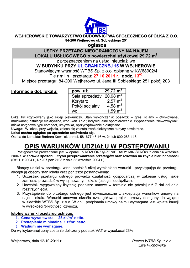 WEJHEROWSKIE TOWARZYSTWO BUDOWNICTWA SPOŁECZNEGO SPÓŁKA Z O.O. 84-200 Wejherowo ul. Sobieskiego 251 ogłasza USTNY PRZETARG NIEOGRANICZONY NA NAJEM LOKALU USŁUGOWEGO o powierzchni użytkowej 29,72 m2 z przeznaczeniem na usługi nieuciążliwe W BUDYNKU PRZY UL.GRANICZNEJ 15 W WEJHEROWIE Stanowiącym własność WTBS Sp. z o.o. opisaną w KW68902/4 T e r m i n przetargu: 27.10.2011 r. godz. 1300 Miejsce przetargu: 84-200 Wejherowo ul. Jana III Sobieskiego 251 pokój 203 Informacje dot. lokalu: pow. uż. 29,72 m2 Sala sprzedaży 20,98 m2 Korytarz 2,57 m2 Pokój socjalny 4,58 m2 wc 1,59 m2 Lokal był użytkowany jako sklep piekarniczy. Stan wykończenia: posadzki – gres; ściany – otynkowane, malowane; instalacje elektryczne, wod.-kan. i c.o.; indywidualne opomiarowanie. Wyposażenie: zlewozmywak; miska ustępowa typu compact, umywalka, oprzyrządowanie elektryczne. Uwaga: W lokalu przy wejściu, zaleca się zainstalować elektryczne kurtyny powietrzne. Lokal można oglądać po uprzednim umówieniu się. Osoba do kontaktu: Barbara Kowalska nr tel. 58- 677-46-16 w. 24 lub 600-283-148. OPIS WARUNKÓW UDZIAŁU W POSTĘPOWANIU Postępowanie prowadzone jest w oparciu o ROZPORZĄDZENIE RADY MINISTRÓW z dnia 14 września 2004 r. w sprawie sposobu i trybu przeprowadzania przetargów oraz rokowań na zbycie nieruchomości (Dz.U. z 2004 r., Nr 207 poz.2108 z dnia 22 września 2004 r.). Biorący udział w przetargu winni spełniać niżej wymienione warunki i przystępując do przetargu akceptują obecny stan lokalu oraz poniższe postanowienia: 1. Uczestnik przetargu ustnego prowadzi działalność gospodarczą w zakresie usług, jakie zamierza prowadzić w wynajmowanym lokalu (usługi nieuciążliwe). 2. Uczestnik wygrywający licytację podpisze umowę w terminie nie później niż 7 dni od dnia rozstrzygnięcia. 3. Przystąpienie do przetargu ustnego jest równoznaczne z akceptacją warunków umowy na najem lokalu. Warunki umowne określa szczegółowo projekt umowy dostępny do wglądu w siedzibie WTBS Sp. z o.o. W dniu podpisania umowy najmu wymagana jest wpłata kaucji w wysokości 3-krotności czynszu. Istotne warunki przetargu ustnego: 1. Cena wywoławcza 25 zł /m2 netto. 2. Postąpienie minimalne 1 zł/m2 netto. 3. Wadium nie wymagane. Do wylicytowanej ceny zostanie doliczony podatek VAT w wysokości 23% Wejherowo, dnia 12-10-2011 r. Prezes WTBS Sp. z o.o. Ewa Puchowska