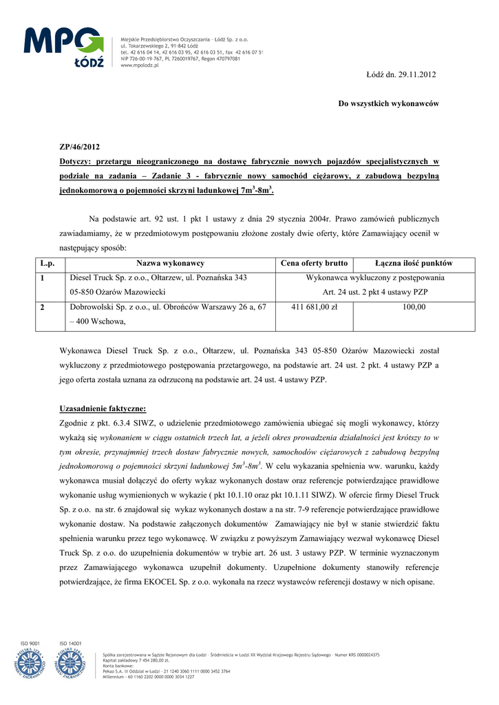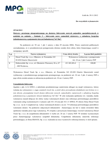 Łódź dn. 29.11.2012 Do wszystkich wykonawców ZP/46/2012 Dotyczy: przetargu nieograniczonego na dostawę fabrycznie nowych pojazdów specjalistycznych w podziale na zadania – Zadanie 3 - fabrycznie nowy samochód ciężarowy, z zabudową bezpylną jednokomorową o pojemności skrzyni ładunkowej 7m3-8m3. Na podstawie art. 92 ust. 1 pkt 1 ustawy z dnia 29 stycznia 2004r. Prawo zamówień publicznych zawiadamiamy, że w przedmiotowym postępowaniu złożone zostały dwie oferty, które Zamawiający ocenił w następujący sposób: L.p. 1 Nazwa wykonawcy Diesel Truck Sp. z o.o., Ołtarzew, ul. Poznańska 343 05-850 Ożarów Mazowiecki 2 Dobrowolski Sp. z o.o., ul. Obrońców Warszawy 26 a, 67 Cena oferty brutto Łączna ilość punktów Wykonawca wykluczony z postępowania Art. 24 ust. 2 pkt 4 ustawy PZP 411 681,00 zł 100,00 – 400 Wschowa, Wykonawca Diesel Truck Sp. z o.o., Ołtarzew, ul. Poznańska 343 05-850 Ożarów Mazowiecki został wykluczony z przedmiotowego postępowania przetargowego, na podstawie art. 24 ust. 2 pkt. 4 ustawy PZP a jego oferta została uznana za odrzuconą na podstawie art. 24 ust. 4 ustawy PZP. Uzasadnienie faktyczne: Zgodnie z pkt. 6.3.4 SIWZ, o udzielenie przedmiotowego zamówienia ubiegać się mogli wykonawcy, którzy wykażą się wykonaniem w ciągu ostatnich trzech lat, a jeżeli okres prowadzenia działalności jest krótszy to w tym okresie, przynajmniej trzech dostaw fabrycznie nowych, samochodów ciężarowych z zabudową bezpylną jednokomorową o pojemności skrzyni ładunkowej 5m3-8m3. W celu wykazania spełnienia ww. warunku, każdy wykonawca musiał dołączyć do oferty wykaz wykonanych dostaw oraz referencje potwierdzające prawidłowe wykonanie usług wymienionych w wykazie ( pkt 10.1.10 oraz pkt 10.1.11 SIWZ). W ofercie firmy Diesel Truck Sp. z o.o. na str. 6 znajdował się wykaz wykonanych dostaw a na str. 7-9 referencje potwierdzające prawidłowe wykonanie dostaw. Na podstawie załączonych dokumentów Zamawiający nie był w stanie stwierdzić faktu spełnienia warunku przez tego wykonawcę. W związku z powyższym Zamawiający wezwał wykonawcę Diesel Truck Sp. z o.o. do uzupełnienia dokumentów w trybie art. 26 ust. 3 ustawy PZP. W terminie wyznaczonym przez Zamawiającego wykonawca uzupełnił dokumenty. Uzupełnione dokumenty stanowiły referencje potwierdzające, że firma EKOCEL Sp. z o.o. wykonała na rzecz wystawców referencji dostawy w nich opisane. Wymienione referencje zostały przedstawione w formie kopii potwierdzonych za zgodność z oryginałem przez Pana Wojciecha Mileja działającego jako pełnomocnik firmy Diesel Truck Sp. z o.o. natomiast brak jest w złożonych dokumentach umocowania dla Pana Wojciecha Mileja do działania w imieniu firmy EKOCEL Sp. z o.o. Zgodnie z pkt. 11.6 SIWZ, w przypadku podmiotów udostępniających swój potencjał i biorących udział w realizacji zamówienia, kopie dokumentów dotyczących tych podmiotów muszą być poświadczane za zgodność z oryginałem przez podmiot, którego dokumenty dotyczą. Obowiązek potwierdzania za zgodność z oryginałem dokumentów przez podmioty, które udostępniają swój potencjał i biorą udział w realizowaniu zamówienia, w tym referencji, wynika z § 6 ust. 2 ROZPORZĄDZENIA PREZESA RADY MINISTRÓW z dnia 30 grudnia 2009 r. w sprawie rodzajów dokumentów, jakich może żądać zamawiający od wykonawcy, oraz form, w jakich te dokumenty mogą być składane. W złożonej przez Państwa ofercie, powołaliście się Państwo na potencjał wiedzy i doświadczenia firmy EKOCEL Sp. z o.o., która to firma została wskazana jako podwykonawca i to osoba umocowana do działania w imieniu firmy EKOCEL Sp. z o.o. powinna potwierdzić zgodność z oryginałem przedłożonych, w wyniku uzupełnienia, referencji. Biorąc powyższe pod uwagę należy stwierdzić, że wykonawca firma Diesel Truck Sp. z o.o. jako wykonawca ubiegający się o udzielenie przedmiotowego zamówienia nie wykazał faktu spełnienia warunku wiedzy i doświadczenia i podlega wykluczeniu z przedmiotowego postępowania przetargowego, na podstawie art. 24 ust. 2 pkt. 4 ustawy PZP. Za najkorzystniejszą ofertę z punktu widzenia kryterium oceny ofert uznana została oferta firmy: Dobrowolski Sp. z o.o. ul. Obrońców Warszawy 26 a 67 – 400 Wschowa Informujemy, że Zamawiający podpisanie umowy zaplanował na 10.12.2012.