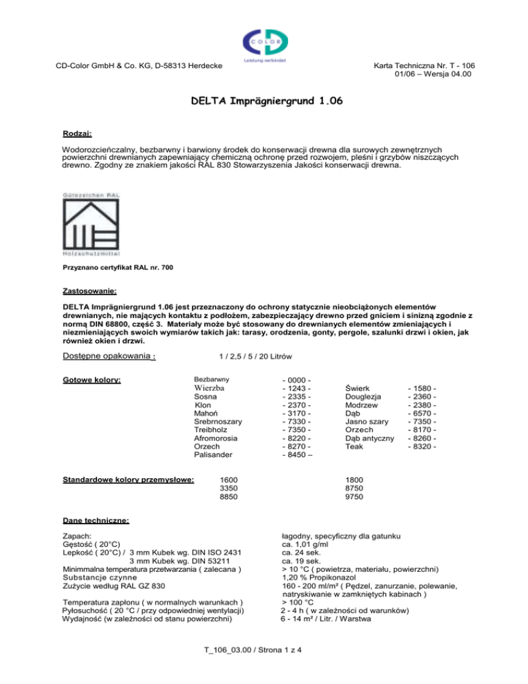 CD-Color GmbH & Co. KG, D-58313 Herdecke Karta Techniczna Nr. T - 106 01/06 – Wersja 04.00 DELTA Imprägniergrund 1.06 Rodzaj: Wodorozcieńczalny, bezbarwny i barwiony środek do konserwacji drewna dla surowych zewnętrznych powierzchni drewnianych zapewniający chemiczną ochronę przed rozwojem, pleśni i grzybów niszczących drewno. Zgodny ze znakiem jakości RAL 830 Stowarzyszenia Jakości konserwacji drewna. Przyznano certyfikat RAL nr. 700 Zastosowanie: DELTA Imprägniergrund 1.06 jest przeznaczony do ochrony statycznie nieobciążonych elementów drewnianych, nie mających kontaktu z podłożem, zabezpieczający drewno przed gniciem i sinizną zgodnie z normą DIN 68800, część 3. Materiały może być stosowany do drewnianych elementów zmieniających i niezmieniających swoich wymiarów takich jak: tarasy, orodzenia, gonty, pergole, szalunki drzwi i okien, jak również okien i drzwi. Dostępne opakowania : Gotowe kolory: 1 / 2,5 / 5 / 20 Litrów Bezbarwny Wierzba Sosna Klon Mahoń Srebrnoszary Treibholz Afromorosia Orzech Palisander Standardowe kolory przemysłowe: - 0000 - 1243 - 2335 - 2370 - 3170 - 7330 - 7350 - 8220 - 8270 - 8450 – 1600 3350 8850 Świerk Douglezja Modrzew Dąb Jasno szary Orzech Dąb antyczny Teak - 1580 2360 2380 6570 7350 8170 8260 8320 - 1800 8750 9750 Dane techniczne: Zapach: Gęstość ( 20°C) Lepkość ( 20°C) / 3 mm Kubek wg. DIN ISO 2431 3 mm Kubek wg. DIN 53211 Minimmalna temperatura przetwarzania ( zalecana ) Substancje czynne Zużycie według RAL GZ 830 Temperatura zapłonu ( w normalnych warunkach ) Pyłosuchość ( 20 °C / przy odpowiedniej wentylacji) Wydajność (w zależności od stanu powierzchni) łagodny, specyficzny dla gatunku ca. 1,01 g/ml ca. 24 sek. ca. 19 sek. > 10 °C ( powietrza, materiału, powierzchni) 1,20 % Propikonazol 160 - 200 ml/m² ( Pędzel, zanurzanie, polewanie, natryskiwanie w zamkniętych kabinach ) > 100 °C 2 - 4 h ( w zależności od warunków) 6 - 14 m² / Litr. / Warstwa T_106_03.00 / Strona 1 z 4 Przygotowanie powierzchni: Drewno musi zostać oczyszczone z kurzu, odtłuszczone i wolne od wszelkiego rodzaju zanieczyszczeń mechanicznych. Wilgotność drewna nie powinna być mniejsza niż 8% i nie większa niż 18%. W zależności od przeznaczenia materiału należy postępować zgodnie z wytycznymi odnośnie wilgotności i jakości obrabianego materiału. Właściwości: DELTA Imprägniergrund 1.06 poprzez wnikanie w głąb zabezpieczanej powierzchni oraz własciwości impregnujące zabezpiecza malowaną powierzchnię przed odbarwianiem się powierzchni oraz przed rozwojem grzybów i pleśni niszczących drewno. Właściwości te zostały potwierdzone poprzez przyznanie znaku jakości RAL 830 Stowarzyszenia Jakości drewna na podstawie kontroli wewnętrznych i zewnętrznych przeprowadzonych przez Instytut Fraunhofera Wilhelm – Klauditz w Brunszwiku. DELTA Imprägniergrund 1.06 poprawia przyczepność kolejnych warstw nanoszonych na dany materiał i jest wykorzystywany wyłącznie do powierzchni zewnętrznych jako podkład dla następnych warstw. Bardzo dobrze nadaje się do zastosowania na drewnie tropikalnym. Z powodu różnych właściwości drewna w odniesieniu np. do składników, absorpcja stanowi podstawę do zalecenia i wyjaśnienia wprowadzenia chemicznej ochrony drewna. Magazynowanie: Opakowania muszą być składowane w suchym i chłodnym miejscu. Otwarte pojemniki należy szczelnie zmaknąć po użyciu. Oryginalnie zamknięte pojemniki nadają się do użycia przez okres co najmniej 6 miesięcy. Materiał nie może dostać się do sieci kanalizacyjnej. Musi zostać odpowiednio zutylizowany. Przetwarzanie: DELTA Imprägniergrund1.06 musi być dokładnie wymieszany przed użyciem. DELTA Imprägniergrund 1.06 może być nanoszony pędzlem, przez zanurzanie, polewanie lub przez malowanie natryskowe (w odpowiednich systemach zamkniętych). Inne metody aplikacji nie są dozwolone ze względu na zwiększoną chłonność powierzchni drewnianych. Jeżeli do zabezpieczenie powierzchni drewnianej używasz barwionych produktów możesz usprawnić proces impregnacji przez zanurzenie lub polewanie dzięki wymieszanie produktów barwionych z bezbarwnymi. Suche narzędzia można czyść używając rozcieńczalnika uniwersalnego, benzyny lub rozcieńczalnika nitrocelulozowego. Podczas procesu czyszczenia należy sprawdzić jaki wpływ ma czyściwo na materiał z którego wykonane jest czyszczone narzędzie. Materiał płynny (DELTA Imprägniergrund 1.06) może być rozcieńczany wyłącznie za zgodną producenta i tylko z użyciem wody pitnej aby zapobiec redukcji substancji czynnych oraz nie zmienić właściwości produktu. Nie można usuwać produktu oraz pozostałości po czyszczeniu narzędzi do ścieków. Zużycie: Zużycie w dużej mierze zależy od chłonności i wilgotności malowanego podłoża oraz rodzaju prac budowlanych. 2 Niezależnie od wyżej wymienionych czynników, zużycie jest szacowane od 50 do 120 ml/m , co odpowiada 2 powierzchni ok. 8 – 20 m . Działanie przeciw grzybom i szkodnikom niszczącym drewno jest na podstawie rejestracji 2 160 – 200 g/m . Występuje w jednej z trzech podstawowych aplikacji na przetwarzanie i obróbkę kolejnych. Aby osiągną większą ilość substancji czynnych wskazane jest stosowanie kolejnej warstwy w systemie mokro na mokro lub dłużej trzymać materiał zanurzony. Suszenie: Pyłosuchość uzyskiwana jest zwykle po 2 – 4 godzinach. Nanoszenie kolejnych powłok z materiałów rozpuszczalnikowych lub na bazie wody może nastąpić po upływie 6 – 8 godzin. Nieodpowiednie warunki np. duża wilgotność, niskie temperatury, niedostateczna cyrkulacja powietrza może wpłynąć negatywnie na czas schnięcia. T_106_03.00 / Strona 2 z 4 Dalsza obróbka: Na DELTA Imprägniergrund 1.06 może być nanoszona kolejna powłoka ze wszystkich dostępnych na rynku bejc, farb i farb nawierzchniowych rozpuszczalnikowych lub wodnych, muszy być tylko dotrzyma