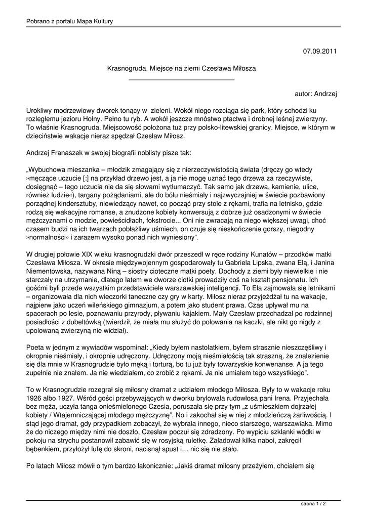 Pobrano z portalu Mapa Kultury 07.09.2011 Krasnogruda. Miejsce na ziemi Czesława Miłosza ____________________________ autor: Andrzej Urokliwy modrzewiowy dworek tonący w zieleni. Wokół niego rozciąga się park, który schodzi ku rozległemu jezioru Hołny. Pełno tu ryb. A wokół jeszcze mnóstwo ptactwa i drobnej leśnej zwierzyny. To właśnie Krasnogruda. Miejscowość położona tuż przy polsko-litewskiej granicy. Miejsce, w którym w dzieciństwie wakacje nieraz spędzał Czesław Miłosz. Andrzej Franaszek w swojej biografii noblisty pisze tak: „Wybuchowa mieszanka – młodzik zmagający się z nierzeczywistością świata (dręczy go wtedy »męczące uczucie [:] na przykład drzewo jest, a ja nie mogę uznać tego drzewa za rzeczywiste, dosięgnąć – tego uczucia nie da się słowami wytłumaczyć. Tak samo jak drzewa, kamienie, ulice, również ludzie«), targany pożądaniami, ale do bólu nieśmiały i najzwyczajniej w świecie pozbawiony porządnej kindersztuby, niewiedzący nawet, co począć przy stole z rękami, trafia na letnisko, gdzie rodzą się wakacyjne romanse, a znudzone kobiety konwersują z dobrze już osadzonymi w świecie mężczyznami o modzie, powieścidłach, fokstrocie... Oni nie zwracają na niego większej uwagi, choć czasem budzi na ich twarzach pobłażliwy uśmiech, on czuje się nieskończenie gorszy, niegodny »normalności» i zarazem wysoko ponad nich wyniesiony”. W drugiej połowie XIX wieku krasnogrudzki dwór przeszedł w ręce rodziny Kunatów – przodków matki Czesława Miłosza. W okresie międzywojennym gospodarowały tu Gabriela Lipska, zwana Elą, i Janina Niementowska, nazywana Niną – siostry cioteczne matki poety. Dochody z ziemi były niewielkie i nie starczały na utrzymanie, dlatego latem we dworze ciotki prowadziły coś na kształt pensjonatu. Ich gośćmi byli przede wszystkim przedstawiciele warszawskiej inteligencji. To Ela zajmowała się letnikami – organizowała dla nich wieczorki taneczne czy gry w karty. Miłosz nieraz przyjeżdżał tu na wakacje, najpierw jako uczeń wileńskiego gimnazjum, a potem jako student prawa. Czas upływał mu na spacerach po lesie, poznawaniu przyrody, pływaniu kajakiem. Mały Czesław przechadzał po rodzinnej posiadłości z dubeltówką (twierdził, że miała mu służyć do polowania na kaczki, ale nikt go nigdy z upolowaną zwierzyną nie widział). Poeta w jednym z wywiadów wspominał: „Kiedy byłem nastolatkiem, byłem strasznie nieszczęśliwy i okropnie nieśmiały, i okropnie udręczony. Udręczony moją nieśmiałością tak straszną, że znalezienie się dla mnie w Krasnogrudzie było męką i torturą, bo tu już były towarzyskie konwenanse. A ja tego zupełnie nie znałem. Ja nie wiedziałem, co zrobić z rękami. Ja nie umiałem tego wszystkiego”. To w Krasnogrudzie rozegrał się miłosny dramat z udziałem młodego Miłosza. Były to w wakacje roku 1926 albo 1927. Wśród gości przebywających w dworku brylowała rudowłosa pani Irena. Przyjechała bez męża, uczyła tanga onieśmielonego Czesia, poruszała się przy tym „z uśmieszkiem dojrzałej kobiety / Wtajemniczającej młodego mężczyznę”. No i zakochał się w niej z młodzieńczą żarliwością. I stąd jego dramat, gdy przypadkiem zobaczył, że wybrała innego, nieco starszego, warszawiaka. Mimo że do niczego między nimi nie doszło, Czesław poczuł się zdradzony. Po wypiciu szklanki wódki w pokoju na strychu postanowił zabawić się w rosyjską ruletkę. Załadował kilka naboi, zakręcił bębenkiem, przyłożył lufę do skroni, nacisnął spust i… nic się nie stało. Po latach Miłosz mówił o tym bardzo lakonicznie: „Jakiś dramat miłosny przeżyłem, chciałem się strona 1 / 2 Pobrano z portalu Mapa Kultury zastrzelić. (...) Jakieś wielkie samotności, wielkie udręki (...). Zresztą Krasnogruda jest dla mnie miejscem bardzo wielu sprzecznych przeżyć”. A w wierszu Powrót pisał tak: „W starości wybrałem się do miejsc, po których błądziła moja wczesna młodość. Rozpoznałem zapachy, linie polodowcowych pagórków, owalne misy jezior. Przedzierałem się gąszczem tam, gdzie kiedyś był park, ale nie znalazłem śladów alei. Stanąłem nad wodą i tak jak wtedy lekko łuszczyła się fala, niepojęta identyczność, niepojęte oddzielenie. A jednak nie zaprę się ciebie, nieszczęsny młodziku i powodów twoich cierpień nie nazwę głupimi”. Wakacje w Krasnogrudzie zaowocowały także kilkoma wczesnymi utworami. Tu powstały wiersze: Wieczorem wiatr (1934) i Ptaki (1935), Pieśń, dedykowana ciotce Gabrieli – wszystkie te utwory znalazły się potem w tomie Trzy zimy z 1936 roku. Przez lata różne były losy krasnogrudzkiego majątku, ale dwór głównie niszczał. W 2011 roku dzięki działalność Fundacji Pogranicze z Sejn udało się przywrócić mu świetność. Dziś mieści się w nim Międzynarodowe Centrum Dialogu. Zdjęcia w Galerii autorstwa Michała Moniuszki udostępniamy dzięki uprzejmości Ośrodka "Pogranicze - sztuk, kultur, narodów" oraz Fundacji Pogranicze z Sejn: http://pogranicze.sejny.pl. strona 2 / 2