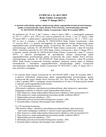 UCHWAŁA Nr 46/V/2015 Rady Gminy Lesznowola z dnia 17 lutego 2015 r. w sprawie uchwalenia zmiany miejscowego planu zagospodarowania przestrzennego gminy Lesznowola dla części obrębu Nowa Iwiczna, zatwierdzonego uchwałą Nr 261/XXXIV/05 Rady Gminy Lesznowola z dnia 30 września 2005 r. Na podstawie art. 18 ust. 2 pkt 5 ustawy z dnia 8 marca 1990 r. o samorządzie gminnym (t.j. Dz. U. z 2013 r. poz. 594 ze zm.) oraz na podstawie art. 20 ust. 1 i art. 27 ustawy z dnia 27 marca 2003 r. o planowaniu i zagospodarowaniu przestrzennym (t.j. Dz. U. z 2012 r. poz. 647 ze zm.) w związku z uchwałą Nr 540/XLII/2014 Rady Gminy Lesznowola z dnia 17 czerwca 2014 r. w sprawie przystąpienia do sporządzenia zmiany miejscowego planu zagospodarowania przestrzennego gminy Lesznowola dla części obrębu Nowa Iwiczna, zatwierdzonego uchwałą Nr 261/XXXIV/05 Rady Gminy Lesznowola z dnia 30 września 2005r. zmienioną uchwałą Nr 45/V/2015 Rady Gminy Lesznowola z dnia 17 lutego 2015 r. w sprawie zmiany uchwały Nr 540/XLII/2014 Rady Gminy Lesznowola z dnia 17 czerwca 2014 r. w sprawie przystąpienia do sporządzenia zmiany miejscowego planu zagospodarowania przestrzennego gminy Lesznowola dla części obrębu Nowa Iwiczna, zatwierdzonego uchwałą Nr 261/XXXIV/05 Rady Gminy Lesznowola z dnia 30 września 2005r. Rada Gminy Lesznowola stwierdza zgodność niniejszej zmiany planu ze Studium uwarunkowań i kierunków zagospodarowania przestrzennego gminy Lesznowola zatwierdzonym uchwałą Rady Gminy Lesznowola Nr 30/IV/2011 z dnia 15 marca 2011 r. oraz uchwala co następuje: § 1. 1. W uchwale Rady Gminy Lesznowola Nr 261/XXXIV/2005 z dnia 30 września 2005 r. w sprawie uchwalenia miejscowego planu zagospodarowania przestrzennego gminy Lesznowola dla części obrębu Nowa Iwiczna (Dz. Urz. Woj. Mazow. Nr 265, poz. 8658 z dnia 5 grudnia 2005 r.) następuje zmiana brzemienia § 43 oraz § 59 dotyczących ustaleń w zakresie zasad zagospodarowania terenu. 1) § 43 otrzymuje brzmienie: „Dla terenów zabudowy mieszkaniowej jednorodzinnej plan miejscowy wprowadza następujące ustalenia w zakresie zasad zagospodarowania terenu: 1. Plan miejscowy ustala maksymalną intensywność zabudowy netto na poziomie 0,5. 2. Plan miejscowy ustala minimalną powierzchnię działki wielkości 800 m2. 3. Maksymalny procent zabudowy - 25%. 4. Minimalny procent powierzchni biologicznie czynnej - 50%. 5. Rysunek planu wskazuje obowiązujące linie zabudowy”. 2) § 59 otrzymuje brzmienie: „Dla terenów usług i zabudowy mieszkaniowej jednorodzinnej plan miejscowy wprowadza następujące ustalenia w zakresie zasad zagospodarowania terenu: 1. Plan miejscowy ustala maksymalną intensywność zabudowy netto na poziomie 0,5. 2. Plan miejscowy ustala minimalną powierzchnię działki wielkości 800 m2. 3. Maksymalny procent zabudowy - 25% 4. Minimalny procent powierzchni biologicznie czynnej - 50% 5. Rysunek planu wskazuje obowiązujące linie zabudowy”. 2. Załącznikami do niniejszej uchwały, nie będącymi ustaleniami planu są: 1) rozstrzygniecie o sposobie rozpatrzenia uwag złożonych do projektu miejscowego planu zagospodarowania przestrzennego, stanowiące załącznik nr 1 do uchwały, 2) rozstrzygnięcie o sposobie realizacji, zapisanych w planie, inwestycji z zakresu infrastruktury technicznej, które należą do zadań własnych gminy, oraz zasadach ich finansowania, stanowiące załącznik nr 2 do uchwały. § 2. Pozostałe ustalenia uchwały Rady Gminy Lesznowola Nr 261/XXXIV/2005 z dnia 30 września 2005 r. w sprawie uchwalenia miejscowego planu zagospodarowania przestrzennego gminy Lesznowola dla części obrębu Nowa Iwiczna pozostają bez zmian. § 3. Wykonanie uchwały powierza się Wójtowi Gminy. § 4. Uchwała wchodzi w życie po upływie 14 dni od dnia jej ogłoszenia w Dzienniku Urzędowym Województwa Mazowieckiego. Przewodniczący Rady Gminy Lesznowola
