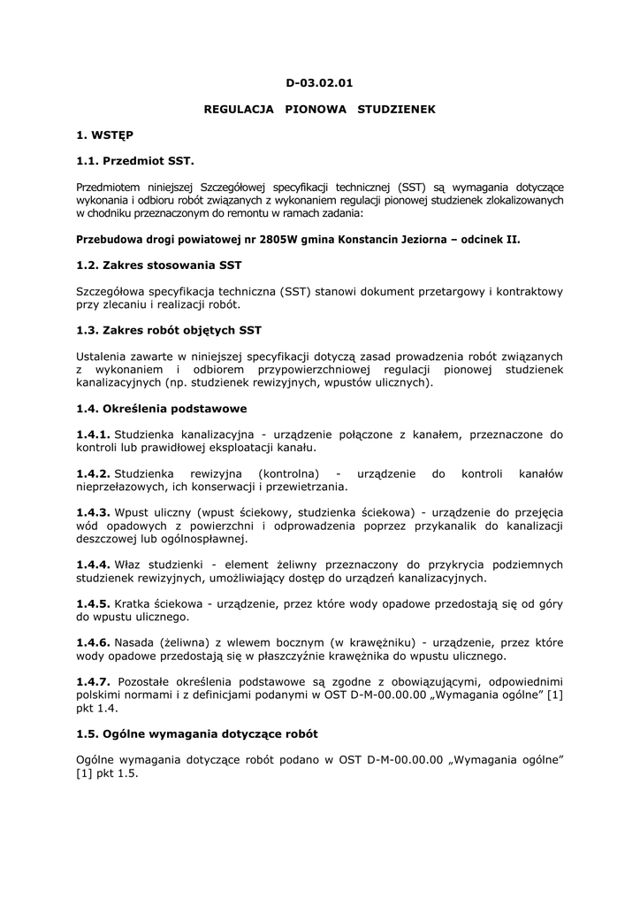 D-03.02.01 REGULACJA PIONOWA STUDZIENEK 1. WSTĘP 1.1. Przedmiot SST. Przedmiotem niniejszej Szczegółowej specyfikacji technicznej (SST) są wymagania dotyczące wykonania i odbioru robót związanych z wykonaniem regulacji pionowej studzienek zlokalizowanych w chodniku przeznaczonym do remontu w ramach zadania: Przebudowa drogi powiatowej nr 2805W gmina Konstancin Jeziorna – odcinek II. 1.2. Zakres stosowania SST Szczegółowa specyfikacja techniczna (SST) stanowi dokument przetargowy i kontraktowy przy zlecaniu i realizacji robót. 1.3. Zakres robót objętych SST Ustalenia zawarte w niniejszej specyfikacji dotyczą zasad prowadzenia robót związanych z wykonaniem i odbiorem przypowierzchniowej regulacji pionowej studzienek kanalizacyjnych (np. studzienek rewizyjnych, wpustów ulicznych). 1.4. Określenia podstawowe 1.4.1. Studzienka kanalizacyjna - urządzenie połączone z kanałem, przeznaczone do kontroli lub prawidłowej eksploatacji kanału. 1.4.2. Studzienka rewizyjna (kontrolna) urządzenie nieprzełazowych, ich konserwacji i przewietrzania. do kontroli kanałów 1.4.3. Wpust uliczny (wpust ściekowy, studzienka ściekowa) - urządzenie do przejęcia wód opadowych z powierzchni i odprowadzenia poprzez przykanalik do kanalizacji deszczowej lub ogólnospławnej. 1.4.4. Właz studzienki - element żeliwny przeznaczony do przykrycia podziemnych studzienek rewizyjnych, umożliwiający dostęp do urządzeń kanalizacyjnych. 1.4.5. Kratka ściekowa - urządzenie, przez które wody opadowe przedostają się od góry do wpustu ulicznego. 1.4.6. Nasada (żeliwna) z wlewem bocznym (w krawężniku) - urządzenie, przez które wody opadowe przedostają się w płaszczyźnie krawężnika do wpustu ulicznego. 1.4.7. Pozostałe określenia podstawowe są zgodne z obowiązującymi, odpowiednimi polskimi normami i z definicjami podanymi w OST D-M-00.00.00 „Wymagania ogólne” [1] pkt 1.4. 1.5. Ogólne wymagania dotyczące robót Ogólne wymagania dotyczące robót podano w OST D-M-00.00.00 „Wymagania ogólne” [1] pkt 1.5. 2. MATERIAŁY 2.1. Ogólne wymagania dotyczące materiałów Ogólne wymagania dotyczące materiałów, ich pozyskiwania i składowania, podano w OST D-M-00.00.00 „Wymagania ogólne” [1] pkt 2. 2.2. Materiały do kanalizacyjnej wykonania regulacji pionowej uszkodzonej studzienki Do przypowierzchniowej regulacji studzienki należy użyć: a) materiały otrzymane z rozbiórki studzienki oraz z rozbiórki otaczającej nawierzchni, nadające się do ponownego wbudowania, b) materiały nowe, będące materiałem uzupełniającym, tego samego typu, gatunku i wymiarów, jak materiał rozbiórkowy, odpowiadające wymaganiom: OST D-03.02.01 [2] w przypadku materiałów do naprawy studzienki, OST, wymienionych w punkcie 5.6 niniejszej specyfikacji, w przypadku materiałów potrzebnych do ułożenia nowej nawierzchni. 3. SPRZĘT 3.1. Ogólne wymagania dotyczące sprzętu Ogólne wymagania dotyczące sprzętu podano w OST D-M-00.00.00 „Wymagania ogólne” [1] pkt 3. 3.2. Sprzęt stosowany do wykonania regulacji pionowej studzienki Wykonawca przystępujący do wykonania możliwością korzystania z następującego sprzętu: naprawy, powinien wykazać się piły tarczowej, młota pneumatycznego, sprężarki powietrza, dźwigu samochodowego, zagęszczarki wibracyjnej, sprzętu pomocniczego (szczotka, łopata, szablon itp.). 4. TRANSPORT 4.1. Ogólne wymagania dotyczące transportu Ogólne wymagania dotyczące „Wymagania ogólne” [1] pkt 4. transportu podano w OST D-M-00.00.00 4.2. Transport materiałów Transport nowych materiałów do wykonania naprawy, powinien odpowiadać wymaganiom określonym w: a) OST D-03.02.01 [2], w przypadku materiałów do naprawy studzienki, b) OST, wymienionych w pkcie 5.6 niniejszej specyfikacji, w przypadku materiałów wykorzystywanych do wykonania nowej nawierzchni. 5. WYKONANIE ROBÓT 5.1. Ogólne zasady wykonania robót Ogólne zasady wykonania robót podano w OST D-M-00.00.00 „Wymagania ogólne” [1] pkt 5. 5.2. Uszkodzenia zapadniętych studzienek, podlegające naprawie Uszkodzenie studzienek urządzeń podziemnych występuje, gdy różnica poziomów pomiędzy: włazem studzienki a górną powierzchnią nawierzchni wynosi powyżej 1 cm. 5.3. Zasady wykonania naprawy Wykonanie naprawy polegającej na regulacji pionowej studzienki, obejmuje: 1. roboty przygotowawcze rozpoznanie uszkodzenia, wyznaczenie powierzchni podlegającej naprawie, 2. wykonanie naprawy naprawę uszkodzonej studzienki, ułożenie nowej nawierzchni. 5.4. Roboty przygotowawcze Rozpoznanie uszkodzenia polega na: ustaleniu sposobu deformacji studzienki, określeniu stanu nawierzchni w bezpośrednim otoczeniu studzienki, wstępnym rozpoznaniu przyczyn uszkodzenia, rozeznaniu możliwości wykorzystania dotychczasowych elementów urządzenia. Powierzchnia przeznaczona do wykonania naprawy powinna obejmować cały obszar uszkodzonej nawierzchni wokół zapadniętej studzienki. Powierzchni tej należy nadać kształt prostokątnej figury geometrycznej. 5.5. Wykonanie naprawy uszkodzonej studzienki Jeżeli dokumentacja projektowa lub SST nie przewiduje inaczej, to wykonanie przypowierzchniowej naprawy uszkodzonej studzienki, pod warunkiem zaakceptowania przez przedstawiciela Zamawiającego obejmuje: 1. zdjęcie przykrycia (pokrywy, włazu, kratki ściekowej, nasady z wlewem bocznym) urządzenia podziemnego, 2. rozebranie uszkodzonej nawierzchni wokół studzienki: ręczne (dłutami, haczykami z drutu, młotkami brukarskimi, ew. drągami stalowymi itp. - w przypadku nawierzchni typu kostkowego), mechaniczne (w przypadku nawierzchni typu monolitycznego, np. nawierzchni asfaltowej, betonowej) - z pionowym wycięciem krawędzi uszkodzenia piłą tarczową i rozebraniem konstrukcji jezdni przy pomocy młotów pneumatycznych, drągów stalowych itp., 3. rozebranie uszkodzonej górnej części studzienki (np. żelbetowych pod studzienką, kręgów podporowych itp.), części 