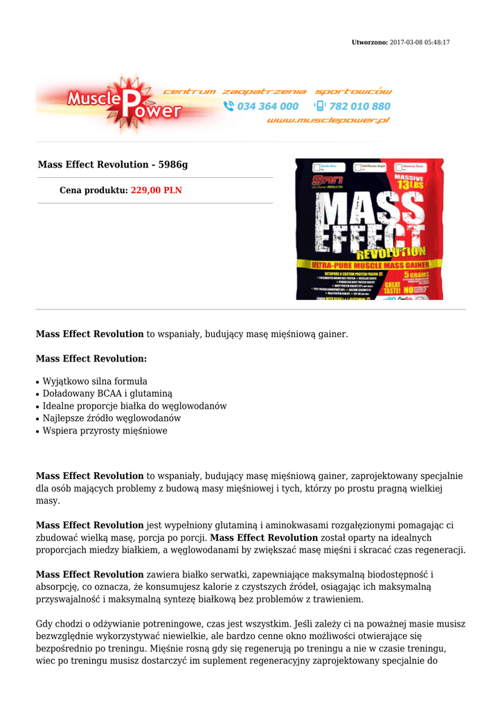Utworzono: 2017-03-08 05:48:17 Mass Effect Revolution - 5986g Cena produktu: 229,00 PLN Mass Effect Revolution to wspaniały, budujący masę mięśniową gainer. Mass Effect Revolution: ● ● ● ● ● Wyjątkowo silna formuła Doładowany BCAA i glutaminą Idealne proporcje białka do węglowodanów Najlepsze źródło węglowodanów Wspiera przyrosty mięśniowe Mass Effect Revolution to wspaniały, budujący masę mięśniową gainer, zaprojektowany specjalnie dla osób mających problemy z budową masy mięśniowej i tych, którzy po prostu pragną wielkiej masy. Mass Effect Revolution jest wypełniony glutaminą i aminokwasami rozgałęzionymi pomagając ci zbudować wielką masę, porcja po porcji. Mass Effect Revolution został oparty na idealnych proporcjach miedzy białkiem, a węglowodanami by zwiększać masę mięśni i skracać czas regeneracji. Mass Effect Revolution zawiera białko serwatki, zapewniające maksymalną biodostępność i absorpcję, co oznacza, że konsumujesz kalorie z czystszych źródeł, osiągając ich maksymalną przyswajalność i maksymalną syntezę białkową bez problemów z trawieniem. Gdy chodzi o odżywianie potreningowe, czas jest wszystkim. Jeśli zależy ci na poważnej masie musisz bezwzględnie wykorzystywać niewielkie, ale bardzo cenne okno możliwości otwierające się bezpośrednio po treningu. Mięśnie rosną gdy się regenerują po treningu a nie w czasie treningu, wiec po treningu musisz dostarczyć im suplement regeneracyjny zaprojektowany specjalnie do budowania masy mięśniowej. Mass Effect Revolution jest dokładnie tym czego ci trzeba. Oto dlaczego: Mass Effect Revolution został zaprojektowany by wstrzeliwać stymulujące wzrost mięśni białko i węglowodany prosto do mięśni by zapewnić im gwałtowny wzrost w pierwszej fazie po treningu. Specjalna mieszanka węglowodanów pochodzących z zastrzeżonego źródła. Czemu? Ponieważ dostarcza ona zarówno krótko jak i długołańcuchowe cząsteczki węglowodanów. Krótkie łańcuchy są wchłaniane natychmiast zaś długie wolniej, zapewniając mięśniom stały przypływ czystych węglowodanów w obu fazach anabolicznych regeneracji. Wtedy kolejna fala białka zostaje wpompowana do twoich mięśni by wesprzeć wzrost w drugiej fazie. Skład: Porcja: 300 g Porcji w opakowaniu: 19 Opakowanie: 5986 g Wartość odżywcza Kalorie w 1 porcji 1105 Kalorie z tłuszczu 40 Razem Tłuszcz 5g Tłuszcze nasycone 2g Trans Fat 0g Cholesterol 5mg Sód 405mg Potas 192mg Razem Węglowodany 215g Błonnik 6,5 g cukry 9g Białko 50g Profil aminokwasowy w 100 g Alanina 3.52g Arginina 6,62 g Kwas asparaginowy 10.31g Cystyna 2,64 g Kwas glutaminowy 16.52g Glycine 3.39g histydyna 2.69g Izoleucyna 3.46g Leucyna 7.52g Lizyna 5.43g Metionina 1,26 g Fenyloalanina 3.87g Proline 4.44g Seryna 4,55 g Treonina 2.88g Tryptofan 1.5g Tyrozyna 3.15g Walina 4.06g Dawkowanie: Jako suplement diety, rozmieszaj 1 porcję w 400 – 500 ml zimnej wody lub mleka. Dokładnie wymieszaj. Aby osiągnąć największe przyrosty masy mięśniowej, spożywaj do trzech porcji dziennie: rano, po treningu i na 20 – 30 minut przed pójściem spać. Adres: http://www.muscle.trustnet.pl/ Telefon: 34 36 43 000, 782 010 880 Email: [email protected]