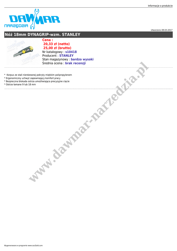 Informacje o produkcie Utworzono 08-03-2017 Nóż 18mm DYNAGRIP-wzm. STANLEY Cena : 20,33 zł (netto) 25,00 zł (brutto) zi a. p l Nr katalogowy : s10418 Producent : STANLEY Stan magazynowy : bardzo wysoki Średnia ocena : brak recenzji w w w .d aw m ar -n ar ze d * Korpus ze stali nierdzewnej pokryty miękkim polipropylenem * Ergonomiczny uchwyt zapewniający komfort pracy * Bezpieczna blokada ostrza umożliwiająca precyzyjne cięcie * Ostrze łamane 9 lub 18 mm Wygenerowano w programie www.oscGold.com