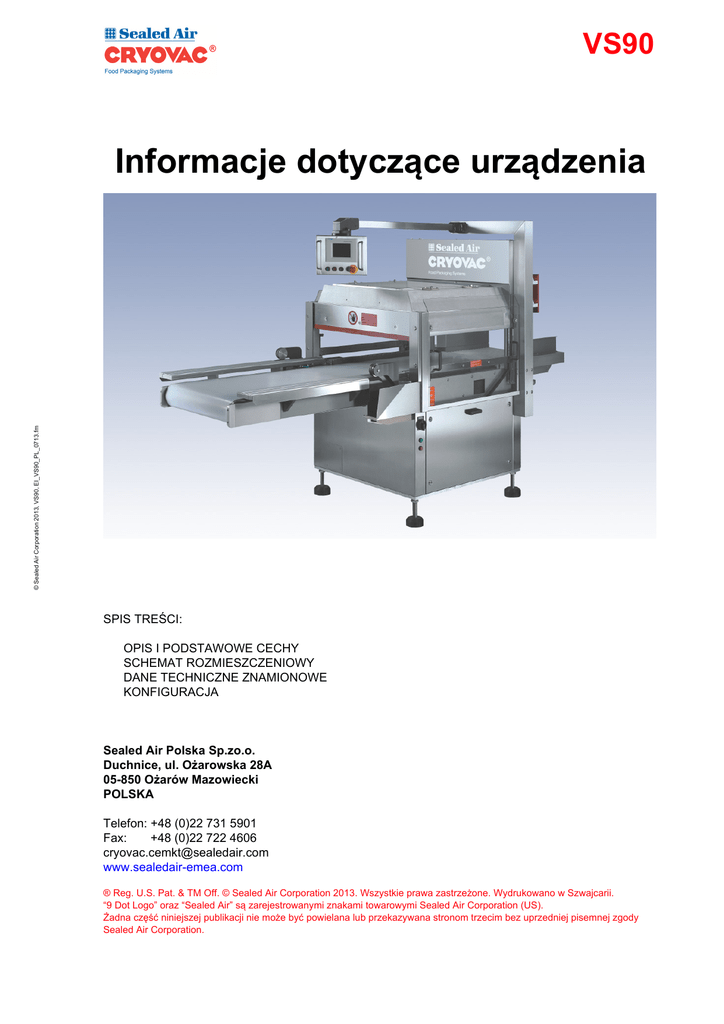 VS90 © Sealed Air Corporation 2013, VS90, EI_VS90_PL_0713.fm Informacje dotyczące urządzenia SPIS TREŚCI: OPIS I PODSTAWOWE CECHY SCHEMAT ROZMIESZCZENIOWY DANE TECHNICZNE ZNAMIONOWE KONFIGURACJA Sealed Air Polska Sp.zo.o. Duchnice, ul. Ożarowska 28A 05-850 Ożarów Mazowiecki POLSKA Telefon: +48 (0)22 731 5901 Fax: +48 (0)22 722 4606 [email protected] www.sealedair-emea.com ® Reg. U.S. Pat. & TM Off. © Sealed Air Corporation 2013. Wszystkie prawa zastrzeżone. Wydrukowano w Szwajcarii. “9 Dot Logo” oraz “Sealed Air” są zarejestrowanymi znakami towarowymi Sealed Air Corporation (US). Żadna część niniejszej publikacji nie może być powielana lub przekazywana stronom trzecim bez uprzedniej pisemnej zgody Sealed Air Corporation. 1 Opis i podstawowe cechy 1.1 Opis Maszyna jest sterowana za pośrednictwem sterownika PLC (układ sterowania z pamięcią programowalną), który nadzoruje i inicjuje każdą fazę pracy w przebiegu eksploatacji maszyny. Sterownik ten zawiera 15 receptur o parametrach, które mogą zostać dostosowane do konkretnych wymagań. Programowanie maszyny ma charakter intuicyjny i jest podejmowane na pulpicie operatora wyposażonym w ekran dotykowy. Dostępne są różne opcje wyposażenia maszyny dostosowane do różnych produktów. Konstrukcja maszyny jest prosta i solidna. Wszystkie krytyczne części maszyny zostały zabezpieczone przed środowiskiem o działaniu korozyjnym, często występującym w pomieszczeniach mieszczących instalacje przetwórcze i linie pakowania produktów spożywczych. Maszyna została skonstruowana w sposób ergonomiczny, z myślą o bezpieczeństwie i higienie, jest prosta w obsłudze, łatwa do utrzymania w czystości i niekłopotliwa w konserwacji. Spełnia ona także wszystkie istotne wymagania zawarte w przepisach Unii Europejskiej, dotyczących bezpieczeństwa i higieny. 2 © Sealed Air Corporation 2013, VS90, EI_VS90_PL_0713.fm Automatyczna pakowarka próżniowa Cryovac® VS90 z przenośnikiem taśmowym jest przeznaczona do pakowania średnich porcji świeżego mięsa czerwonego, przetworów mięsnych i sera z przeznaczeniem do dalszego przetwórstwa przemysłowego. Zwiera ona wiele nowych rozwiązań stanowiących wynik aktualnych osiągnięć techniki pakowania próżniowego. Typowy przykład stanowi układ VCS (vacuum control system – układ kontroli próżni) służący do optymalizacji cyklu próżniowego przy pakowaniu produktów mokrych i wilgotnych. Wyposażenie maszyny umożliwia jej wykorzystanie w licznych zastosowaniach w obrębie różnych sektorów zaopatrzenia rynku. 1.2 Podstawowe cechy • • • • • • • • © Sealed Air Corporation 2013, VS90, EI_VS90_PL_0713.fm • • • • • Automatyczna pakowarka próżniowa o średniogabarytowej komorze próżniowej z przenośnikiem taśmowym, obsługiwana przez 1 lub 2 operatorów zależnie od układu linii produkcyjnej. Ekran dotykowy zgodny z aktualnym stanem techniki, jako jednostka obsługowa Wydajność maszyny do 3 cyklów roboczych/min (zależnie od konfiguracji układu próżniowego) Układ zdalnego sterowania dla uruchamiania i wyłączania pompy Automatyczne przekazywanie produktu System zgrzewania Ultraseal® o polepszonych osiągach zgrzewania przez zoptymalizowaną kontrolę temperatury Belka zgrzewająca pracująca w systemie monoactive, pod kontrolą mikroprocesora, nie wymagająca chłodzenia wodą, o regulowanym nacisku zgrzewania Końcowy zespół przecinania z usuwaniem i gromadzeniem resztkowych skrawków folii Układ automatycznego oszczędzania energii powodujący wyłączenie maszyny, gdy nie jest ona użytkowana przez wstępnie nastawiony czas Układ Ultravac i układ kontroli próżni jako wyposażenie standardowe Konstrukcja uwzględniająca wymogi higieniczne dla zapewnienia łatwości i skuteczności czyszczenia Dobry dostęp na potrzeby wykonania czynności konserwacji Solidna konstrukcja wysokiej jakości wykonana całkowicie z materiałów dopuszczonych do wykorzystania w praktyce przetwórstwa spożywczego 3 Schemat rozmieszczeniowy © Sealed Air Corporation 2013, VS90, EI_VS90_PL_0713.fm 2 Rys. 2-1, Schemat rozmieszczeniowy (maszyna o ruchu z lewej strony na prawą) 4 3 Dane techniczne znamionowe 3.1 Wymiary maszyny Długość, szerokość i wysokość 3.2 patrz schemat rozmieszczeniowy maszyny Masa © Sealed Air Corporation 2013, VS90, EI_VS90_PL_0713.fm ok. 1050 kg (+ pompa wspomagająca 150 kg) 3.3 Media robocze 3.3.1 Sprężone powietrze Jakość (ISO8573-1:2001) klasa 5.4.4 klasa 3.4.2, w przypadku użycia olejów o zawartości estrów klasa 3.3.2, gdy urządzenia są użytkowane w temperaturze poniżej 5°C Ciśnienie 6 bar Średnica przewodu 13 mm doprowadzającego Zużycie 15 Nm/h Przyłącze ½” Przyłącze do osadzenia przewodu giętkiego 3.3.2 Zasilanie elektryczne Napięcie 400 V, -15 do +10% (na życzenie dostępne inne napięcia) Liczba faz 3 + ziemia Częstotliwość 50 Hz / 60 Hz Godzinowe zużycie energii 0,8 kWh (bez pompy wspomagającej) elektrycznej (średnie) Moc zainstalowana 5,3 kW (bez pompy wspomagającej) Zabezpieczenie prądowe bezpiecznik 20 A, zwłoczny 5 Próżnia 400 - 630 m3/h (zależnie od rodzaju produktu i długości przewodu rurowego) Busch Panda WV 1000 przewód rurowy 3 cale 170 litrów Pompa główna Pompa wspomagająca Przyłącze Objętość komory 3.4 Charakterystyki robocze 3.4.1 Wymiary produktu Długość Wysokość 3.4.2 maks. 665 mm maks. 190 mm Belki zgrzewające Długość Wysokość 920 mm 30 mm (standard) (opcjonalnie: 55 i 70 mm) (opcjonalnie: 30/55 i 30/70) Odległość między belkami 700 mm zgrzewającymi 3.4.3 Dane dotyczące woreczków Długość Szerokość Typ (typy) woreczków 3.4.4 dostosowana do produktu dostosowana do produktu aktualny asortyment woreczków termokurczliwych Cryovac® (automatyczne doprowadzanie wyłącznie w przypadku użycia woreczków OSB™) Dane funkcjonalne Pompa 400 m3/h 630 m3/h 630 m3/h Prędkość od 1,5 do 2,1 cyklów ro