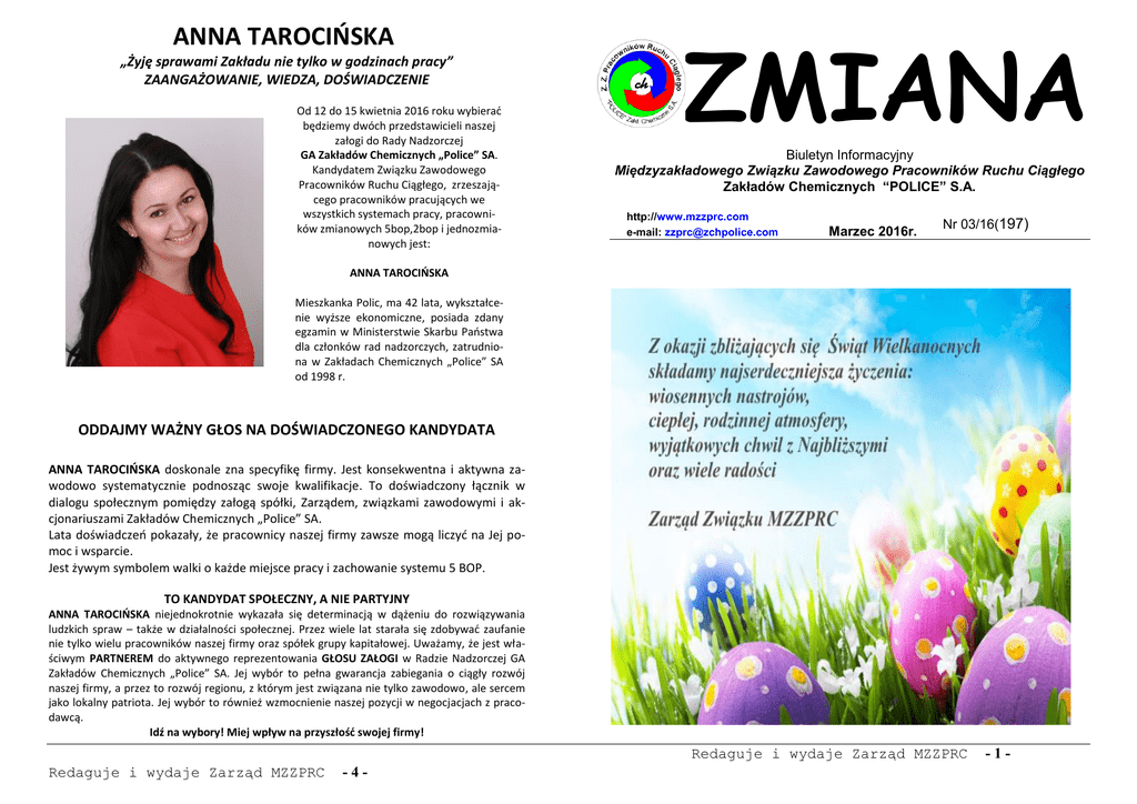 ANNA TAROCIŃSKA „Żyję sprawami Zakładu nie tylko w godzinach pracy” ZAANGAŻOWANIE, WIEDZA, DOŚWIADCZENIE Od 12 do 15 kwietnia 2016 roku wybierać będziemy dwóch przedstawicieli naszej załogi do Rady Nadzorczej GA Zakładów Chemicznych „Police” SA. Kandydatem Związku Zawodowego Pracowników Ruchu Ciągłego, zrzeszającego pracowników pracujących we wszystkich systemach pracy, pracowników zmianowych 5bop,2bop i jednozmianowych jest: ZMIANA Biuletyn Informacyjny Międzyzakładowego Związku Zawodowego Pracowników Ruchu Ciągłego Zakładów Chemicznych “POLICE” S.A. http://www.mzzprc.com e-mail: [email protected] Marzec 2016r. Nr 03/16(197) ANNA TAROCIŃSKA Mieszkanka Polic, ma 42 lata, wykształcenie wyższe ekonomiczne, posiada zdany egzamin w Ministerstwie Skarbu Państwa dla członków rad nadzorczych, zatrudniona w Zakładach Chemicznych „Police” SA od 1998 r. ODDAJMY WAŻNY GŁOS NA DOŚWIADCZONEGO KANDYDATA ANNA TAROCIŃSKA doskonale zna specyfikę firmy. Jest konsekwentna i aktywna zawodowo systematycznie podnosząc swoje kwalifikacje. To doświadczony łącznik w dialogu społecznym pomiędzy załogą spółki, Zarządem, związkami zawodowymi i akcjonariuszami Zakładów Chemicznych „Police” SA. Lata doświadczeń pokazały, że pracownicy naszej firmy zawsze mogą liczyć na Jej pomoc i wsparcie. Jest żywym symbolem walki o każde miejsce pracy i zachowanie systemu 5 BOP. TO KANDYDAT SPOŁECZNY, A NIE PARTYJNY ANNA TAROCIŃSKA niejednokrotnie wykazała się determinacją w dążeniu do rozwiązywania ludzkich spraw – także w działalności społecznej. Przez wiele lat starała się zdobywać zaufanie nie tylko wielu pracowników naszej firmy oraz spółek grupy kapitałowej. Uważamy, że jest właściwym PARTNEREM do aktywnego reprezentowania GŁOSU ZAŁOGI w Radzie Nadzorczej GA Zakładów Chemicznych „Police” SA. Jej wybór to pełna gwarancja zabiegania o ciągły rozwój naszej firmy, a przez to rozwój regionu, z którym jest związana nie tylko zawodowo, ale sercem jako lokalny patriota. Jej wybór to również wzmocnienie naszej pozycji w negocjacjach z pracodawcą. Idź na wybory! Miej wpływ na przyszłość swojej firmy! Redaguje i wydaje Zarząd MZZPRC Redaguje i wydaje Zarząd MZZPRC -4- -1- Wybory reprezentantów Załogi 12-15 kwietnia do Rady Nadzorczej GA Zakładów Chemicznych Police S.A. Prosimy o uczestnictwo w wyborach. Reprezentacja Załogi w Radzie jest niezwykle ważna z uwagi na podejmowane przez nią decyzje oraz powzięte informacje. Wybieramy dwie osoby, które będą reprezentowały Załogę na kolejne trzy lata. Nasz Związek podjął decyzję o zgłoszeniu Anny Tarocińskiej. ANNA TAROCIŃSKA od lat to : wspieranie inwestycji, nacisk o większe przeznaczanie pieniędzy na remonty, współpraca z Społecznymi Inspektorami Pracy w celu polepszania warunków socjalnych pracowników, interweniowanie na wszelkich szczeblach zarządzania, gdy występowały próby wyłączania obszarów organizacyjnych ze Spółki (laboratoria, straż pożarna, księgowość, kadry i płace, szkolenia, logistyka), zaangażowanie w utrzymanie 5bop, dbanie o spółki w grupie kapitałowej, współpraca i przekazywanie istotnych zdarzeń związkom zawodowym. Anna Tarocińska ma 42 lata. Mieszka w Policach. Ma dorosłą córkę. Ukończyła studia podyplomowe na Politechnice Poznańskiej o kierunku Inżynieria Zarządzania. Absolwentka: Uniwersytetu Szczecińskiego Wydziału Nauk Ekonomicznych i Zarzadzania kierunek Rachunkowość finansowa, *Wyższej Szkoły Oeconomikus Katedra Rachunkowości Zarządczej o kierunku Rachunkowość Zarządcza, ARP Centrum Kształcenia Kadr Studium Marketingowego Zarzadzania Przedsiębiorstwem Posiada uprawnienia z Ministerstwa Skarbu Państwa: egzamin dla członków rad nadzorczych. Regularnie w wolnym czasie dokształca się, aby Was profesjonalnie reprezentować. Dodatkowo odbyła liczne kursy i szkolenia z zakresu prawa pracy, prawa gospodarczego, audytu wewnętrznego itp. W Zakładach na stałe pracuje od 1998r. Zaczynała pracę od: recepcjonisty, technologa, specjalisty, poprzez pracę w Biurze nadzoru właścicielskiego i restrukturyzacji oraz Dział Audytu Wewnętrznego. Jest reprezentantem Załogi w Radzie Nadzorczej i komitecie Audytu trzecią - 2 - Redaguje i wydaje Zarząd MZZPRC kadencję. Od lat swoją wiedzą i zdobytym doświadczeniem wspiera nasz Związek pracując w biurze Międzyzakładowym Związku Zawodowym Pracowników Ruchu Ciągłego- związku zrzeszającego największą ilość pracowników GA Z.Ch.Police S.A. Wiedza przez nią zdobyta przyczynia się od lat do naszego lepszego przygotowania do negocjacji z pracodawcą oraz do podejmowania wielu interwencji. Wybierzcie osobę zaangażowaną, z doświadczeniem, osobę której ufacie. *Spotkanie z Zarządem 14.03.16* Logistyka: W związku z upływającym okresem testowym wprowadzenia 2bop na logistyce na części stanowisk oraz szeregiem interwencji na ten temat zostało zorganizowane spotkanie związków zawodowych z Zarządem Spółki oraz dyrektorem tej jednostki. Po okresie testowym nasza organizacja twierdzi, że system ten się nie sprawdza i powinno powrócić się do 5 bop. Dyrektor przygotował nam szereg wykresów jednak nie odpowiedział nam gdzie on w tym wszystkim widzi oszczędności czy polepszenie organizacji załadunków. Wcześniejsze założenie było takie, że paletyzator nie będzie pracował w weekendy a mamy informacje, że zawsze jeden na weekendy pracuje. Dyrektor niestety nie potrafił nam odpowiedzieć na pytanie ile zapłacił za nadgodziny oraz ilu pracowników ściągnął z innych wydziałów. Mówił, że ludzi na zlecenie musiał dodatkowo zatrudnić bo nie miał pracowników z uwagi na nagminne wybieranie na początku roku urlopów na żądanie Kolejne spotkanie za 2-3 tyg. Lux Med: na spotkaniu została zgłoszona interwencja o jak najszybsze spotkanie z firmą Lux Med. Spowodowane to jest zgł