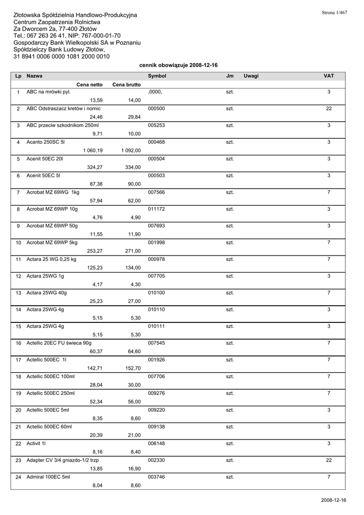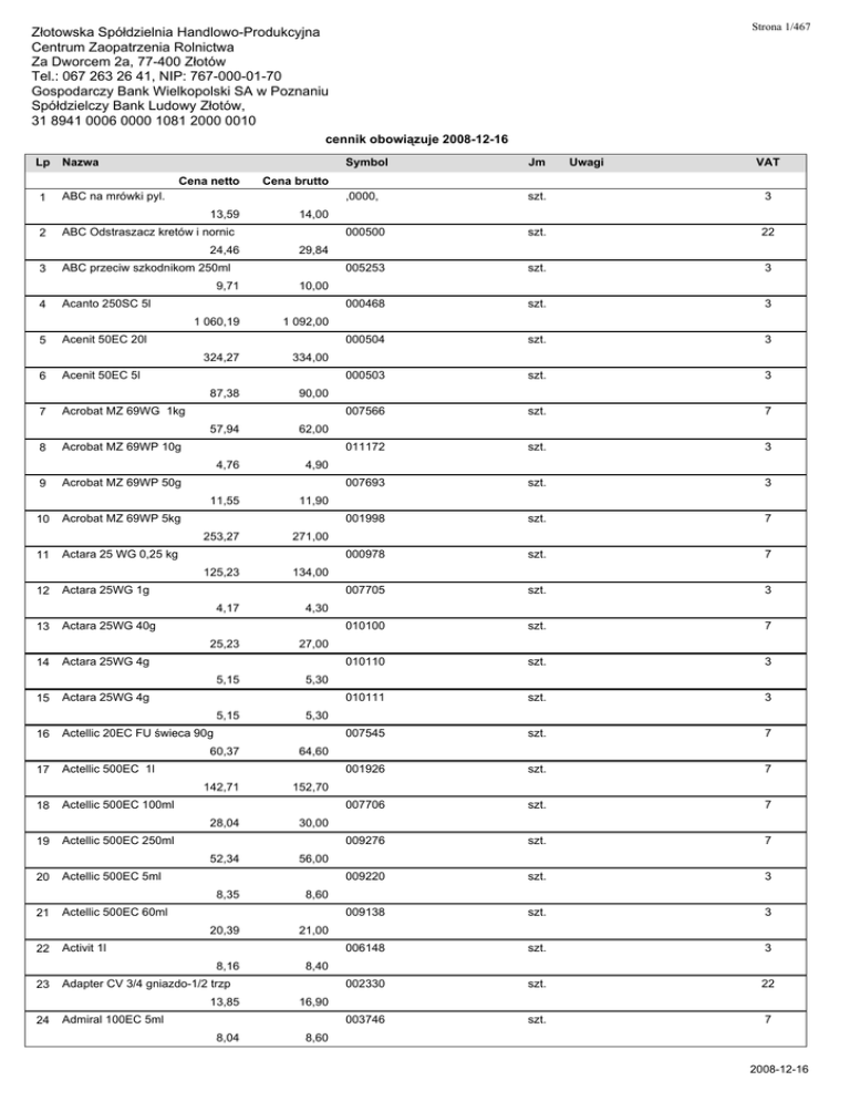 Strona 1/467 Złotowska Spółdzielnia Handlowo-Produkcyjna Centrum Zaopatrzenia Rolnictwa Za Dworcem 2a, 77-400 Złotów Tel.: 067 263 26 41, NIP: 767-000-01-70 Gospodarczy Bank Wielkopolski SA w Poznaniu Spółdzielczy Bank Ludowy Złotów, 31 8941 0006 0000 1081 2000 0010 cennik obowiązuje 2008-12-16 Lp 1 2 Nazwa Cena netto Cena brutto 13,59 14,00 ABC na mrówki pyl. ABC Odstraszacz kretów i nornic 24,46 3 ABC przeciw szkodnikom 250ml 4 Acanto 250SC 5l 5 Acenit 50EC 20l 6 Acenit 50EC 5l 9,71 1 060,19 7 8 10 Acrobat MZ 69WP 5kg 11 Actara 25 WG 0,25 kg 334,00 87,38 90,00 57,94 62,00 4,76 4,90 12 Actara 25WG 1g 253,27 13 14 4,17 4,30 25,23 27,00 5,15 5,30 Actara 25WG 40g Actara 25WG 4g 16 Actellic 20EC FU świeca 90g 17 Actellic 500EC 1l 18 Actellic 500EC 100ml 5,15 60,37 19 20 28,04 30,00 52,34 56,00 8,35 8,60 Actellic 500EC 250ml Actellic 500EC 5ml 22 Activit 1l 23 Adapter CV 3/4 gniazdo-1/2 trzp 24 Admiral 100EC 5ml 20,39 8,16 000500 szt. 22 005253 szt. 3 000468 szt. 3 000504 szt. 3 000503 szt. 3 007566 szt. 7 011172 szt. 3 007693 szt. 3 001998 szt. 7 000978 szt. 7 007705 szt. 3 010100 szt. 7 010110 szt. 3 010111 szt. 3 007545 szt. 7 001926 szt. 7 007706 szt. 7 009276 szt. 7 009220 szt. 3 009138 szt. 3 006148 szt. 3 002330 szt. 22 003746 szt. 7 64,60 152,70 Actellic 500EC 60ml 3 5,30 142,71 21 szt. 271,00 134,00 Actara 25WG 4g ,0000, 11,90 125,23 15 VAT 1 092,00 324,27 11,55 Uwagi 10,00 Acrobat MZ 69WP 10g Acrobat MZ 69WP 50g Jm 29,84 Acrobat MZ 69WG 1kg 9 Symbol 21,00 8,40 13,85 16,90 8,04 8,60 2008-12-16 Strona 2/467 Lp Nazwa Cena netto 25 Admiral 100EC 60ml 26 Afalon 450SC 100ml 27 28 33,64 36,00 15,89 17,00 15,53 16,00 47,57 49,00 Afalon 450SC 100ml Afalon 450SC 1l 29 Afalon 450SC 250ml 30 Afalon 450SC 5L 31 Afalon Dysp. 450SC 1l 32 Afalon Dyspers. 450SC 1l 26,17 212,62 33 34 49,00 51,46 53,00 50,00 51,50 Afalon Dyspersyjny 450SC 0,5l Agent 180EC 1l 36 Agil 100EC 1l 37 Agil 100EC 0,25l 38 Agil 100EC 0,5l 61,17 92,52 39 40 42 Agita 10WG 100g 43 Agita 10WG 100G 32,00 53,88 55,50 92,52 99,00 26,17 28,00 44 Agita 10WG 400g 28,16 45 46 47 77,67 80,00 77,67 80,00 Agita 10WG 400g Agregat ARES XL 3.0m Rurowy Agregat Uprawowy AU 3.6/5 49 Agregat Uprawowy AU 707/5 50 Agregat Uprawowy AU 708/5 51 Agrest pienny Biały 5 907,30 2 270,00 52 Agrest pienny Czerwony szt. 7 003748 szt. 3 010121 szt. 3 009260 szt. 7 001574 szt. 3 009261 szt. 3 000469 szt. 3 000470 szt. 3 000133 szt. 3 000134 szt. 3 009832 szt. 7 009831 szt. 7 010135 szt. 3 009833 szt. 7 001898 szt. 7 001973 szt. 7 000680 szt. 3 000679 szt. 3 010942 szt. 3 000226 szt. 3 011188 szt. 22 000644 szt. 22 001031 szt. 22 000988 szt. 22 000455 szt. 22 001795 szt. 3 004551 szt. 3 13 050,00 Agregat U-772/B3 3.0m strun 48 009259 29,00 30,00 9 625,00 7 83,00 29,13 10 696,72 szt. 99,00 29,91 77,57 009216 63,00 Agita 10WG 0,1kg Agita 10WG 0,4kg VAT 30,00 Agil 100EC 1l 41 Uwagi 219,00 Afalon Dyspers. 450SC 1l 35 Jm 28,00 47,57 29,13 Symbol Cena brutto 11 742,50 7 206,91 2 769,40 2 950,82 3 600,00 10,68 11,00 2008-12-16 Strona 3/467 Lp 53 Nazwa Cena netto Cena brutto 10,68 11,00 7,09 7,30 Agrest Zielony 54 Agricol- SIL 100g /do zakiszania trawy 55 Agricol -SIL 500g /do zakiszania trawy 56 Agritox 500 SL 5l 57 Agritox 500SL 1l 30,00 147,21 58 59 19,42 20,00 19,90 20,50 93,20 96,00 Agritox 500SL 1l Agritox 500SL 5l 61 Agro metazachlor 500 SC 5l 62 Agrofarm 10l 63 Agrofarm 360 1l 19,32 325,23 64 65 15,53 16,00 67,96 70,00 237,86 245,00 Agrofarm 360SL 5l Agrofarm Glyfos 360SL 20L 67 Agrofarm Glyfosat 360SL 1l 68 Agrofarm Glyfosat 360SL 1l 69 Agrofarm Glyfosat 360SL 5l 129,13 15,53 70 71 72 66,02 68,00 Agrofarm Glyfosat 360SL 60l 786,41 810,00 11,17 11,50 20,39 21,00 Agrofoska gran.3kg Agrofoska gran.5kg 74 Agromix N CA MG 1l 75 Agromix N CA MG 5l 76 Agrosteril 1kg skonc. płyn dezynfekcyjny 16,50 5,33 22,91 13,28 77 78 79 22 011521 szt. 22 000673 szt. 3 000672 szt. 3 009930 szt. 3 004681 szt. 3 001915 szt. 3 90 szt. 7 000826 szt. 3 000824 szt. 3 000825 szt. 3 000849 szt. 3 000651 szt. 3 004748 szt. 3 004749 szt. 3 000652 szt. 3 000650 szt. 3 007504 szt. 3 007503 szt. 3 007513 szt. 3 001173 szt. 7 005833 szt. 3 002956 szt. 22 002957 szt. 22 002958 szt. 22 000203 szt. 7 23,60 16,20 287,00 74,00 Agrosul Furon 750 WP 100g 158,88 szt. 5,70 Agrosteril 5kg skonc. płyn dezynfekcyjny 60,66 011520 17,00 Agrosteril 20kg skonc. płyn dezynfekcyjny 235,25 3 16,00 18,00 Agrofoska worek 5kg szt. 133,00 17,48 73 004166 348,00 135,00 Agrofarm Glyfosat 360SL 10l VAT 19,90 131,07 66 Uwagi 179,60 94,00 Agritox 500SL1l Jm 36,60 91,26 60 Symbol 170,00 2008-12-16 Strona 4/467 Lp Nazwa Cena brutto 80 Cena netto Agrosul Furon 750WP a 50g 79,44 85,00 81 Agrosulfuron 75WP 3x8g 47,09 48,50 34,58 37,00 92,23 95,00 82 83 Agrotalonil 500SC 1l Agroturon 500SC 5l 84 Agrowłoknina 1.6/ 10 85 Agrowłóknina 1,6x30 czarna 86 Agrowłóknina 1.5x10 87 Agrowłóknina 1.5x5 8,61 66,39 88 89 10,00 5,33 6,50 11,89 14,50 Agrowłóknina 1.6x10 czarna Agrowłóknina 1.6x100 mb 91 Agrowłóknina 1.6x5 92 Agrowłóknina 2,1/10 93 Agrowłóknina 2.1x100 mb 0,66 4,92 94 95 97 Agrowłóknina 3.2x5 czarna 15,00 1,02 1,25 11,89 14,50 98 Agrowłóknina P17 1,6/250 99 Agrowłóknina P17 3,2/250 8,20 23,77 szt. 3 005099 szt. 7 000571 szt. 3 011601 szt. 22 011882 szt. 22 009173 szt. 22 009172 szt. 22 011600 szt. 22 009432 szt 22 003545 mb 22 009430 szt. 22 003152 szt. 22 004399 szt. 22 010568 szt. 22 004400 szt. 22 009174 szt. 22 009433 szt. 22 012419 mb 22 012420 mb 22 009431 mb 22 004401 mb 22 000439 szt. 7 008255 szt. 7 004187 szt. 7 007784 szt. 3 008664 szt. 3 008665 szt. 3 29,00 1,31 1,60 100 Agrowłóknina Pegas 1,6x100 czarna 2,46 3,00 4,22 5,15 19,63 21,00 101 Agrowłóknina Pegas 3.2x100 102 Agroxone 50SL 1L 103 Agro-żel kwaśny3l 6,16 104 Agro-żel PH5-6 3l 6,60 105 Aksamitka Albatros wzn.0,2g 1,65 1,70 1,55 1,60 106 Aksamitka Bonita Bolero 1g 107 Aksamitka Bonita Carmen 1g 000135 10,00 0,90 6,17 7 1,60 0,74 5,76 szt. 6,00 Agrowłóknina 3.2x100 mb Biała Agrowłóknina 3.2x5 005441 0,80 Agrow