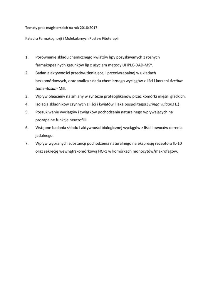 Tematy prac magisterskich na rok 2016/2017 Katedra Farmakognozji i Molekularnych Postaw Fitoterapii 1. Porównanie składu chemicznego kwiatów lipy pozyskiwanych z różnych farmakopealnych gatunków lip z użyciem metody UHPLC-DAD-MSn. 2. Badania aktywności przeciwutleniającej i przeciwzapalnej w układach bezkomórkowych, oraz analiza składu chemicznego wyciągów z liści i korzeni Arctium tomentosum Mill. 3. Wpływ oleaceiny na zmiany w syntezie proteoglikanów przez komórki mięśni gładkich. 4. Izolacja składników czynnych z liści i kwiatów lilaka pospolitego(Syringa vulgaris L.) 5. Poszukiwanie wyciągów i związków pochodzenia naturalnego wpływających na prozapalne funkcje neutrofilii. 6. Wstępne badania składu i aktywności biologicznej wyciągów z liści i owoców derenia jadalnego. 7. Wpływ wybranych substancji pochodzenia naturalnego na ekspresję receptora IL-10 oraz sekrecję wewnątrzkomórkową HO-1 w komórkach monocytów/makrofagów.