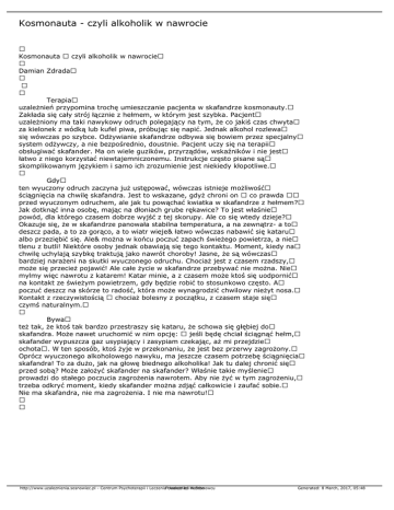 Kosmonauta - czyli alkoholik w nawrocie Kosmonauta czyli alkoholik w nawrocie Damian Zdrada Terapia uzależnień przypomina trochę umieszczanie pacjenta w skafandrze kosmonauty. Zakłada się cały strój łącznie z hełmem, w którym jest szybka. Pacjent uzależniony ma taki nawykowy odruch polegający na tym, że co jakiś czas chwyta za kielonek z wódką lub kufel piwa, próbując się napić. Jednak alkohol rozlewa się wówczas po szybce. Odżywianie skafandrze odbywa się bowiem przez specjalny system odżywczy, a nie bezpośrednio, doustnie. Pacjent uczy się na terapii obsługiwać skafander. Ma on wiele guzików, przyrządów, wskaźników i nie jest łatwo z niego korzystać niewtajemniczonemu. Instrukcje często pisane są skomplikowanym językiem i samo ich zrozumienie jest niekiedy kłopotliwe. Gdy ten wyuczony odruch zaczyna już ustępować, wówczas istnieje możliwość ściągnięcia na chwilę skafandra. Jest to wskazane, gdyż chroni on co prawda przed wyuczonym odruchem, ale jak tu powąchać kwiatka w skafandrze z hełmem? Jak dotknąć inna osobę, mając na dłoniach grube rękawice? To jest właśnie powód, dla którego czasem dobrze wyjść z tej skorupy. Ale co się wtedy dzieje? Okazuje się, że w skafandrze panowała stabilna temperatura, a na zewnątrz- a to deszcz pada, a to za gorąco, a to wiatr wieje& łatwo wówczas nabawić się kataru albo przeziębić się. Ale& można w końcu poczuć zapach świeżego powietrza, a nie tlenu z butli! Niektóre osoby jednak obawiają się tego kontaktu. Moment, kiedy na chwilę uchylają szybkę traktują jako nawrót choroby! Jasne, że są wówczas bardziej narażeni na skutki wyuczonego odruchu. Chociaż jest z czasem rzadszy, może się przecież pojawić! Ale całe życie w skafandrze przebywać nie można. Nie mylmy więc nawrotu z katarem! Katar minie, a z czasem może ktoś się uodpornić na kontakt ze świeżym powietrzem, gdy będzie robić to stosunkowo często. A poczuć deszcz na skórze to radość, która może wynagrodzić chwilowy nieżyt nosa. Kontakt z rzeczywistością chociaż bolesny z początku, z czasem staje się czymś naturalnym. Bywa też tak, że ktoś tak bardzo przestraszy się kataru, że schowa się głębiej do skafandra. Może nawet uruchomić w nim opcję: jeśli będę chciał ściągnąć hełm, skafander wypuszcza gaz usypiający i zasypiam czekając, aż mi przejdzie ochota. W ten sposób, ktoś żyje w przekonaniu, że jest bez przerwy zagrożony. Oprócz wyuczonego alkoholowego nawyku, ma jeszcze czasem potrzebę ściągnięcia skafandra! To za dużo, jak na głowę biednego alkoholika! Jak tu dalej chronić się przed sobą? Może założyć skafander na skafander? Właśnie takie myślenie prowadzi do stałego poczucia zagrożenia nawrotem. Aby nie żyć w tym zagrożeniu, trzeba odkryć moment, kiedy skafander można zdjąć całkowicie i zaufać sobie. Nie ma skafandra, nie ma zagrożenia. I nie ma nawrotu! http://www.uzaleznienia.sosnowiec.pl - Centrum Psychoterapii i LeczeniaPowered Uzależnień by Mambo w Sosnowcu Generated: 8 March, 2017, 05:48