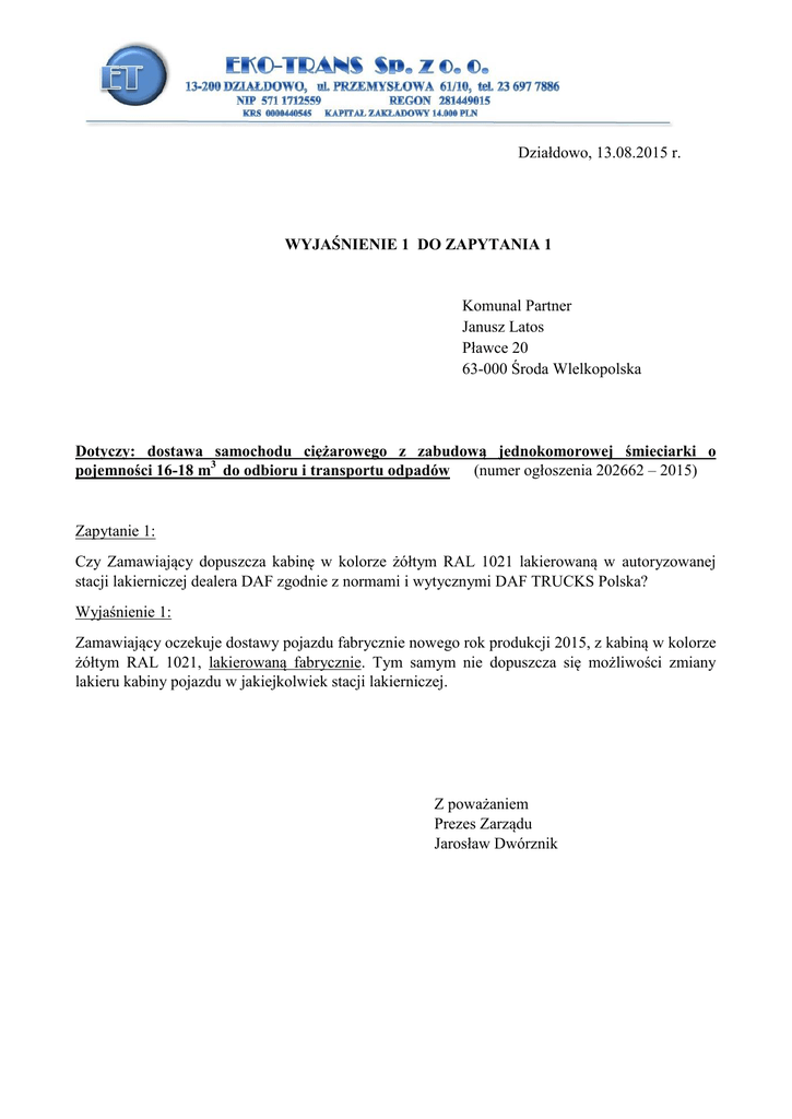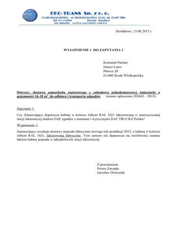 Działdowo, 13.08.2015 r. WYJAŚNIENIE 1 DO ZAPYTANIA 1 Komunal Partner Janusz Latos Pławce 20 63-000 Środa Wlelkopolska Dotyczy: dostawa samochodu ciężarowego z zabudową jednokomorowej śmieciarki o pojemności 16-18 m3 do odbioru i transportu odpadów (numer ogłoszenia 202662 – 2015) Zapytanie 1: Czy Zamawiający dopuszcza kabinę w kolorze żółtym RAL 1021 lakierowaną w autoryzowanej stacji lakierniczej dealera DAF zgodnie z normami i wytycznymi DAF TRUCKS Polska? Wyjaśnienie 1: Zamawiający oczekuje dostawy pojazdu fabrycznie nowego rok produkcji 2015, z kabiną w kolorze żółtym RAL 1021, lakierowaną fabrycznie. Tym samym nie dopuszcza się możliwości zmiany lakieru kabiny pojazdu w jakiejkolwiek stacji lakierniczej. Z poważaniem Prezes Zarządu Jarosław Dwórznik
