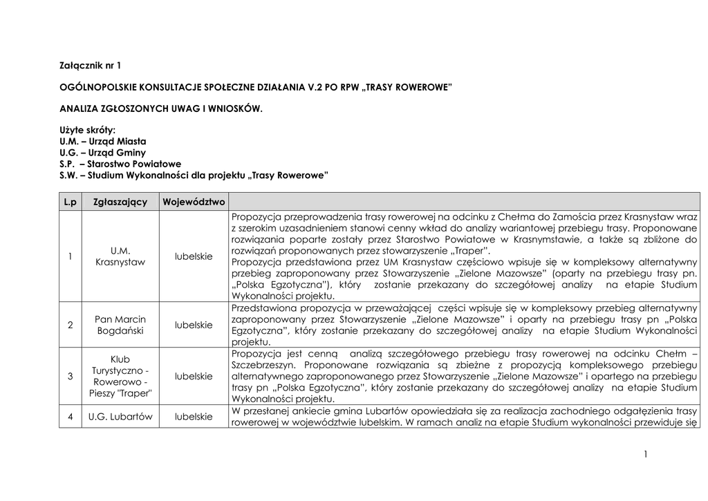 Załącznik nr 1 OGÓLNOPOLSKIE KONSULTACJE SPOŁECZNE DZIAŁANIA V.2 PO RPW „TRASY ROWEROWE” ANALIZA ZGŁOSZONYCH UWAG I WNIOSKÓW. Użyte skróty: U.M. – Urząd Miasta U.G. – Urząd Gminy S.P. – Starostwo Powiatowe S.W. – Studium Wykonalności dla projektu „Trasy Rowerowe” L.p Zgłaszający Województwo 1 U.M. Krasnystaw lubelskie 2 Pan Marcin Bogdański lubelskie 3 Klub Turystyczno Rowerowo Pieszy "Traper" lubelskie 4 U.G. Lubartów lubelskie Propozycja przeprowadzenia trasy rowerowej na odcinku z Chełma do Zamościa przez Krasnystaw wraz z szerokim uzasadnieniem stanowi cenny wkład do analizy wariantowej przebiegu trasy. Proponowane rozwiązania poparte zostały przez Starostwo Powiatowe w Krasnymstawie, a także są zbliżone do rozwiązań proponowanych przez stowarzyszenie „Traper”. Propozycja przedstawiona przez UM Krasnystaw częściowo wpisuje się w kompleksowy alternatywny przebieg zaproponowany przez Stowarzyszenie „Zielone Mazowsze” (oparty na przebiegu trasy pn. „Polska Egzotyczna”), który zostanie przekazany do szczegółowej analizy na etapie Studium Wykonalności projektu. Przedstawiona propozycja w przeważającej części wpisuje się w kompleksowy przebieg alternatywny zaproponowany przez Stowarzyszenie „Zielone Mazowsze” i oparty na przebiegu trasy pn „Polska Egzotyczna”, który zostanie przekazany do szczegółowej analizy na etapie Studium Wykonalności projektu. Propozycja jest cenną analizą szczegółowego przebiegu trasy rowerowej na odcinku Chełm – Szczebrzeszyn. Proponowane rozwiązania są zbieżne z propozycją kompleksowego przebiegu alternatywnego zaproponowanego przez Stowarzyszenie „Zielone Mazowsze” i opartego na przebiegu trasy pn „Polska Egzotyczna”, który zostanie przekazany do szczegółowej analizy na etapie Studium Wykonalności projektu. W przesłanej ankiecie gmina Lubartów opowiedziała się za realizacja zachodniego odgałęzienia trasy rowerowej w województwie lubelskim. W ramach analiz na etapie Studium wykonalności przewiduje się 1 5 6 Pan Jan Cytawa lubelskie zarówno analizę możliwości wykonania wariantu zachodniego trasy, jak i wschodniego – z ewentualnym odbiciem do Lublina. W obu tych wariantach (zachodnim i wschodnim z odbiciem do Lublina) przewiduje się przeprowadzenie trasy przez Lubartów. Jednak o ostatecznym przebiegu trasy zadecyduje analiza wykonalności przeprowadzona w Studium oraz decyzja Beneficjenta podjęta na podstawie wniosków z analizy ekonomicznej. Możliwy jest też zatem wariant wschodni bez odbicia do Lublina, w tej chwili nie rozważany jednak jako rozwiązanie docelowe. Szeroka analiza zarówno proponowanych przebiegów jak i technicznych aspektów realizacji trasy rowerowej. Przekazane wnioski i uwagi zostaną przekazane do wykorzystania wykonawcy Studium Wykonalności. Argumentacja za zachodnim przebiegiem trasy w województwie lubelskim, który to przebieg jako jeden z analizowanych wariantów rozpatrzony zostanie na etapie Studium Wykonalności. U.G. Janowiec 7 U.M. Opole Lubelskie 8 U.M. Puławy 9 U.G. Wąwolnica 10 LOT Kraina Lessowych Wąwozów 11 U.M. Poniatowa 12 U.G. Wojciechów 13 Miejskie Koło Turystyki lubelskie (ankiety tożsame) lubelskie Zgłoszona propozycja szczegółowego przebiegu, mimo niewątpliwej atrakcyjności opisanych terenów, nie wpisuje się w założenia realizacji ponadregionalnej trasy rowerowej, która ma przede wszystkim umożliwić turyście szybkie pokonanie poszczególnych odcinków i nie zmuszać, a jedynie dawać szansę na bliższe zapoznanie się z lokalnymi atrakcjami. Filozofia wytyczenia trasy na zasadzie „rybiego kręgosłupa i ości” zakłada minimalizowanie współczynników wydłużenia trasy głównej i umożliwienie tworzenia wokół niej lokalnych tras i ścieżek rowerowych. Ponadto planując przebieg trasy głównej należy uwzględnić aspekt kosztowy. Budowa zbyt długiej trasy spowoduje obniżenie jej jakości, a zatem i atrakcyjności dla potencjalnych użytkowników. Wydłużanie trasy przy jednoczesnej próbie zachowania odpowiedniego standardu oznaczałoby znacznie większy udział finansowy Beneficjenta oraz jego partnerów (gmin, przez które będzie przebiegała trasa). Biorąc pod uwagę założenia oraz ograniczenia finansowe Działania V.2 PO RPW sugeruje się wykonanie trasy proponowanej przez UM Opole Lubelskie w oparciu o środki z Regionalnego Programu Operacyjnego. Lokalna trasa zostałaby włączona w system promocji trasy głównej. Wydaje się, że atrakcyjność terenów oraz umiejętność budowania lokalnych partnerstw przez okoliczne samorządy zaowocowałyby dużymi szansami na uzyskanie dofinansowania z funduszy regionalnych. Takie przedsięwzięcie stanowiłoby jednocześnie modelową realizację zasady komplementarności różnych poziomów wdrażania środków unijnych, co niewątpliwie przyczyniłoby się do zwiększenia efektu synergii. Miejskie Koło Turystyki Rowerowej "Relaks" opowiada się za realizacją trasy rowerowej przechodzącej przez Lubartów. W ramach analiz na etapie Studium Wykonalności przewiduje się zarówno analizę 2 Rowerowej "Relaks" 14 U.M. Janów Lubelski lubelskie 15 Pan Arkadiusz Kraska lubelskie 16 S.P. Krasnystaw lubelskie 17 U.M. Zamość lubelskie 18 Miasto Chełm, Gminy: Chełm, Kamień, Żmudź, Białopole (ankieta wspólna) lubelskie możliwości wykonania wariantu zachodniego trasy, jak i wschodniego – z ewentualnym odbiciem do Lublina. W obu tych wariantach (zachodnim i wschodnim z odbiciem do Lublina) przewiduje się przeprowadzenie trasy przez Lubartów. Jednak o ostatecznym przebiegu trasy zadecyduje analiza wykonalności przeprowadzona w Studium oraz decyzja Beneficjenta podjęta na podstawie wniosków z analizy ekonomicznej. Możliwy jest też zatem wariant wschodni bez odbicia do Lublina, w tej chwili nie rozważany jednak jako rozwiązanie docelowe. Zaproponowany korytarz nie wpisuje się w inne koncepcje prowadzeni