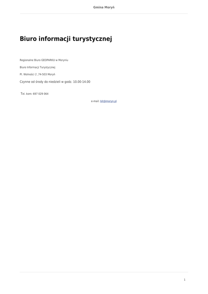 Gmina Moryń Biuro informacji turystycznej Regionalne Biuro GEOPARKU w Moryniu Biuro Informacji Turystycznej Pl. Wolności 2 ,74-503 Moryń Czynne od środy do niedzieli w godz. 10.00-14.00 Tel. kom: 697 029 064 e-mail: [email protected] 1