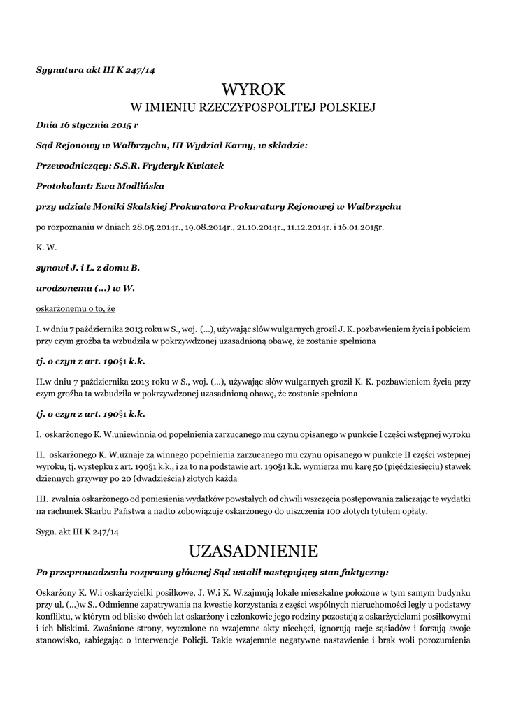 Sygnatura akt III K 247/14 WYROK W IMIENIU RZECZYPOSPOLITEJ POLSKIEJ Dnia 16 stycznia 2015 r Sąd Rejonowy w Wałbrzychu, III Wydział Karny, w składzie: Przewodniczący: S.S.R. Fryderyk Kwiatek Protokolant: Ewa Modlińska przy udziale Moniki Skalskiej Prokuratora Prokuratury Rejonowej w Wałbrzychu po rozpoznaniu w dniach 28.05.2014r., 19.08.2014r., 21.10.2014r., 11.12.2014r. i 16.01.2015r. K. W. synowi J. i L. z domu B. urodzonemu (...) w W. oskarżonemu o to, że I. w dniu 7 października 2013 roku w S., woj. (...), używając słów wulgarnych groził J. K. pozbawieniem życia i pobiciem przy czym groźba ta wzbudziła w pokrzywdzonej uzasadnioną obawę, że zostanie spełniona tj. o czyn z art. 190§1 k.k. II.w dniu 7 października 2013 roku w S., woj. (...), używając słów wulgarnych groził K. K. pozbawieniem życia przy czym groźba ta wzbudziła w pokrzywdzonej uzasadnioną obawę, że zostanie spełniona tj. o czyn z art. 190§1 k.k. I. oskarżonego K. W.uniewinnia od popełnienia zarzucanego mu czynu opisanego w punkcie I części wstępnej wyroku II. oskarżonego K. W.uznaje za winnego popełnienia zarzucanego mu czynu opisanego w punkcie II części wstępnej wyroku, tj. występku z art. 190§1 k.k., i za to na podstawie art. 190§1 k.k. wymierza mu karę 50 (pięćdziesięciu) stawek dziennych grzywny po 20 (dwadzieścia) złotych każda III. zwalnia oskarżonego od poniesienia wydatków powstałych od chwili wszczęcia postępowania zaliczając te wydatki na rachunek Skarbu Państwa a nadto zobowiązuje oskarżonego do uiszczenia 100 złotych tytułem opłaty. Sygn. akt III K 247/14 UZASADNIENIE Po przeprowadzeniu rozprawy głównej Sąd ustalił następujący stan faktyczny: Oskarżony K. W.i oskarżycielki posiłkowe, J. W.i K. W.zajmują lokale mieszkalne położone w tym samym budynku przy ul. (...)w S.. Odmienne zapatrywania na kwestie korzystania z części wspólnych nieruchomości legły u podstawy konfliktu, w którym od blisko dwóch lat oskarżony i członkowie jego rodziny pozostają z oskarżycielami posiłkowymi i ich bliskimi. Zwaśnione strony, wyczulone na wzajemne akty niechęci, ignorują racje sąsiadów i forsują swoje stanowisko, zabiegając o interwencje Policji. Takie wzajemnie negatywne nastawienie i brak woli porozumienia spowodowały, że zgodne korzystanie z nieruchomości wspólnej od dawna nie jest możliwe. W tych realiach emocje tłumione przez oskarżonego K. W.znalazły gwałtowne ujście podczas zajścia z dnia 7 października 2013 roku. Oskarżony jest kierowcą zawodowym, zwykle wykonującym obowiązki zawodowe poza miejscem zamieszkania, toteż stan stosunków z oskarżycielkami posiłkowymi i W. K.(ojcem K. K., mężem J. K.) znał z relacji swojej żony, D. W. (1). Ta wspominała mu niejednokrotnie, że oskarżycielki posiłkowe szykanują ją, nagrywają rozmowy, wzywają różne służby do podejmowania bezpodstawnych interwencji. W dniu 7 października 2013 roku K. K.gościła swojego znajomego, T. U.. Około godziny 19.00 oskarżony i jego bliscy wrócili z uroczystości weselnych. Oskarżony, wzburzony przebiegiem niedawnej kłótni ze swym synem, D. W. (2), stał przed budynkiem i wykrzykiwał zniewagi i groźby pod adresem nieokreślonej osoby, wołając: wyjdź tu k..., szmato, bo chcę ciebie zajeb...”. J. K., myśląc, że to awanturuje się klient pobliskiego klubu nocnego, otworzyła okno, ale przed budynkiem ujrzała oskarżonego, który powiedział „wreszcie się ciebie k... doczekałem. Oskarżycielka posiłkowa była zdumiona zachowaniem oskarżonego, poszła do kuchni, gdzie zapaliła papierosa, by się uspokoić. Gdy otworzyła okno, okazało się że oskarżony stoi z tej strony, na którą wychodzą okna kuchenne. Kiedy ponowił swoją wulgarną wypowiedź, oskarżycielka posiłkowa zapytała go, dlaczego ją wyzywa. Oskarżony powiedział, że nie będzie patrzyła na jego żonę i zarzucił, że oskarżycielki posiłkowe śledzą jego bliskich, podsłuchują ich i nagrywają. Dodał, że na dół ma zejść W. K., bo chce się z nim bić. Oskarżycielka posiłkowa powiedziała do oskarżonego, żeby nie awanturował się z nią i nie obrażał jej i dodała, że porozmawiają jak oskarżony wytrzeźwieje. Bełkotliwa mowa, podniesiony ton i problemy z utrzymaniem równowagi świadczyły o tym, że oskarżony był nietrzeźwy. Dowód: - zeznania świadka J. K. k. 1-5 częściowo, 126-128 - zeznania świadka K. K.k. 24-27, 124 - 126 - zeznania świadka W. K. k. 15-17, 144-145 Pod koniec rozmowy swojej matki z oskarżonym K. K.weszła do kuchni. Siedząc w swoim pokoju słyszała, że jej matka z kimś „agresywnie” rozmawia. W obecności K. K.oskarżony powiedział, że oskarżycielkom posiłkowym nie wolno patrzeć przez okno i ich podglądać. K. K.nie chciała, by oskarżony znieważał jej matkę, dlatego oznajmiła mu, że jeśli nie uspokoi się, to ona wezwie Policję. Oskarżony skwitował to lekceważącym stwierdzeniem „a ty mała k..., wzywaj Policję, i tak nic mi nie zrobią”. Wówczas K. K.telefonicznie wezwała Policję. J. K.powiedziała, że żona oskarżonego zabrała go do domu. Oskarżycielki posiłkowe czekały na funkcjonariuszy przed budynkiem. Około godz. 19.20 przyjechali Policjanci. Jedna z oskarżycielek posiłkowych poinformowała funkcjonariuszy, że nietrzeźwy sąsiad z parteru wszczął z nimi awanturę, był wulgarny, agresywny. Obie wspominały, że mają wspólny strych, na który chodzą bliscy oskarżonego gdy u nich są goście. Dodały, że członkowie rodziny oskarżonego zakłócają ich spokój poprzez głośne słuchanie muzyki. Po chwili rozmowy Policjanci zapukali do drzwi mieszkania oskarżonego. Oskarżycielki posiłkowe poszły na górę i przez uchylone drzwi przysłuchiwały się rozmowie. Oskarżony, wyraźnie nietrzeźwy, wyrażał zdumienie przyjazdem Policjantów. Żona oskarżonego zarzucała oskarżycielkom posiłkowym, że szpiegują i pods
