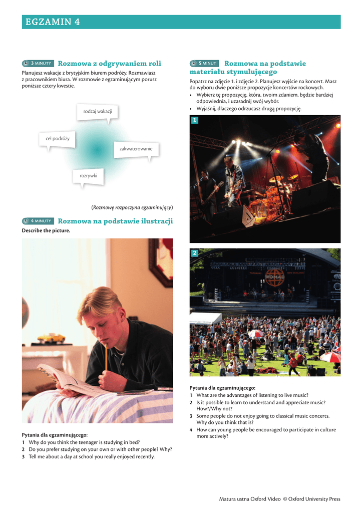 EGZAMIN 4 3 Rozmowa z odgrywaniem roli Planujesz wakacje z brytyjskim biurem podróży. Rozmawiasz z pracownikiem biura. W rozmowie z egzaminującym porusz poniższe cztery kwestie. rodzaj wakacji Rozmowa na podstawie materiału stymulującego 5 Popatrz na zdjęcie 1. i zdjęcie 2. Planujesz wyjście na koncert. Masz do wyboru dwie poniższe propozycje koncertów rockowych. • Wybierz tę propozycję, która, twoim zdaniem, będzie bardziej odpowiednia, i uzasadnij swój wybór. • Wyjaśnij, dlaczego odrzucasz drugą propozycję. cel podróży zakwaterowanie rozrywki (Rozmowę rozpoczyna egzaminujący) 4 Rozmowa na podstawie ilustracji Describe the picture. Pytania dla egzaminującego: 1 Why do you think the teenager is studying in bed? 2 Do you prefer studying on your own or with other people? Why? 3 Tell me about a day at school you really enjoyed recently. Pytania dla egzaminującego: 1 What are the advantages of listening to live music? 2 Is it possible to learn to understand and appreciate music? How?/Why not? 3 Some people do not enjoy going to classical music concerts. Why do you think that is? 4 How can young people be encouraged to participate in culture more actively? Matura ustna Oxford Video © Oxford University Press
