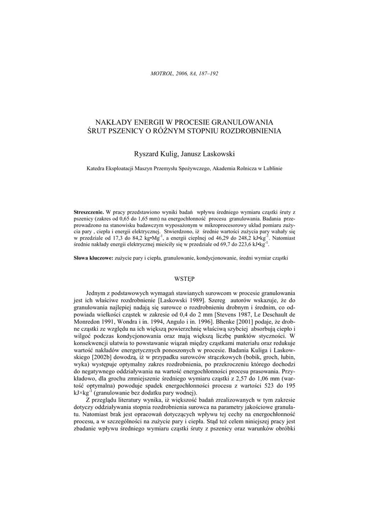 MOTROL, 2006, 8A, 187–192 NAKŁADY ENERGII W PROCESIE GRANULOWANIA ŚRUT PSZENICY O RÓśNYM STOPNIU ROZDROBNIENIA Ryszard Kulig, Janusz Laskowski Katedra Eksploatacji Maszyn Przemysłu SpoŜywczego, Akademia Rolnicza w Lublinie Streszczenie. W pracy przedstawiono wyniki badań wpływu średniego wymiaru cząstki śruty z pszenicy (zakres od 0,65 do 1,65 mm) na energochłonność procesu granulowania. Badania przeprowadzono na stanowisku badawczym wyposaŜonym w mikroprocesorowy układ pomiaru zuŜycia pary , ciepła i energii elektrycznej. Stwierdzono, iŜ średnie wartości zuŜycia pary wahały się w przedziale od 17,3 do 84,2 kg•Mg-1, a energii cieplnej od 46,29 do 248,2 kJ•kg-1. Natomiast średnie nakłady energii elektrycznej mieściły się w przedziale od 69,7 do 223,6 kJ•kg-1. Słowa kluczowe: zuŜycie pary i ciepła, granulowanie, kondycjonowanie, średni wymiar cząstki WSTĘP Jednym z podstawowych wymagań stawianych surowcom w procesie granulowania jest ich właściwe rozdrobnienie [Laskowski 1989]. Szereg autorów wskazuje, Ŝe do granulowania najlepiej nadają się surowce o rozdrobnieniu drobnym i średnim, co odpowiada wielkości cząstek w zakresie od 0,4 do 2 mm [Stevens 1987, Le Deschault de Monredon 1991, Wondra i in. 1994, Angulo i in. 1996]. Bhenke [2001] podaje, Ŝe drobne cząstki ze względu na ich większą powierzchnię właściwą szybciej absorbują ciepło i wilgoć podczas kondycjonowania oraz mają większą liczbę punktów styczności. W konsekwencji ułatwia to powstawanie wiązań między cząstkami materiału oraz redukuje wartość nakładów energetycznych ponoszonych w procesie. Badania Kuliga i Laskowskiego [2002b] dowodzą, iŜ w przypadku surowców strączkowych (bobik, groch, łubin, wyka) występuje optymalny zakres rozdrobnienia, po przekroczeniu którego dochodzi do negatywnego oddziaływania na wartość energochłonności procesu prasowania. Przykładowo, dla grochu zmniejszenie średniego wymiaru cząstki z 2,57 do 1,06 mm (wartość optymalna) powoduje spadek energochłonności procesu z wartości 523 do 195 kJ×kg-1 (granulowanie bez dodatku pary wodnej). Z przeglądu literatury wynika, iŜ większość badań zrealizowanych w tym zakresie dotyczy oddziaływania stopnia rozdrobnienia surowca na parametry jakościowe granulatu. Natomiast brak jest opracowań dotyczących wpływu tej cechy na energochłonność procesu, a w szczególności na zuŜycie pary i ciepła. Stąd teŜ celem niniejszej pracy jest zbadanie wpływu średniego wymiaru cząstki śruty z pszenicy oraz warunków obróbki 188 Ryszard Kulig, Janusz Laskowski hydrotermicznej na wartość jednostkowych nakładów energii ponoszonych w procesie granulowania. MATERIAŁY I METODY Do badań wykorzystano pszenicę odmiany Emika. Surowiec przygotowano w rozdrabniaczu bijakowym typu H-950 wyposaŜonym w sita o średnicy oczek w przedziale od 3 do 9 mm. Średni wymiar cząstki surowca po rozdrobnieniu wyznaczono zgodnie z PN-89/R-64798. Wartość tego parametru wynosiła odpowiednio: 0,65; 0,83; 1,17; 1,38 i 1,65 mm. Po rozdrobnieniu materiał badawczy doprowadzano do stałej wilgotności 12%. Całość badań przeprowadzono na stanowisku pomiarowym wyposaŜonym w wytwornicę pary typu LW 69, kondycjoner łopatkowy, granulator firmy Amandus Kahl typu L-175 (matryca o średnicy otworów 4 mm i grubości 20 mm) oraz komputerowe układy pomiaru zuŜycia pary, ciepła i energii elektrycznej. Szczegółowy opis wyposaŜenia stanowiska wraz z metodyką określania zuŜycia pary, ciepła i nakładów energii elektrycznej przedstawiono w innych pracach [Kulig i in. 1999, Kulig i Laskowski 2002a]. Proces granulowania prowadzono z zastosowaniem kondycjonowania parowego. Badane surowce przed prasowaniem doprowadzano do pięciu poziomów temperatury: 50, 60, 70, 80 i 90oC, poprzez traktowanie parą wodną o ciśnieniu 400 kPa. Analizę zaleŜności pomiędzy stopniem rozdrobnienia surowca i warunkami obróbki hydrotermicznej a jednostkowymi nakładami energii granulowania wykonano przy wykorzystaniu procedur statystycznych zawartych w programie STATISICA, przyjmując za kaŜdym razem poziom istotności αi = 0,05. Przy wyborze postaci równań stosowano metodę regresji krokowej wstecznej. Istotność współczynników równania regresji badano testem t-Studenta. Natomiast adekwatność modelu sprawdzano stosując test Fishera. WYNIKI BADAŃ Średnie wyniki badań zuŜycia pary w zaleŜności od średniego wymiaru cząstki surowca i temperatury kondycjonowania i przedstawiono na rys. 1. Uzyskane wartości zawierają się w szerokim przedziale od 17,36 do 84,22 kg/Mg. Podobny charakter zmian otrzymano dla jednostkowych nakładów energii cieplnej (rys. 2). W tym przypadku średnie wartości wahają się w przedziale od 46,29 do 248,22 kJ•kg-1. Jak wynika z rys. 1 i 2, przyrosty zuŜycia pary oraz jednostkowych nakładów energii cieplnej są wprost proporcjonalne do wartości temperatury materiału po kondycjonowaniu oraz odwrotnie proporcjonalne do jego stopnia rozdrobnienia. Jednostkowe nakłady energii prasowania uzyskane podczas granulowania surowca o róŜnym stopniu rozdrobnienia przedstawiono na rysunku 3. Jak wynika z uzyskanych danych, średnie wartości analizowanego parametru mieszczą się w przedziale od 70 do ponad 200 kJ•kg-1. Największe wartości parametru odnoszą się do śruty o najmniejszym średnim wymiarze cząstki (0,65 mm), kondycjonowanej w przedziale temperatur od 50 do 70oC. Taki stan rzeczy wynika zapewne z niŜszych wilgotności materiału po kondycjonowaniu, uzyskiwanych w przypadku materiału o duŜym stopniu rozdrobnienia, dla którego zuŜycie pary przyjmowało najniŜsze wartości (rys. 1). NAKŁADY ENERGII W PROCESIE GRANULOWANIA ŚRUT PSZENICY... 189 -1 Zp[kg*Mg ] 220 180 140 100 60 90 1,65 1,40 1,15 80 70 60 0,90 50 o Tk[ C] 0,65 dśr[mm] 48,6 70,35 92,1 113,85 135,59 157,34 179,09 200,83 ponad Rys. 1. ZaleŜność zuŜycia pary (Zp) od śred