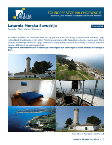 Latarnia Morska Savudrija Drukuj PDF Savudrija / Riwiera Umag / Chorwacja Szanowni Państwo, w załączniku PDF zostały podane tylko informacje podstawowe o obiekcie i jego jednostkach kwaterunkowych, które Państwa zainteresowały. Wszystkie zdjęcia, ewentualnie film i kolejne informacje o obiekcie i jego okolicy oraz ceny i pozostałe wolne terminy otrzymają Państwo poprzez kliknięcie na następujący link: http://www.zakwaterowanie-chorwacja.com/object/pl/Chorwacja/latarnia-morska-savudrija/2 19/1/ Ilość zdjęć w fotogalerii obiektu: 12 Latarnia Morska Savudrija 1 / 7 Parę słów Savudrija jest najstarszą latarnią na Adriatyku. Została zbudowana w 1818 roku. Jest to również obiekt usytuowany najbardziej na północ w pobliżu słoweńskiej granicy. Znajduje się na przylądku o tej samej nazwie, oddalonym 30 m od morza. W blizkości znajduje się wiele restauracji i plaży. Miasto Umag jest oddalone 9 km a włoski port Terst 56 km. Komunikacja z pozostałymi miastami jest również bobra. Do latarni można się łatwo dostać samochodem osobowym. Do obiektu należy opłocony ogród z bujną roślinnością śródziemnomorską i miejscami parkingowymi. Do dyspozycji gości jest jedan czteroosobowy apartment. Dzięki dobrej komunikacji z poblizkimi osadami istnieje możliwość regularnego zaopatrywania we wszelkie produkty spożywcze. Dzięki atrakcyjnemu połozeniu obiekt ten jest szczególnie polecany miłośnikom windsurfingu. Zalety ● ● ● ● ● ● Dom zaledwie 30 m od plaży żwirkowej Ogród pod domem Parking przed domem Zapewniony zasięg sieci komórkowej Komfortowo wyposażone apartamenty TV/SAT Do dyspozycji leżaki i parasole słoneczne Odległość od morza: 30 m Odległość od plaży: 30 m Apartament APP 4 pomieszczenia: 3 osób: 4 parter M/06-IS-RM-SA-1 Sypialnia: 1 x łóżko małżeńskie, szafa, nocne stoliki radek Sypialnia: 2 x łóżko, szafa, nocne stoliki radek Kuchnia: lodówka, kuchenka gazowa, naczynia radek łazienka: wanna radek WC: WC radek Last Minute bez klimatyzacji 28.05 - 02.06.2017 Cena pobytu (4 os.): 2 421 PLN 2 421 PLN Latarnia Morska Savudrija 2 / 7 Sposób zapłaty za dany obiekt W przypadku tego obiektu zaliczka wynosi 50% ceny pobytu. Pozostałe 50% ceny pobytu należy opłacić najpóźniej do 45 dni przed rozpoczęciem zakwaterowania. W przypadku złożenia rezerwacji w terminie krótszym niż do 45 dni przed rozpoczęciem zakwaterowania, wyfakturujemy dla Państwa 100% ceny pobytu. Jeśli rezerwują Państwo pobyt w terminie dłuższym niż 3 miesiące przed rozpoczęciem zakwaterowania, płatność może być rozłożona na 3 raty. Czy mają Państwo jakieś pytanie? Jeśli mają Państwo pytania lub w celu uzyskania oferty zakwaterowania czy złożenia telefonicznego zamówienia, prosimy o kontakt na numer telefonu (+48) 222 195 293. W celu uzyskania informacji o zamówieniu (jeśli już zostało złożone), prosimy o kontakt bezpośrednio do pracownika, który zajmuje się Państwa rezerwacją. Numer telefonu znajduje się w stopce maila z którego Państwu wysyłalismy wiadomość. Adria Databanka | Panská 2, 602 00 Brno, Czech Republic | [email protected] Tel: +420 542 215 267 | Fax: +420 542 215 207 | GSM 1: +420 775 999 955 | GSM 2: +420 777 289 676 Drukuj PDF Latarnia Morska Savudrija 3 / 7 Fotogaleria Latarnia Morska Savudrija 4 / 7 Latarnia Morska Savudrija 5 / 7 Latarnia Morska Savudrija 6 / 7 Latarnia Morska Savudrija 7 / 7