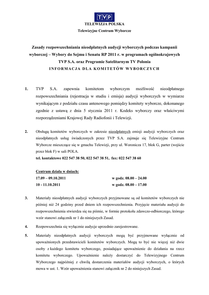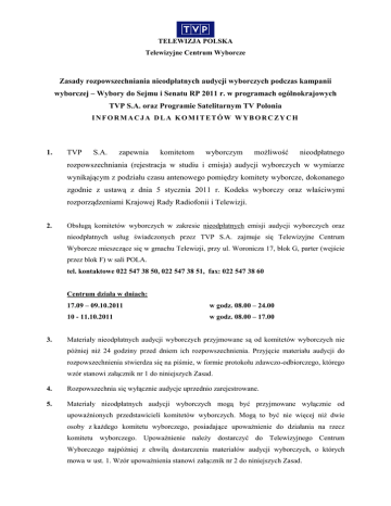 TELEWIZJA POLSKA Telewizyjne Centrum Wyborcze Zasady rozpowszechniania nieodpłatnych audycji wyborczych podczas kampanii wyborczej – Wybory do Sejmu i Senatu RP 2011 r. w programach ogólnokrajowych TVP S.A. oraz Programie Satelitarnym TV Polonia INFORMACJA DLA KOMITETÓW WYBORCZYCH 1. TVP S.A. zapewnia komitetom wyborczym możliwość nieodpłatnego rozpowszechniania (rejestracja w studiu i emisja) audycji wyborczych w wymiarze wynikającym z podziału czasu antenowego pomiędzy komitety wyborcze, dokonanego zgodnie z ustawą z dnia 5 stycznia 2011 r. Kodeks wyborczy oraz właściwymi rozporządzeniami Krajowej Rady Radiofonii i Telewizji. 2. Obsługą komitetów wyborczych w zakresie nieodpłatnych emisji audycji wyborczych oraz nieodpłatnych usług świadczonych przez TVP S.A. zajmuje się Telewizyjne Centrum Wyborcze mieszczące się w gmachu Telewizji, przy ul. Woronicza 17, blok G, parter (wejście przez blok F) w sali POLA. tel. kontaktowe 022 547 38 50, 022 547 38 51, fax: 022 547 38 60 Centrum działa w dniach: 3. 17.09 – 09.10.2011 w godz. 08.00 – 24.00 10 - 11.10.2011 w godz. 08.00 – 17.00 Materiały nieodpłatnych audycji wyborczych przyjmowane są od komitetów wyborczych nie później niż 24 godziny przed dniem ich rozpowszechnienia. Przyjęcie materiału audycji do rozpowszechnienia stwierdza się na piśmie, w formie protokołu zdawczo-odbiorczego, którego wzór stanowi załącznik nr 1 do niniejszych Zasad. 4. Rozpowszechnia się wyłącznie audycje uprzednio zarejestrowane. 5. Materiały nieodpłatnych audycji wyborczych mogą być przyjmowane wyłącznie od upoważnionych przedstawicieli komitetów wyborczych. Mogą to być nie więcej niż dwie osoby z każdego komitetu wyborczego, posiadające upoważnienie do działania na rzecz komitetu wyborczego. Upoważnienie należy dostarczyć do Telewizyjnego Centrum Wyborczego najpóźniej z chwilą dostarczenia materiałów audycji wyborczych, o których mowa w ust. 1. Wzór upoważnienia stanowi załącznik nr 2 do niniejszych Zasad. 6. W przypadku niedostarczenia audycji wyborczej w wyznaczonym terminie lub w przypadku wstrzymania emisji w wyniku postanowień właściwych władz państwowych, blok audycji wyborczych ulega odpowiedniemu skróceniu. 7. W przypadku niedostarczenia materiału audycji wyborczej przez komitet wyborczy, TVP S.A. umieszcza w odpowiednim miejscu bloku wyborczego, planszę o czasie trwania 10 sekund, o następującej treści: „Komitet Wyborczy ............ (nazwa)............ nie dostarczył audycji wyborczej”. 8. W przypadku dostarczenia materiału audycji wyborczej przekraczającej wymiar czasu przyznanego komitetowi wyborczemu w danym bloku wyborczym, TVP S.A. wzywa niezwłocznie komitet do skrócenia czasu audycji wyborczej i dostarczenia jej najpóźniej w ciągu 8 godzin od wezwania. W przypadku ponownego dostarczenia materiału audycji przekraczającej wymiar czasu przyznanego komitetowi wyborczemu lub niedostarczenia skróconej audycji w ciągu 8 godzin od wezwania, emisja audycji zostanie przerwana po wykorzystaniu należnego czasu emisyjnego. 9. W przypadku dostarczenia materiału audycji krótszej niż czas emisji przysługujący komitetowi wyborczemu w danym bloku wyborczym, przyjmuje się, że czas emisyjny został wykorzystany. 10. Materiały nieodpłatnych audycji wyborczych dostarczane przez komitety wyborcze powinny odpowiadać warunkom technicznym przewidzianym dla emisji telewizyjnej. Informacje o warunkach technicznych, jakim powinny odpowiadać zarejestrowane nieodpłatne audycje wyborcze, określa załącznik nr 3 do niniejszych Zasad. 11. Jeżeli materiały nieodpłatnych audycji wyborczych nie odpowiadają wymaganym warunkom technicznym, TVP S.A. zwraca się do komitetu wyborczego o usunięcie wskazanych usterek i dostarczenie poprawionej audycji wyborczej najpóźniej na 8 godzin przed ustalonym czasem emisji. 12. Audycje wyborcze dostarczone przez komitety wyborcze, po zgraniu w bloki audycji wyborczych i rozpowszechnieniu, przechowywane są co najmniej przez okres 1 miesiąca od dnia wygaśnięcia uprawnienia do nadania audycji wyborczej. 13. Zwrot kaset z nieodpłatnymi audycjami wyborczymi powierzonych TVP S.A. przez komitety wyborcze, do połączenia w bloki wyborcze, może nastąpić nie wcześniej niż 48 godzin po emisji bloku wyborczego, i nie później niż w dniu zakończenia pracy Telewizyjnego Centrum Wyborczego, tj. do dnia 11 października 2011 r. do godz. 17.00. 14. Wykorzystanie audycji wyborczej dostarczonej przez komitet wyborczy w celu realizacji przez TVP S.A. własnych audycji oraz udostępnienia ich innym podmiotom, może nastąpić wyłącznie za pisemną zgodą właściwego komitetu wyborczego. 15. Emisja poszczególnych audycji wyborczych następuje w kolejności wynikającej z przeprowadzonego losowania. Losowanie kolejności emisji w Programie 1, Programie 2 oraz TVP Polonia odbędzie się w siedzibie TVP SA przy ul. Woronicza 17 w Warszawie, w dniu 20 września 2011 r. o godz. 15.30 (studio S-5, blok G, wejście przez blok F). TVP S.A. przed rozpoczęciem losowania poinformuje komitety wyborcze o przyjętych zasadach losowania. 16. Nieodpłatne audycje wyborcze rozpowszechnia się w blokach pod nazwą „AUDYCJE KOMITETÓW WYBORCZYCH”. Kolejne audycje w ramach bloku rozdziela się jednakową planszą i znakiem dźwiękowym. Treść audycji ustala komitet wyborczy. 17. Przed i po emisji bloku audycji podaje się informację następującej treści: „Odpowiedzialność za treść i jakość techniczną audycji wyborczych ponoszą komitety wyborcze”. 18. Od komitetów wyborczych odbiera się oświadczenie o przyjęciu pełnej odpowiedzialności za treść audycji wyborczych oraz ich jakość techniczną. Wzór oświadczenia stanowi załącznik nr 4 do niniejszych Zasad. 19. Informuje się komitety wyborcze o konieczności uzyskania praw do utworów wykorzystanych w audycji wyborczej. 20. Przed rozpowszechnieniem audycji, odbier