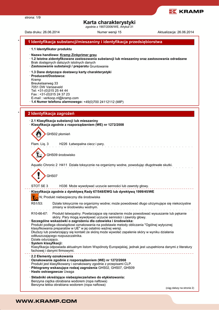 38.1.2 strona: 1/9 Karta charakterystyki zgodnie z 1907/2006/WE, Artykuł 31 Data druku: 26.06.2014 * Numer wersji 15 Aktualizacja: 26.06.2014 1 Identyfikacja substancji/mieszaniny i identyfikacja przedsiębiorstwa · 1.1 Identyfikator produktu · Nazwa handlowa: Kramp Zinkprimer grau · 1.2 Istotne zidentyfikowane zastosowania substancji lub mieszaniny oraz zastosowania odradzane Brak dostępnych dalszych istotnych danych · Zastosowanie substancji / preparatu Gruntowanie · 1.3 Dane dotyczące dostawcy karty charakterystyki · Producent/Dostawca: Kramp Breukelaarweg 33 7051 DW Varsseveld Tel: +31-(0)315 25 44 44 Fax : +31-(0)315 24 37 23 E-mail : [email protected] · 1.4 Numer telefonu alarmowego: +49(0)700 24112112 (MIP) * 2 Identyfikacja zagroŜeń · 2.1 Klasyfikacja substancji lub mieszaniny · Klasyfikacja zgodnie z rozporządzeniem (WE) nr 1272/2008 GHS02 płomień Flam. Liq. 3 H226 Łatwopalna ciecz i pary. GHS09 środowisko Aquatic Chronic 2 H411 Działa toksycznie na organizmy wodne, powodując długotrwałe skutki. GHS07 STOT SE 3 H336 MoŜe wywoływać uczucie senności lub zawroty głowy. · Klasyfikacja zgodnie z dyrektywą Rady 67/548/EWG lub dyrektywą 1999/45/WE N; Produkt niebezpieczny dla środowiska R51/53: Działa toksycznie na organizmy wodne; moŜe powodować długo utrzymujące się niekorzystne zmiany w środowisku wodnym. R10-66-67: Produkt łatwopalny. Powtarzające się naraŜenie moŜe powodować wysuszanie lub pękanie skóry. Pary mogą wywoływać uczucie senności i zawroty głowy. · Szczególne wskazówki o zagroŜeniu dla człowieka i środowiska: Produkt podlega obowiązkowi oznakowania na podstawie metody obliczania "Ogólnej wytycznej klasyfikowania preparatów w UE" w jej ostatnio waŜnej wersji. DłuŜszy lub powtarzający się kontakt ze skórą moŜe wywołać zapalenie skóry w wyniku działania odtłuszczającego rozpuszczalnika. Działa odurzająco. · System klasyfikacji: Klasyfikacja odpowiada aktualnym listom Wspólnoty Europejskiej, jednak jest uzupełniona danymi z literatury fachowej i danymi firmowymi. · 2.2 Elementy oznakowania · Oznakowanie zgodnie z rozporządzeniem (WE) nr 1272/2008 Produkt jest klasyfikowany i oznakowany zgodnie z przepisami CLP. · Piktogramy wskazujące rodzaj zagroŜenia GHS02, GHS07, GHS09 · Hasło ostrzegawcze Uwaga · Składniki określające niebezpieczeństwo do etykietowania: Benzyna cięŜka obrabiana wodorem (ropa naftowa) Benzyna lekka obrabiana wodorem (ropa naftowa) (ciąg dalszy na stronie 2) 38.1.2 strona: 2/9 Karta charakterystyki zgodnie z 1907/2006/WE, Artykuł 31 Data druku: 26.06.2014 Numer wersji 15 Aktualizacja: 26.06.2014 Nazwa handlowa: Kramp Zinkprimer grau (ciąg dalszy od strony 1) · Zwroty wskazujące rodzaj zagroŜenia H226 Łatwopalna ciecz i pary. H336 MoŜe wywoływać uczucie senności lub zawroty głowy. H411 Działa toksycznie na organizmy wodne, powodując długotrwałe skutki. · Zwroty wskazujące środki ostroŜności P101 W razie konieczności zasięgnięcia porady lekarza naleŜy pokazać pojemnik lub etykietę. P102 Chronić przed dziećmi. P103 Przed uŜyciem przeczytać etykietę. P210 Przechowywać z dala od źródeł ciepła/iskrzenia/otwartego ognia/gorących powierzchni. Palenie wzbronione. P241 UŜywać elektrycznego/wentylującego/oświetleniowego/przeciwwybuchowego sprzętu. P261 Unikać wdychania pyłu/dymu/gazu/mgły/par/rozpylonej cieczy. P303+P361+P353 W PRZYPADKU KONTATKU ZE SKÓRĄ (lub z włosami): Natychmiast usunąć/zdjąć całą zanieczyszczoną odzieŜ. Spłukać skórę pod strumieniem wody/prysznicem. P405 Przechowywać pod zamknięciem. P501 Zawartość / pojemnik usuwać zgodnie z przepisami miejscowymi / regionalnymi / narodowymi / międzynarodowymi. · Dane dodatkowe: EUH066 Powtarzające się naraŜenie moŜe powodować wysuszanie lub pękanie skóry. Zawiera oksym butan-2-onu. MoŜe powodować wystąpienie reakcji alergicznej. · 2.3 Inne zagroŜenia · Wyniki oceny właściwości PBT i vPvB · PBT: Nie nadający się do zastosowania. · vPvB: Nie nadający się do zastosowania. * 3 Skład/informacja o składnikach · 3.2 Charakterystyka chemiczna: Mieszaniny · Opis: Mieszanka z niŜej wymienionych składników z bezpiecznymi domieszkami. · Składniki niebezpieczne: CAS: 64742-48-9 Benzyna cięŜka obrabiana wodorem (ropa naftowa) EINECS: 265-150-3 Xn R65 Reg.nr.: 01-2119463258-33 R10-66-67 Flam. Liq. 3, H226; Asp. Tox. 1, H304; STOT SE 3, H336 CAS: 64742-49-0 Benzyna lekka obrabiana wodorem (ropa naftowa) EINECS: 265-151-9 Xn R65 R10-66-67 Flam. Liq. 3, H226; Asp. Tox. 1, H304; STOT SE 3, H336 CAS: 1314-13-2 zinc oxide EINECS: 215-222-5 N R50/53 Aquatic Acute 1, H400; Aquatic Chronic 1, H410 CAS: 14808-60-7 Quartz (SiO2) EINECS: 238-878-4 CAS: 96-29-7 oksym butan-2-onu EINECS: 202-496-6 Xn R21-40; Xi R41; Xi R43 Rakotw. Kat. 3 Carc. 2, H351; Eye Dam. 1, H318; Acute Tox. 4, H312; Skin Sens. 1, H317 · Wskazówki dodatkowe: Pełna treść przytoczonych wskazówek dotyczących zagroŜeń znajduje się w rozdziale 16. * 15-<20% 3-<10% 3-<10% 1-<2,5% 0,1-<0,3% 4 Środki pierwszej pomocy · 4.1 Opis środków pierwszej pomocy · Po wdychaniu: Dostarczyć świeŜe powietrze, w razie dolegliwości wezwać lekarza. · Po styczności ze skórą: Natychmiast zmyć wodą i mydłem i dobrze spłukać. · Po styczności z okiem: Płukać oczy z otwartą powieką przez kilka minut pod bieŜącą wodą. · Po przełknięciu: Przy trwałych dolegliwościach porozumieć się z lekarzem. (ciąg dalszy na stronie 3) 38.1.2 strona: 3/9 Karta charakterystyki zgodnie z 1907/2006/WE, Artykuł 31 Data druku: 26.06.2014 Numer wersji 15 Aktualizacja: 26.06.2014 Nazwa handlowa: Kramp Zinkprimer grau (ciąg dalszy od strony 2) · 4.2 NajwaŜniejsze ostre i opóźnione objawy oraz skutki naraŜenia Brak dostępnych dalszych istotnych danych · 4.3 Wskazania dotyczące wszelkiej natychmiastowej pomocy lekarskiej i szczególnego postępowania z poszkodowanym Brak do