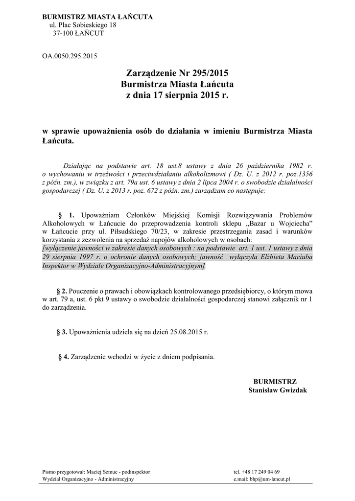 BURMISTRZ MIASTA ŁAŃCUTA ul. Plac Sobieskiego 18 37-100 ŁAŃCUT OA.0050.295.2015 Zarządzenie Nr 295/2015 Burmistrza Miasta Łańcuta z dnia 17 sierpnia 2015 r. w sprawie upoważnienia osób do działania w imieniu Burmistrza Miasta Łańcuta. Działając na podstawie art. 18 ust.8 ustawy z dnia 26 października 1982 r. o wychowaniu w trzeźwości i przeciwdziałaniu alkoholizmowi ( Dz. U. z 2012 r. poz.1356 z późn. zm.), w związku z art. 79a ust. 6 ustawy z dnia 2 lipca 2004 r. o swobodzie działalności gospodarczej ( Dz. U. z 2013 r. poz. 672 z późn. zm.) zarządzam co następuje: § 1. Upoważniam Członków Miejskiej Komisji Rozwiązywania Problemów Alkoholowych w Łańcucie do przeprowadzenia kontroli sklepu „Bazar u Wojciecha” w Łańcucie przy ul. Piłsudskiego 70/23, w zakresie przestrzegania zasad i warunków korzystania z zezwolenia na sprzedaż napojów alkoholowych w osobach: [wyłączenie jawności w zakresie danych osobowych : na podstawie art. 1 ust. 1 ustawy z dnia 29 sierpnia 1997 r. o ochronie danych osobowych; jawność wyłączyła Elżbieta Maciuba Inspektor w Wydziale Organizacyjno-Administracyjnym] § 2. Pouczenie o prawach i obowiązkach kontrolowanego przedsiębiorcy, o którym mowa w art. 79 a, ust. 6 pkt 9 ustawy o swobodzie działalności gospodarczej stanowi załącznik nr 1 do zarządzenia. § 3. Upoważnienia udziela się na dzień 25.08.2015 r. § 4. Zarządzenie wchodzi w życie z dniem podpisania. BURMISTRZ Stanisław Gwizdak Pismo przygotował: Maciej Szmuc - podinspektor Wydział Organizacyjno - Administracyjny tel. +48 17 249 04 69 e.mail: [email protected] Załącznik Nr 1 do Zarządzenia Nr 295/2015 Burmistrza Miasta Łańcuta z dnia 17 sierpnia 2015 r. POUCZENIE O PRAWACH I OBOWIĄZKACH KONTROLOWANEGO PRZEDSIĘBIORCY Wyciąg z ustawy z dnia 2 lipca 2004 r. o swobodzie działalności gospodarczej ( Dz.U. z 2013 r. poz. 672 z późn. zm.) Rozdział 5 Kontrola działalności gospodarczej przedsiębiorcy. Art. 77. 4. Przedsiębiorcy, który poniósł szkodę na skutek przeprowadzenia czynności kontrolnych z naruszeniem przepisów prawa w zakresie kontroli działalności gospodarczej przedsiębiorcy, przysługuje odszkodowanie. Art. 79. 4. Kontrolę wszczyna się nie wcześniej niż po upływie 7 dni i nie później niż przed upływem 30 dni od dnia doręczenia zawiadomienia o zamiarze wszczęcia kontroli. Jeżeli kontrola nie zostanie wszczęta w terminie 30 dni od dnia doręczenia zawiadomienia, wszczęcie kontroli wymaga ponownego zawiadomienia. Art. 79a. 1. Czynności kontrolne mogą być wykonywane przez pracowników organów kontroli po okazaniu przedsiębiorcy albo osobie przez niego upoważnionej legitymacji służbowej upoważniającej do wykonywania takich czynności oraz po doręczeniu upoważnienia do przeprowadzenia kontroli, chyba że przepisy szczególne przewidują możliwość podjęcia kontroli po okazaniu legitymacji. W takim przypadku upoważnienie doręcza się przedsiębiorcy albo osobie przez niego upoważnionej w terminie określonym w tych przepisach, lecz nie później niż trzeciego dnia od wszczęcia kontroli. 2. Podjęcie czynności kontrolnych po okazaniu legitymacji służbowej, na podstawie przepisów szczególnych, może dotyczyć jedynie przypadków, gdy czynności kontrolne są niezbędne dla przeciwdziałania popełnieniu przestępstwa lub wykroczenia, przeciwdziałania popełnieniu przestępstwa skarbowego lub wykroczenia skarbowego lub zabezpieczenia dowodów jego popełnienia, a także gdy przeprowadzenie kontroli jest uzasadnione bezpośrednim zagrożeniem życia, zdrowia lub środowiska naturalnego. 3. Czynności kontrolne mogą być wykonywane przez osoby niebędące pracownikami organu kontroli, jeżeli przepisy odrębnych ustaw tak stanowią. 8. Zakres kontroli nie może wykraczać poza zakres wskazany w upoważnieniu. 9. W razie nieobecności kontrolowanego przedsiębiorcy lub osoby przez niego upoważnionej, czynności kontrolne mogą być wszczęte po okazaniu legitymacji służbowej pracownikowi kontrolowanego, który może być uznany za osobę, o której mowa w art. 97 ustawy z dnia 23 kwietnia 1964 r. - Kodeks cywilny (Dz. U. Nr 16, poz. 93, z późn. zm.), lub w obecności przywołanego świadka, którym powinien być funkcjonariusz publiczny, niebędący jednak pracownikiem organu przeprowadzającego kontrolę. Art. 79b. W przypadku wszczęcia czynności kontrolnych po okazaniu legitymacji służbowej, przed podjęciem pierwszej czynności kontrolnej, osoba podejmująca kontrolę ma obowiązek poinformować kontrolowanego przedsiębiorcę lub osobę, wobec której podjęto czynności kontrolne, o jego prawach i obowiązkach w trakcie kontroli. Art. 80. 1. Czynności kontrolnych dokonuje się w obecności kontrolowanego lub osoby przez niego upoważnionej. 3. Kontrolowany jest obowiązany do pisemnego wskazania osoby upoważnionej do reprezentowania go w trakcie kontroli, w szczególności w czasie jego nieobecności. 4. Do czasu trwania kontroli, o którym mowa w art. 83 ust. 1, nie wlicza się czasu nieobecności kontrolowanego przedsiębiorcy lub osoby przez niego upoważnionej, jeżeli stanowi to przeszkodę w przeprowadzeniu czynności kontrolnych. 5. W razie nieobecności kontrolowanego lub osoby przez niego upoważnionej albo niewykonania przez kontrolowanego obowiązku, o którym mowa w ust. 3, czynności kontrolne mogą być wykonywane w obecności innego pracownika kontrolowanego, który może być uznany za osobę, o której mowa w art. 97 ustawy z dnia 23 kwietnia 1964 r. - Kodeks cywilny, lub w obecności przywołanego świadka, którym powinien być funkcjonariusz publiczny, niebędący jednak pracownikiem organu przeprowadzającego kontrolę. Art. 80a. 1. Kontrolę przeprowadza się w siedzibie kontrolowanego lub w miejscu wykonywania działalności gospodarczej oraz w godzinach pracy lub w czasie faktycznego wykonywania działalności gospodarczej przez kontrolowanego. 2