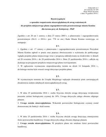 Załącznik nr 2 do Uchwały Nr 438 Rady Miasta Konina z dnia 19 grudnia 2016 r. Rozstrzygnięcie o sposobie rozpatrzenia nieuwzględnionych uwag wniesionych do projektu miejscowego planu zagospodarowania przestrzennego miasta Konina dla terenu przy ul. Kolejowej - PKP Zgodnie z art. 20 ust 1 ustawy z dnia 27 marca 2003 r. o planowaniu i zagospodarowaniu przestrzennym (Dz.U. z 2016 r. poz. 778 ze zm.) Rada Miasta Konina rozstrzyga, co następuje: § 1. 1. Zgodnie z art. 17 ustawy o planowaniu i zagospodarowaniu przestrzennym Prezydent Miasta Konina ogłosił w prasie oraz poprzez obwieszczenie o wyłożeniu do publicznego wglądu projektu planu miejscowego wraz z prognozą oddziaływania na środowisko w dniach od 28 września 2016 r. do 28 października 2016 r. Dnia 25 października 2016 r. odbyła się dyskusja na przyjętymi projekcie miejscowego planu rozwiązaniami. 2. W ogłoszeniu wyznaczono nieprzekraczalny termin na dzień 14 listopada 2016 r., do którego można było wnosić uwagi dotyczące projektu planu. § 2. W wyznaczonym terminie do Urzędu Miejskiego wpłynęło dwanaście pism zawierających dwadzieścia siedem odrębnych nieuwzględnionych uwag. § 3. 1. W dniu 25 października 2016 r. osoba fizyczna złożyła uwagę dotyczącą zwiększenia procentu zieleni biologicznie czynnej do 10%. Uwaga dotyczyła całego obszaru objętego planem. 2. Uwaga została nieuwzględniona. Wskaźnik powierzchni biologicznie czynnej został dostosowany do funkcji i skali terenu. § 4. 1. W dniu 25 października 2016 r. osoba fizyczna złożyła uwagę dotyczącą zmniejszenia ilości powierzchni handlowej. Uwaga dotyczyła całego obszaru objętego planem. 2. Uwaga została nieuwzględniona. W projekcie planu nie ustalono ilości powierzchni handlowej. 2 § 5. 1. W dniu 25 października 2016 r. osoba fizyczna złożyła uwagę dotyczącą ograniczenia wskaźnika zabudowy do 30%. Uwaga dotyczyła całego obszaru objętego planem. 2. Uwaga została nieuwzględniona. Wskaźnik powierzchni zabudowy został dostosowany do funkcji i skali terenu. Dokument nadrzędny przyjęty uchwałą nr 42 Rady Miasta Konina z dnia 25 lutego 2015 r., jakim jest SUiKZ dla tego terenu nie wskazuje w tym zakresie ograniczeń. § 6. 1. W dniu 25 października 2016 r. osoba fizyczna złożyła uwagę dotyczącą uwzględnienia w mpzp zabudowy peronów i zachowania układu komunikacyjnego w spójnej funkcji. Uwaga dotyczyła całego obszaru objętego planem. 2. Uwaga została nieuwzględniona. Perony zlokalizowane są poza granicami planu. Rozwiązania komunikacyjne będą określone w projekcie zagospodarowania terenu na etapie sporządzania projektu budowlanego. Ustalenie wykraczające poza zakres art. 15 ustawy o pizp. § 7. 1. W dniu 25 października 2016 r. osoba fizyczna złożyła uwagę dotyczącą zwiększenia miejsc postojowych do 4/100m2. Uwaga dotyczyła całego obszaru objętego planem. 2. Uwaga została nieuwzględniona. Ilość miejsc postojowych została przyjęta na poziomie dwukrotnie wyższym niż podana w SUiKZ. Wskaźnik został dostosowany do funkcji i skali terenu. § 8. 1. W dniu 25 października 2016 r. osoba fizyczna złożyła uwagę dotyczącą zmniejszenia powierzchni zabudowy działek z 50% do 40%. Uwaga dotyczyła całego obszaru objętego planem. 2. Uwaga została nieuwzględniona. Wskaźnik powierzchni zabudowy został dostosowany do funkcji i skali terenu. Dokument nadrzędny przyjęty uchwałą nr 42 Rady Miasta Konina z dnia 25 lutego 2015 r., jakim jest SUiKZ dla tego terenu w zakresie powierzchni zabudowy nie wskazuje ograniczeń. 3 § 9. 1. W dniu 25 października 2016 r. osoba fizyczna złożyła uwagę dotyczącą wydzielenia strefy zieleni (rekreacja) w obrębie Dębu "Zawiadowca". Uwaga dotyczyła całego obszaru objętego planem. 2. Uwaga została nieuwzględniona. W celu ochrony pomnika przyrody wyznaczono nieprzekraczalną linię zabudowy w odległości wskazanej w przepisie (zarządzeniu). § 10. 1. W dniu 25 października 2016 r. osoba fizyczna złożyła uwagę dotyczącą ustalenia wskaźnika miejsc postojowych 10 na 100 m2 dla dworca PKP. Uwaga dotyczyła całego obszaru objętego planem. 2. Uwaga została nieuwzględniona. Ilość miejsc postojowych została przyjęta na poziomie dwukrotnie wyższym niż podana w SUiKZ. Wskaźnik został dostosowany do funkcji i skali terenu. Dokument nadrzędny przyjęty uchwałą nr 42 Rady Miasta Konina z dnia 25 lutego 2015 r., jakim jest SUiKZ dla tego terenu wskazuje dwukrotnie niższą ilość miejsc postojowych. § 11. 1. W dniu 31 października 2016 r. osoba fizyczna złożyła uwagę dotyczącą tego, iż projekt nie uwzględnia charakterystyki miasta jego ukształtowania urbanistycznego. warunków glebowych, lokalnego klimatu, zieleni. Uwaga dotyczyła całego obszaru objętego planem. 2. Uwaga została nieuwzględniona. Charakter i parametry planowanej zabudowy zostały dostosowane do zabudowy zlokalizowanej na sąsiednich działkach. Dokument nadrzędny, jakim jest SUiKZ wskazuje możliwość lokalizacji budynku o wysokości do 20 metrów. § 12. 1. W dniu 31 października 2016 r. osoba fizyczna złożyła uwagę dotyczącą tego, iż w projekcie przypadkowo określano nieprzekraczalną linię zabudowy oraz brak jest zapisów biorących pod ochronę „budynek – wizytówkę dla miasta” na końcu osi widokowej. Uwaga dotyczyła całego obszaru objętego planem. 2. Uwaga została nieuwzględniona. Wprowadzono odpowiednią wysokość zabudowy oraz ustalono lokalizację akcentu urbanistyczno-architektonicznego oraz zabudowy, która kształtuje plac na zakończeniu osi widokowej. wskazano linię 4 § 13. 1. W dniu 31 października 2016 r. osoba fizyczna złożyła uwagę dotyczącą tego, iż w projekcie brak jest konkretnie sformułowanej funkcji terenu, obsługa podróżnych kolei i komunikacji autobusowej. Zapis §19.2 pkt 1 nie dopuszcza budowy nowego zintegrowanego centrum obsługi podróżnych z usługami towa