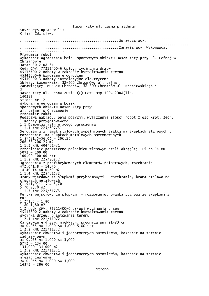 Basen Katy ul. Lesna przedmiar Kosztorys opracowali: Kiljan Zdzisław, ................................................................................ ...............................................Sprawdzający: ................................................................................ ...............................................Zamawiający: Wykonawca: .......... .......... Przedmiar robót Wykonanie ogrodzenia boisk sportowych obiektu Basen-Kąty przy ul. Leśnej w Chrzanowie Data: 2012-08-31 Kody CPV: 77211400-6 Usługi wycinania drzew 45112700-2 Roboty w zakresie kształtowania terenu 45342000-6 Wznoszenie ogrodzeń 45310000-3 Roboty instalacyjne elektryczne Obiekt: Basen-Kąty, 32-500 Chrzanów, ul. Leśna Zamawiający: MOKSiR Chrzanów, 32-500 Chrzanów ul. Broniewskiego 4 Basen Kąty ul. Leśna Zuzia (C) DataComp 1994-2008(lic. 14029) strona nr: 2 Wykonanie ogrodzenia boisk sportowych obiektu Basen-Kąty przy ul. Leśnej w Chrzanowie Przedmiar robót Podstawa nakładu, opis pozycji, wyliczenie ilości robót Ilość Krot. Jedn. 1 Roboty przygotowawcze 1.1 DemontaŜ istniejącego ogrodzenia 1.1.1 KNR 225/307/3 Ogrodzenia z ramek stalowych wypełnionych siatką na słupkach stalowych , rozebranie, na słupkach metalowych obetonowanych 1,5*(81,5+56,0) = 206,25 206,25 206,25 m2 1.1.2 KNR 404/814/1 Przecinanie poprzeczne palnikiem tlenowym stali okrągłej, Fi do 14 mm 50*2 = 100,00 100,00 100,00 szt 1.1.3 KNR 225/308/2 Ogrodzenia z prefabrykowanych elementów Ŝelbetowych, rozebranie 4*2,0*1,8 = 14,40 14,40 14,40 0,50 m2 1.1.4 KNR 225/315/2 Bramy wjazdowe ze słupkami przybramowymi - rozebranie, brama stalowa na słupkach metalowych (1,9+1,9)*1,5 = 5,70 5,70 5,70 m2 1.1.5 KNR 225/317/3 Furtki wejściowe ze słupkami - rozebranie, bramka stalowa ze słupkami z rur 1,2*1,5 = 1,80 1,80 1,80 m2 1.2 Kody CPV: 77211400-6 Usługi wycinania drzew 45112700-2 Roboty w zakresie kształtowania terenu Wycinka drzew, plantowanie terenu 1.2.1 KNR 221/110/2 Karczowanie drzew, miękkich, średnica pni 21-30cm R= 0,955 M= 1,000 S= 1,000 5,00 szt 1.2.2 KNR 221/112/2 Wykaszanie chwastów i jednorocznych samosiewów, koszenie na terenie zadrzewionym R= 0,955 M= 1,000 S= 1,000 67*2 = 134,00 134,000 134,000 m2 1.2.3 KNR 221/112/1 Wykaszanie chwastów i jednorocznych samosiewów, koszenie na terenie niezadrzewionym R= 0,955 M= 1,000 S= 1,000 143*2 = 286,00 Strona 1 Basen Katy ul. Lesna przedmiar 286,00 286,00 m2 1.2.4 KNR 201/126/1 Usunięcie warstwy ziemi urodzajnej (humus) przy pomocy spycharek, grubość warstwy do 15cm 480*2 = 960,00 960,00 960,00 m2 1.2.5 KNR 201/233/1 Mechaniczne plantowanie terenu spycharkami, 55kW (75KM), grunt kategorii I-II 480*1,5 = 720,00 720,00 720,00 m2 Basen Kąty ul. Leśna Zuzia (C) DataComp 1994-2008(lic. 14029) strona nr: 3 Roboty budowlane montaŜowe Podstawa nakładu, opis pozycji, wyliczenie ilości robót Ilość Krot. Jedn. 2 Roboty budowlane montaŜowe 2.1 Kody CPV: 45342000-6 Wznoszenie ogrodzeń Wykonanie ogrodzenia betonowego 2.1.1 KNR 225/308/1 (1) Ogrodzenia z prefabrykowanych elementów Ŝelbetowych, budowa, deski pełne, słupki osadzone w betonie !! (480+8)*1,3 = 634,40 634,40 634,40 m2 2.1.2 KNR 225/308/1 (2) Ogrodzenia z prefabrykowanych elementów Ŝelbetowych, budowa, deski aŜurowe słupki osadzone w betonie !! (480+8)*0,5 = 244,00 244,00 244,00 m2 2.2 Kody CPV: 45342000-6 Wznoszenie ogrodzeń Wykonanie ogrodzenia z przęseł stalowych z materiału inwestora 2.2.1 KNR 401/1301/10 (2) Naprawa róŜnych elementów metalowych (wymiana lub uzupełnienie), ogrodzenia z siatki w ramach na słupach z rur lub kształtowników przygotowanie przęseł ogrodzeniowych i słupków do montaŜu - elementy inwestora 112,00 0,50 m2 2.2.2 KNR 401/1212/12 Malowanie farbą olejną elementów metalowych, siatki ciągnione i plecione z ramkami stalowymi, miniowanie 112,00 m2 2.2.3 KNR 401/1212/10 Malowanie farbą olejną elementów metalowych, siatki ciągnione i plecione z ramkami stalowymi, 1-krotne 112,00 m2 2.2.4 KNR 225/319/1 Ogrodzenia typu "Metro", budowa - przęsła i słupki stalowe ogrodzeniowe inwestora - słupki betonowane !! 56*2 = 112,00 112,00 112,00 m2 2.3 Kody CPV: 45342000-6 Wznoszenie ogrodzeń Wykonanie i montaŜ bramy przesuwnej i bramki 2.3.1 KNR 201/201/2 Roboty ziemne koparkami przedsiębiernymi z transportem urobku samochodami samowyładowczymi do 1km, koparka 0,15m3, grunt kategorii III 2,6*1,2*1,0 = 3,12 3,12 3,12 m3 2.3.2 KNR 201/230/1 (1) Zasypywanie wykopów spycharkami, przemieszczanie na odległość do 10m, grunt kategorii I-III, spycharka 55kW (75KM) 2,12 m3 2.3.3 KNR 202/203/2 (2) Stopy fundamentowe betonowe, objętość do 1.0m3, beton podawany pompą Fundament pod bramę przesuwną 2,0*0,5*1 = 1,00 1,00 1,00 m3 2.3.4 KNR 202/603/1 Izolacje przeciwwilgociowe powłokowe bitumiczne pionowe wykonywane na zimno, emulsja asfaltowa, 1warstwa 5,00 m2 Strona 2 Basen Katy ul. Lesna przedmiar 2.3.5 Kal. indywidualna: wykonanie i montaŜ bramy przesuwnej kompletnej samonośnej z profili zamkniętych cynkowanych ogniowo z malowaniem proszkowym z napędem wyposaŜonej w fotokomórkę,lampę ostrzegawczą, pilot szt 5 Brama samonośna z napędem wym. 600*180 ( światło przejazdu 400 cm ) 1 = 1,00 1,00 1,00 kpl 2.3.6 KNR 225/316/4 Furtki wejściowe ze słupkami - budowa, z profili zamknietych cynkowanych ogniowo z malowaniem proszkowym, zamek patentowy, klamka nierdzewna ze słupkami z profili stalowych zamknietych jw. 1,2*1,8 = 2,16 2,16 2,16 m2 2.3.7 KNR 231/1106/1 (1) Remonty cząstkowe nawierzchni bitumicznych mieszankami mineralno-bitumicznymi, mineralno-asfaltowa, grysowa zamknięta 0,28 t 2.4 Kody CPV: 45310000-3 Roboty instalacyjne elektryczne Roboty instalacyjne 2.4.1 KNRW 201/701/2 (1) Ręczne kopanie rowów dla kabli, szerokość dna wykopu 0,4m, grunt kategorii III, głębokość do 0,6m 8,00 m 2.4.2 KNR 510/301/1 Nasypanie warstwy piasku na dnie rowu kablowego, o szerokości do 0,4m R= 0,955 M= 1,000 S= 1,000 8,00 m 2.4.3 KNRW 510