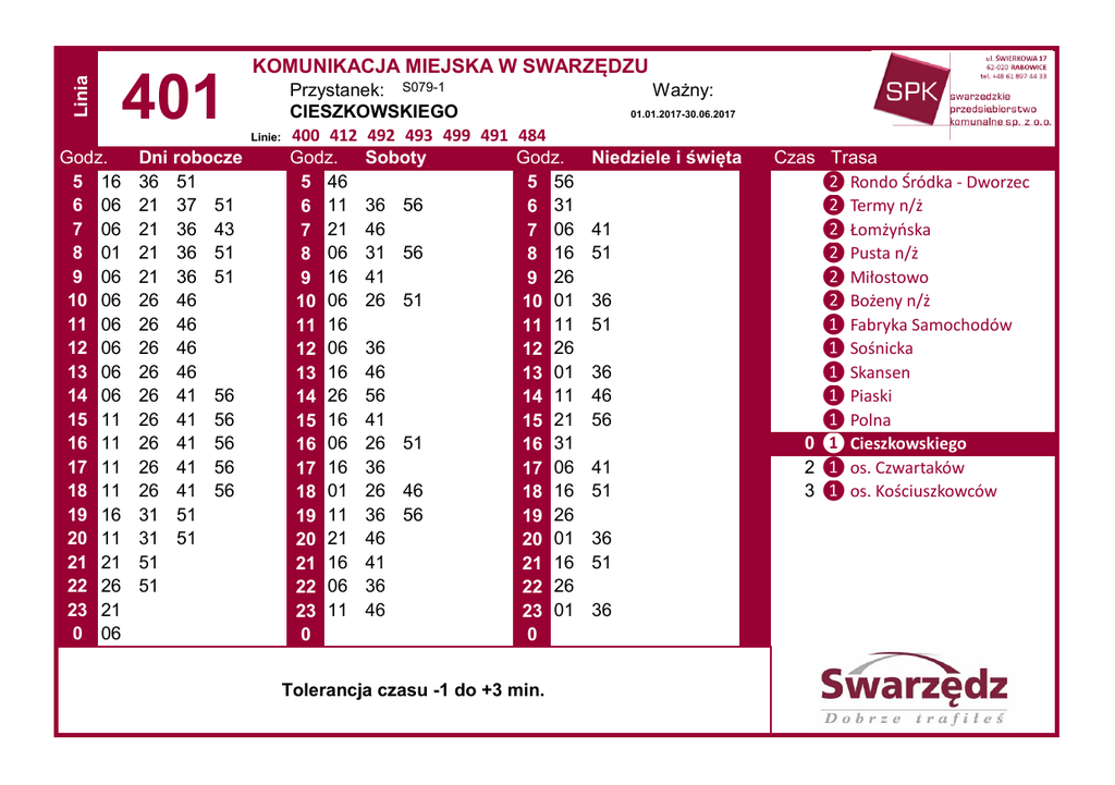 Linia 401 KOMUNIKACJA MIEJSKA W SWARZĘDZU Linie: Godz. 5 16 6 06 7 06 8 01 9 06 10 06 11 06 12 06 13 06 14 06 15 11 16 11 17 11 18 11 19 16 20 11 21 21 22 26 23 21 0 06 Dni robocze 36 51 21 37 51 21 36 43 21 36 51 21 36 51 26 46 26 46 26 46 26 46 26 41 56 26 41 56 26 41 56 26 41 56 26 41 56 31 51 31 51 51 51 Przystanek: S079-1 CIESZKOWSKIEGO 400 412 492 493 499 491 484 Godz. Soboty Godz. 5 46 5 56 6 11 36 56 6 31 7 21 46 7 06 8 06 31 56 8 16 9 16 41 9 26 06 26 51 10 10 01 11 16 11 11 12 06 36 12 26 13 16 46 13 01 14 26 56 14 11 16 41 15 15 21 16 06 26 51 16 31 17 16 36 17 06 18 01 26 46 18 16 19 11 36 56 19 26 20 21 46 20 01 16 41 21 21 16 22 06 36 22 26 23 11 46 23 01 0 0 Tolerancja czasu -1 do +3 min. Ważny: 01.01.2017-30.06.2017 Niedziele i święta 41 51 36 51 36 46 56 41 51 36 51 36 Czas Trasa ❷ Rondo Śródka - Dworzec ❷ Termy n/ż ❷ Łomżyńska ❷ Pusta n/ż ❷ Miłostowo ❷ Bożeny n/ż ❶ Fabryka Samochodów ❶ Sośnicka ❶ Skansen ❶ Piaski ❶ Polna 0 ❶ Cieszkowskiego 2 ❶ os. Czwartaków 3 ❶ os. Kościuszkowców