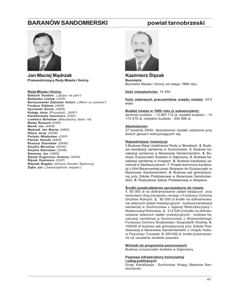 BARANÓW SANDOMIERSKI powiat tarnobrzeski Jan Maciej M¹drzak Kazimierz lêzak Rada Miasta i Gminy: Iloæ mieszkañców: 12 450 Przewodnicz¹cy Rady Miasta i Gminy Babiuch Teodora (Spójrz na jutro) Badawika Les³aw (OSP) Barszczewski Zdzis³aw Antoni (Wiem co powiem) Furdyna El¿bieta (AWS) Hynowski Zenon (AWS) Ku³aga Jerzy (Przysz³oæ 2000) Kwiatkowska Kazimiera (OSP) Lombara Boles³aw (Mieszkañcy bloku 16) Madej Ryszard (OSP) Marek Jan (AWS) M¹drzak Jan Maciej (AWS) Obara Jerzy (GKW) Partyka W³adys³aw (OSP) Pelczar Danuta (AWS) Rzeszut Stanis³aw (GKW) Smykla Miros³aw (GKW) Smykla Stanis³aw (GKW) Stawowy Jan (AWS) lêzak Eugeniusz Andrzej (GKW) lêzak Kazimierz (OSP) Wójciak Bogdan (Gminny Komitet Wyborczy) Ziêba Jan (Samorz¹dnoæ wiejska) Burmistrz Burmistrz Miasta i Gminy od lutego 1996 roku Iloæ etatowych pracowników urzêdu miasta: 34,5 etatu Bud¿et miasta w 1999 roku (z subwencjami): dochody bud¿etu 13.867.714 z³, wydatki bud¿etu 14 172 619 z³, niedobór bud¿etu - 304 896 z³. Absolutorium 27 kwietnia 2000r. absolutorium zosta³o udzielone przy dwóch g³osach wstrzymuj¹cych siê. Najwa¿niejsze inwestycje 1.Budowa Stacji Uzdatniania Wody w lezakach. 2. Budowa kanalizacji sanitarnej w Suchorzowie. 3. Budowa kanalizacji sanitarnej w Baranowie Sandomierskim. 4. Budowa Oczyszczalni cieków w D¹browicy. 5. Budowa kanalizacji sanitarnej w Knapach. 6. Budowa kanalizacji sanitarnej w Siedleszczanach. 7. Projekt techniczny kanalizacji z Woli Baranowskiej przez Skopanie do Oczyszczalni w Baranowie Sandomierskim. 8. Budowa sali gimnastycznej przy Szkole Podstawowej w Baranowie Sandomierskim. 9. Rozbudowa Szko³y Podstawowej w Skopaniu. rodki pozabud¿etowe sprowadzone do miasta 1. 50 000 z³ na dofinansowanie zadañ bie¿¹cych przy remontach dróg transportu rolnego z Funduszu Ochrony Gruntów Rolnych. 2. 80 000 z³ rodki na dofinansowanie w³asnych zadañ inwestycyjnych - budowa kanalizacji sanitarnej w Suchorzowie z Agencji Restrukturyzacji i Modernizacji Rolnictwa. 3. 212 530 z³ rodki na dofinansowanie w³asnych zadañ inwestycyjnych - budowa kanalizacji sanitarnej w Suchorzowie z Wojewódzkiego Funduszu Ochrony rodowiska i Gospodarki Wodnej. 4. 105000 z³ budowa sali gimnastycznej przy Szkole Podstawowej w Baranowie Sandomierskim z Urzêdu Kultury Fizycznej i Turystyki 5. 250 000 z³. rodki przeznaczone na usuwanie skutków powodzi. Wnioski do programów pomocowych Budowa oczyszczalni cieków w D¹browicy. Poprawa infrastruktury komunalnej i us³ug publicznych Drogi, Kanalizacja - Suchorzów, Knapy, Baranów Sandomierski. 47 Wspieranie rozwoju ma³ej i redniej przedsiêbiorczoci Tereny i obiekty przeznaczone do dzia³alnoci gospodarczej (Dymitrów Du¿y, Wola Baranowska, Knapy, Suchorzów) Problem mieszkaniowy Projekt domu socjalnego przy ul. Mickiewicza, sprzeda¿ czworaków, zwiêkszenie terenów mieszkaniowych w planie zagospodarowania przestrzennego. Pomoc spo³eczna Miejsko Gminny Orodek Pomocy Spo³ecznej w Baranowie Sandomierskim w 1999 roku udziela³ wiadczeñ dla swych podopiecznych w postaci: zasi³ków sta³ych, okresowych, rodzinnych, pielêgnacyjnych, celowych i w naturze oraz specjalnych celowych, rent socjalnych, specjalistycznych us³ug opiekuñczych, pomocy dla kombatantów, do¿ywiania. Równie¿ z inicjatywy OPS w Baranowie Sandomierskim rozpocz¹³ dzia³alnoæ Warsztat Terapii Zajêciowej dla osób niepe³nosprawnych ruchowo, który ma za zadanie przygotowaæ uczestników do ¿ycia w rodowisku. Edukacja W zwi¹zku z wdra¿an¹ reform¹ i zmianami w szkolnictwie na terenie Gminy Baranów Sandomierski w 1999r. utworzono 4 Publiczne Gimnazja w: Baranowie Sandomierskim, Skopaniu, Woli Baranowskiej i lêzakach. Gimnazjum w Skopaniu zaczê³o funkcjonowaæ w dobudowanym skrzydle szko³y. Inwestycjê tê zakoñczono w 1999r. Ukoñczona równie¿ zosta³a budowa hali sportowej w Szkole w Baranowie Sandomierskim. Wszystkie szko³y na terenie gminy tj. 7 szkó³ podstawowych w Baranowie Sandomierskim, Skopaniu, Woli Baranowskiej, lêzakach, Durdach, Knapach i D¹browicy i 4 punkty filialne w Skopaniu, Suchorzowie, Dymitrowie Du¿ym i Markach wymagaj¹ remontów. Dziêki du¿emu zaanga¿owaniu lokalnych spo³ecznoci w wiêkszoci obiektów owiatowych prowadzone s¹ remonty i modernizacje. W ostatnich latach odnowiono Szko³ê Podstawow¹ w Knapach, w 1999 roku trwa³y prace w Durdach, Woli Baranowskiej, Baranowie Sandomierskim i lêzakach. Szko³y wyposa¿ane s¹ w komputery. Czêæ sprzêtu kupowana jest przez gminê, czêæ pozyskiwana od sponsorów i instytucji. Wszystkie gimnazja bêd¹ posiadaæ pracownie internetowe zakupione przez MEN. Na terenie gminy funkcjonuj¹ przedszkola w Skopaniu, Woli Baranowskiej, lêzakach, D¹browicy i Baranowie Sandomierskim. Przedszkole w Skopaniu sprawuje opiekê nad dzieæmi przez 9 godzin dziennie i do tej placówki uczêszcza ok. 100 dzieci rocznie. Przedszkola w Woli Baranowskiej i D¹browicy to placówki o 8 godzinnym czasie pracy. Przedszkola w D¹browicy i Baranowie Sandomierskim s¹ 5-godzinne. We wszystkich szko³ach na terenie gminy nauczany jest jêzyk angielski. Z uwagi na brak lektorów naukê prowadz¹ nauczyciele z firmy z któr¹ gmina zawar³a umowê. Ochrona zdrowia W ramach opieki lekarsko pielêgniarskiej nad dzieæmi i m³odzie¿¹ szkoln¹ wykonano badania bilansowe uczniów kl.0;III;VIII. Przed badaniami przeprowadzono badania antropometryczne we wszystkich klasach. W 48 klasach bilansowych wykonano testy przesiewowe w kl. VIII pomiary RR. W rocznikach podleg³ych szczepieniom ochronnym wykonano badania lekarskie kwalifikacyjne. Na bie¿¹co prowadzono rozmowy indywidualne w ramach promocji zdrowia. W przychodniach w ramach profilaktyki zachorowañ na grypê rozpowszechniono celowoæ szczepieñ. Zaszczepiono 125 osób doros³ych i dzieci. Na bie¿¹co wykonywane s¹ szczepienia wed³ug kalendarza szczepieñ, oraz szczepienia p/ WZW (78 doros³ych i 31 dzieci). Ogó³em wykonano 4.095 szczepie