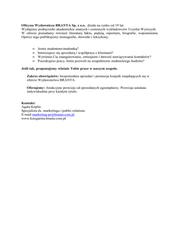 Oficyna Wydawnicza BRANTA Sp. z o.o. działa na rynku od 19 lat. Wydajemy podręczniki akademickie znanych i cenionych wykładowców Uczelni WyŜszych. W ofercie posiadamy równieŜ literaturę faktu, piękną, reportaŜe, biografie, wspomnienia. Oprócz tego publikujemy monografie, słowniki i leksykony. • • • • Jesteś studentem/studentką? Interesujesz się sprzedaŜą i współpraca z klientami? WyróŜnia Cię zaangaŜowanie, entuzjazm i łatwość nawiązywania kontaktów? Poszukujesz pracy, która pozwoli na uzupełnienie studenckiego budŜetu? Jeśli tak, proponujemy właśnie Tobie prace w naszym zespole. Zakres obowiązków: bezpośrednia sprzedaŜ i promocja ksiąŜek znajdujących się w ofercie Wydawnictwa BRANTA. Oferujemy: Atrakcyjne prowizje od sprzedanych egzemplarzy. Prowizja ustalana indywidualnie przy kaŜdym tytule. Kontakt: Agata Keplin Specjalista ds. marketingu i public relations E-mail [email protected] www.ksiegarnia.branta.com.pl