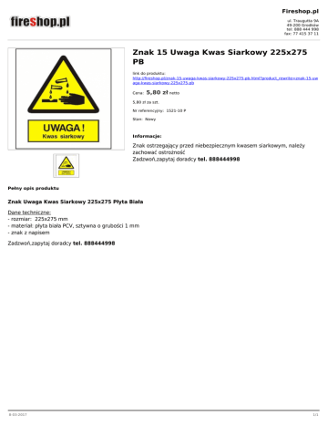 Fireshop.pl ul. Traugutta 9A 49-200 Grodków tel: 888 444 998 fax: 77 415 37 11 Znak 15 Uwaga Kwas Siarkowy 225x275 PB link do produktu: http://fireshop.pl/znak-15-uwaga-kwas-siarkowy-225x275-pb.html?product_rewrite=znak-15-uw aga-kwas-siarkowy-225x275-pb Cena: 5,80 zł netto 5,80 zł za szt. Nr referencyjny: 1521-10 P Stan: Nowy Informacje: Znak ostrzegający przed niebezpiecznym kwasem siarkowym, należy zachować ostrożność Zadzwoń,zapytaj doradcy tel. 888444998 Pełny opis produktu Znak Uwaga Kwas Siarkowy 225x275 Płyta Biała Dane techniczne: - rozmiar: 225x275 mm - materiał: płyta biała PCV, sztywna o grubości 1 mm - znak z napisem Zadzwoń,zapytaj doradcy tel. 888444998 8-03-2017 1/1