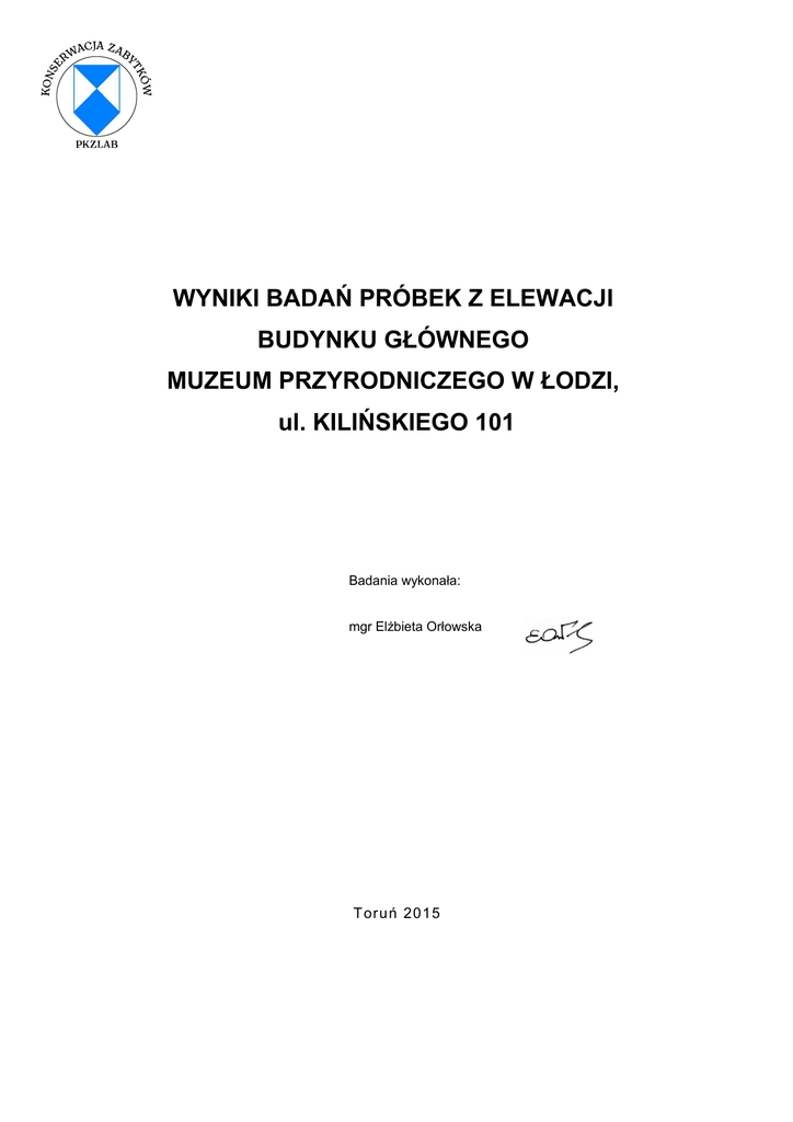 WYNIKI BADAŃ PRÓBEK Z ELEWACJI BUDYNKU GŁÓWNEGO