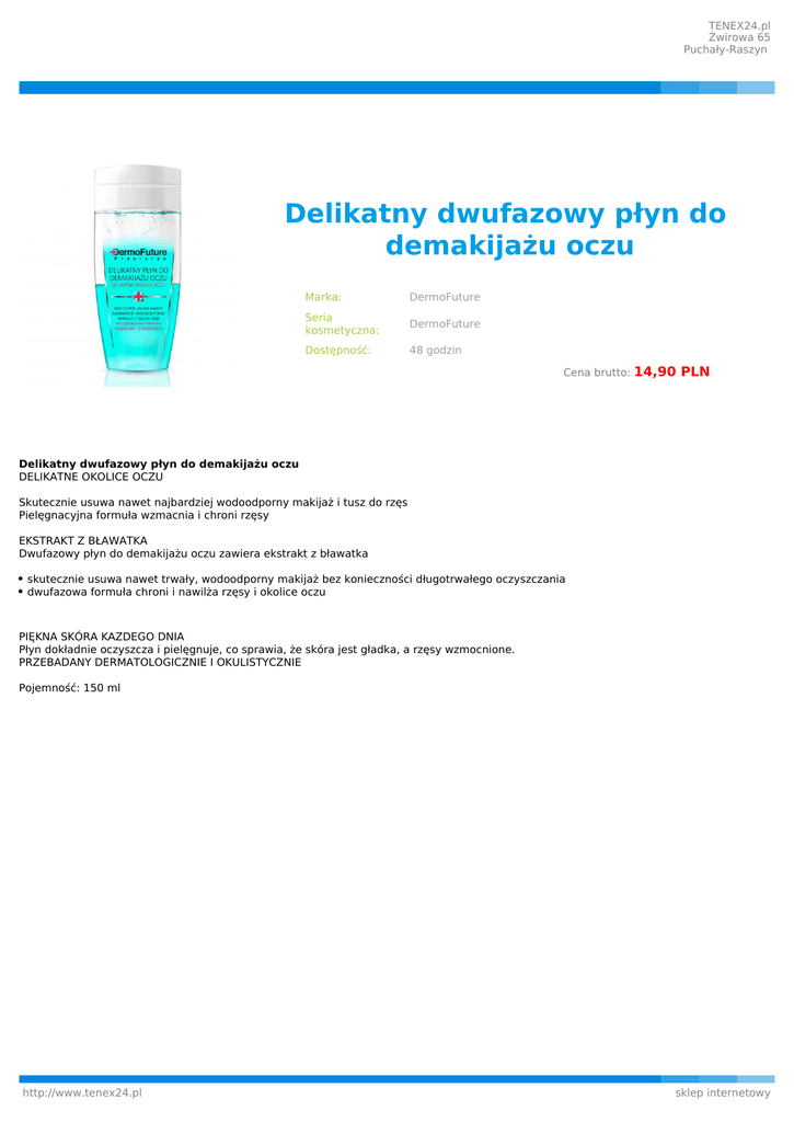 TENEX24.pl Żwirowa 65 Puchały-Raszyn Delikatny dwufazowy płyn do demakijażu oczu Marka: DermoFuture Seria kosmetyczna: DermoFuture Dostępność: 48 godzin Cena brutto: 14,90 PLN Delikatny dwufazowy płyn do demakijażu oczu DELIKATNE OKOLICE OCZU Skutecznie usuwa nawet najbardziej wodoodporny makijaż i tusz do rzęs Pielęgnacyjna formuła wzmacnia i chroni rzęsy EKSTRAKT Z BŁAWATKA Dwufazowy płyn do demakijażu oczu zawiera ekstrakt z bławatka skutecznie usuwa nawet trwały, wodoodporny makijaż bez konieczności długotrwałego oczyszczania dwufazowa formuła chroni i nawilża rzęsy i okolice oczu PIĘKNA SKÓRA KAZDEGO DNIA Płyn dokładnie oczyszcza i pielęgnuje, co sprawia, że skóra jest gładka, a rzęsy wzmocnione. PRZEBADANY DERMATOLOGICZNIE I OKULISTYCZNIE Pojemność: 150 ml http://www.tenex24.pl sklep internetowy
